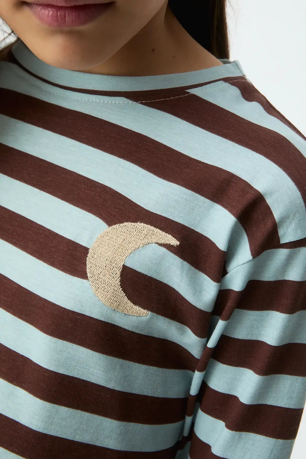 Maglietta da bambina a righe blu e marroni con dettaglio a mezzaluna