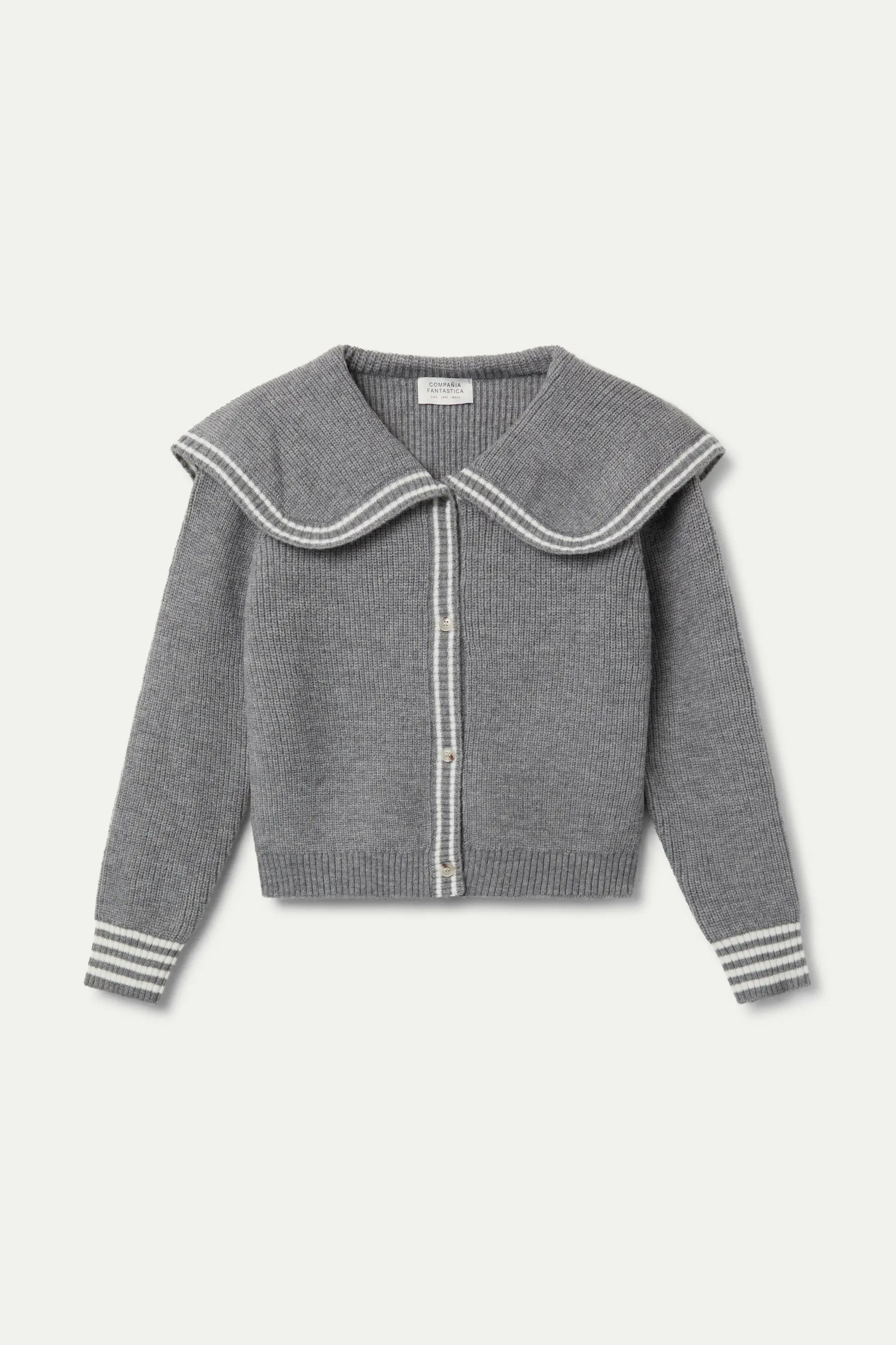 Cardigan in maglia grigia morbida con scollo rotondo e maniche lunghe. Rifiniture nere a contrasto. Chiusura frontale con bottoni e finiture a coste. La modella è alta 178 cm e indossa una taglia S.