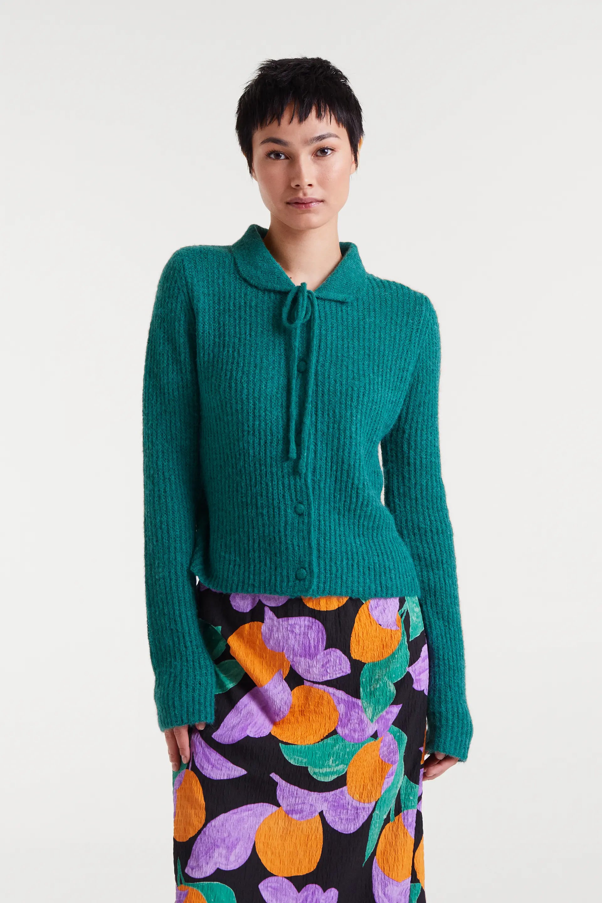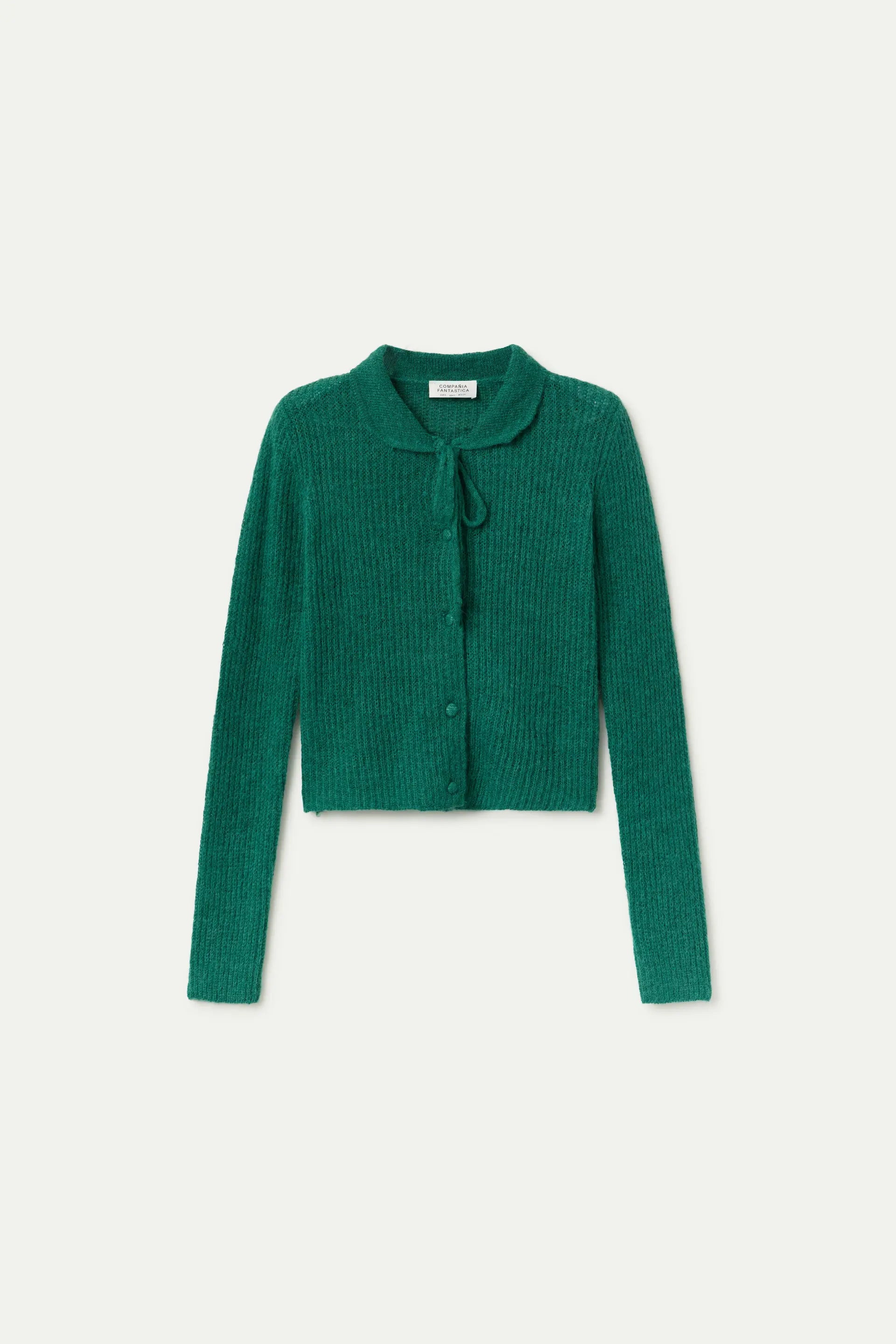 Cardigan in maglia turchese. Scollo rotondo con pettorina e fiocco. Maniche lunghe e chiusura frontale con bottoni. La modella è alta 177 cm e indossa una taglia S.