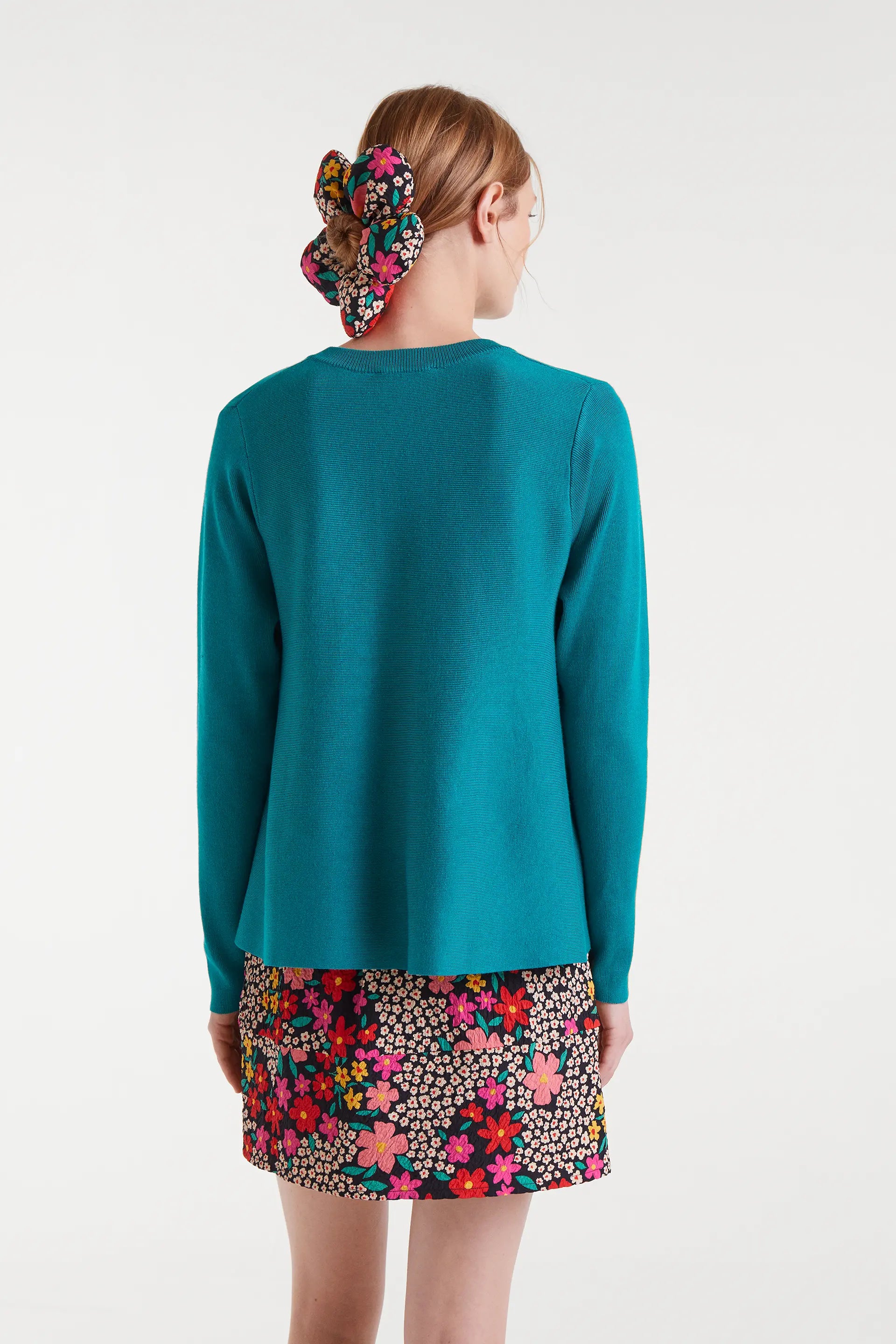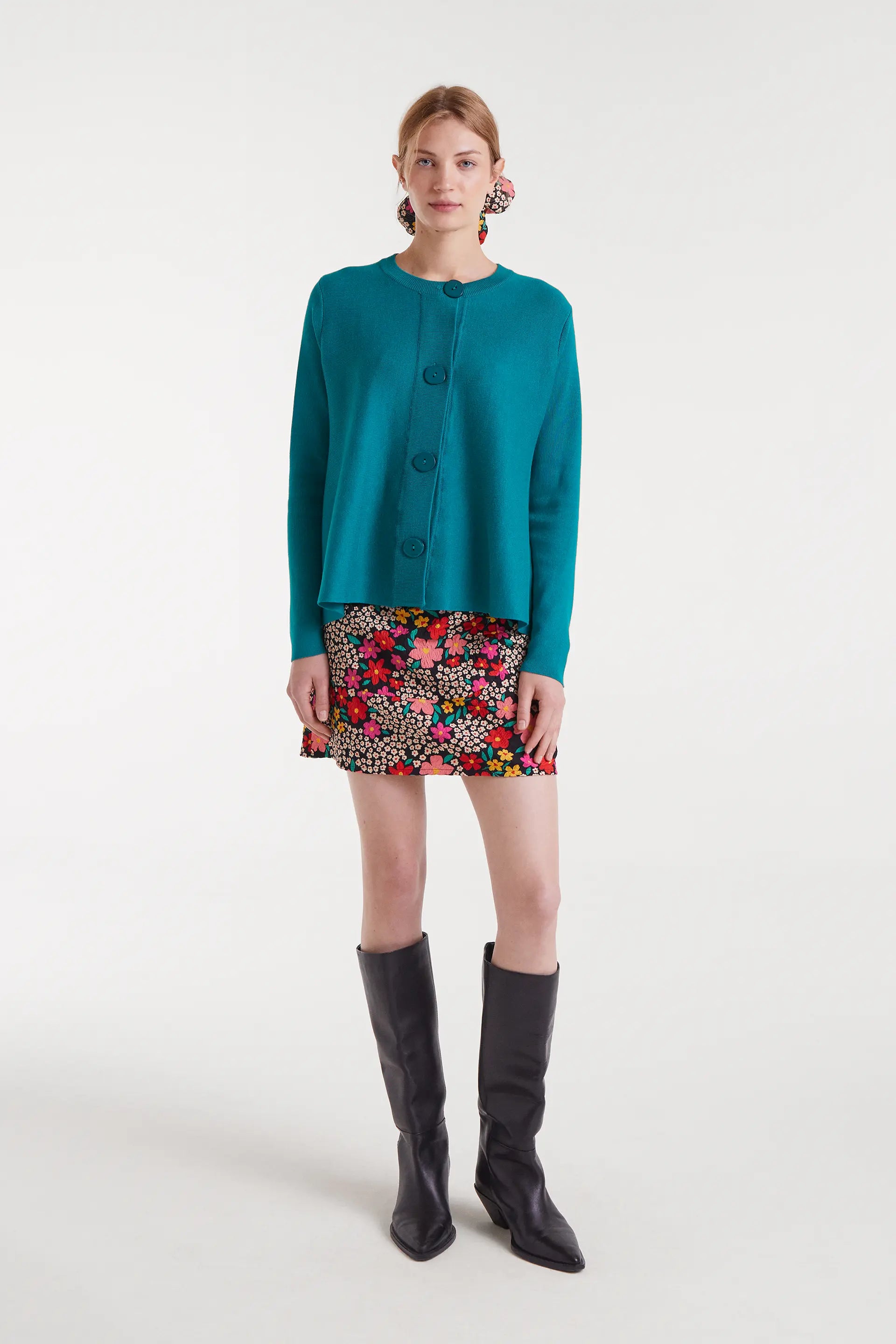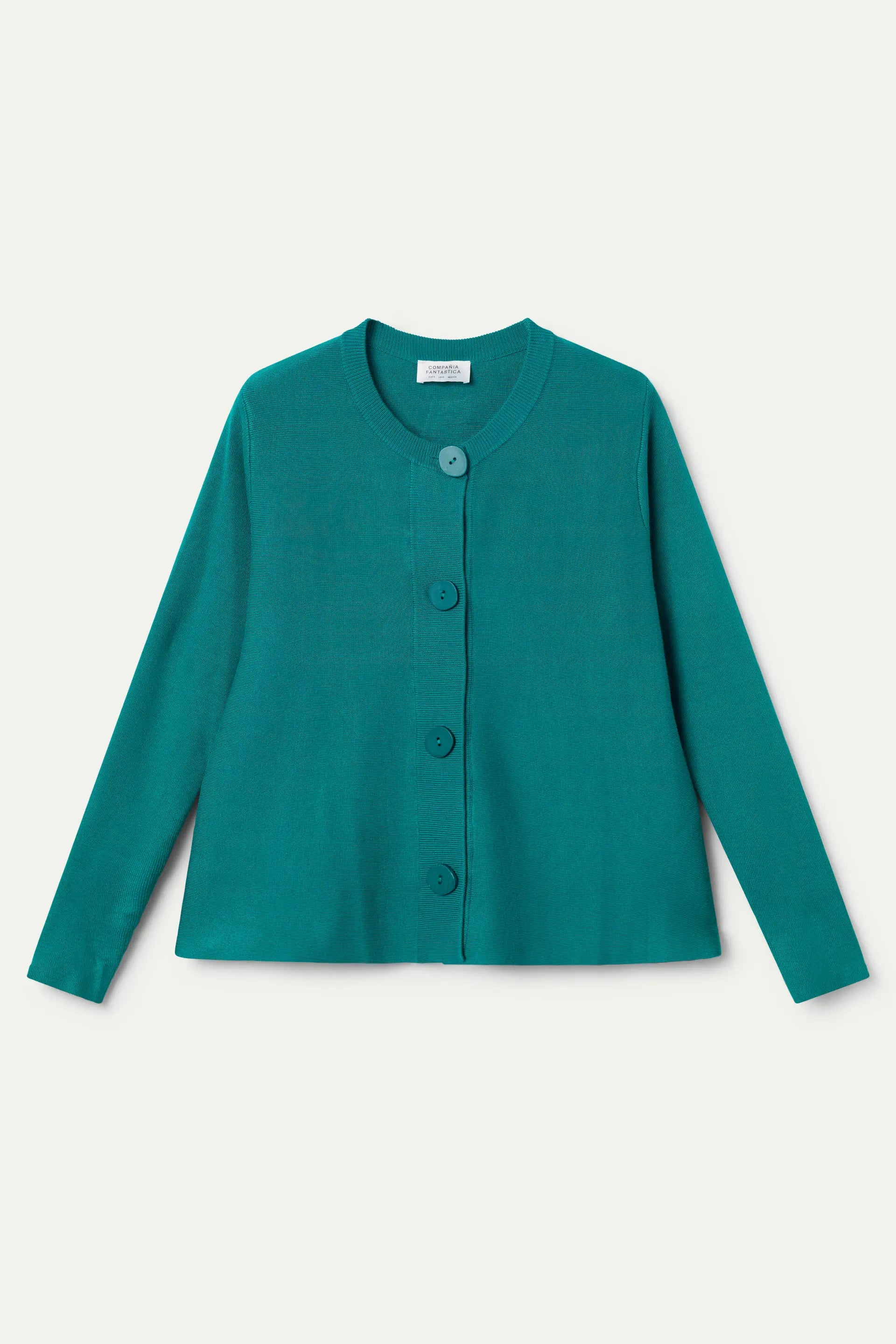 Cardigan verde in maglia a trapezio con scollo rotondo e maniche lunghe. Chiusura frontale con grandi bottoni verdi. La modella è alta 179 cm e indossa una taglia S.