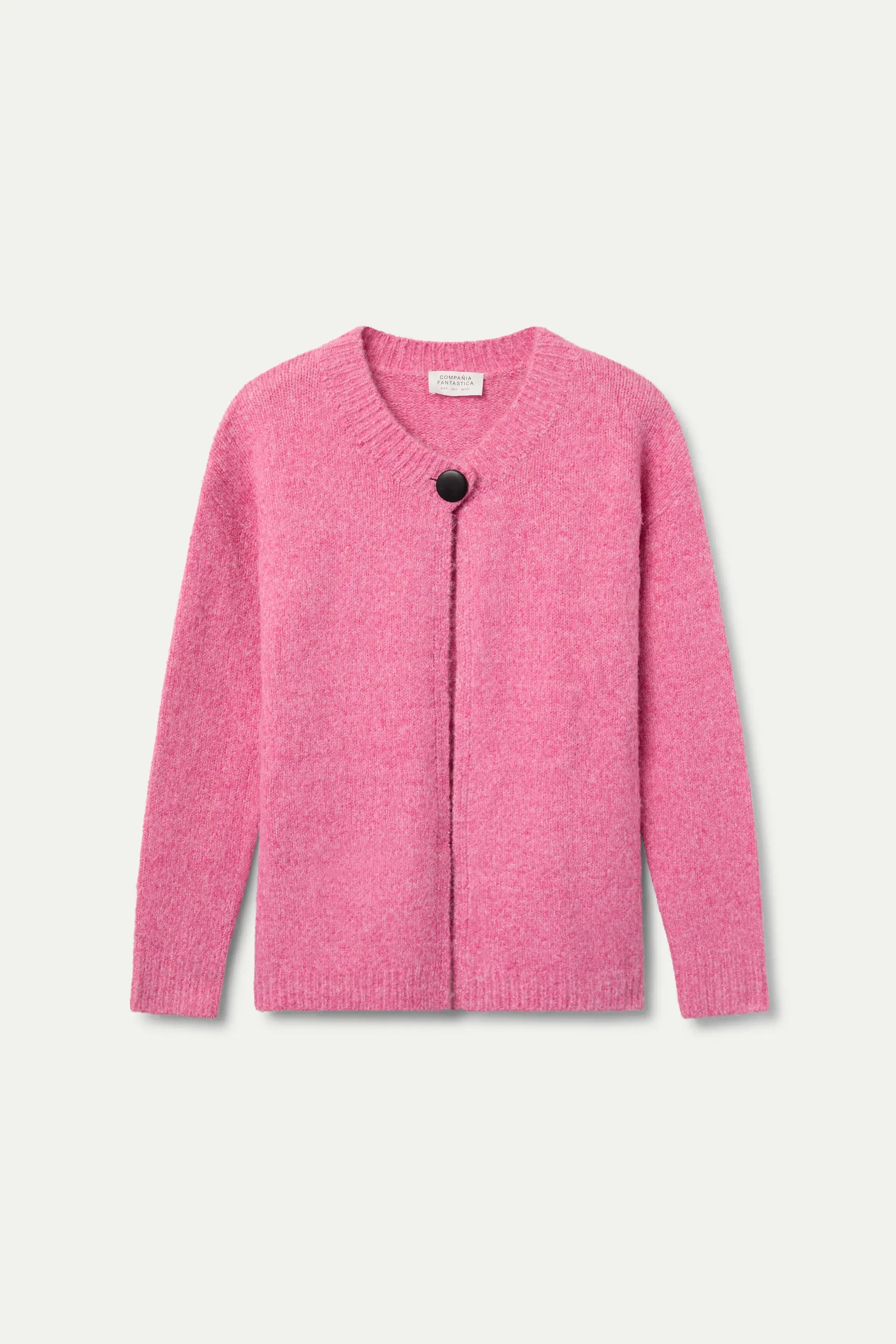 Cardigan rosa in maglia fine con scollo rotondo e maniche lunghe. Spalle leggermente scese. Chiusura frontale con bottoni. Dettagli a coste. La modella è alta 175 cm e indossa una taglia S.