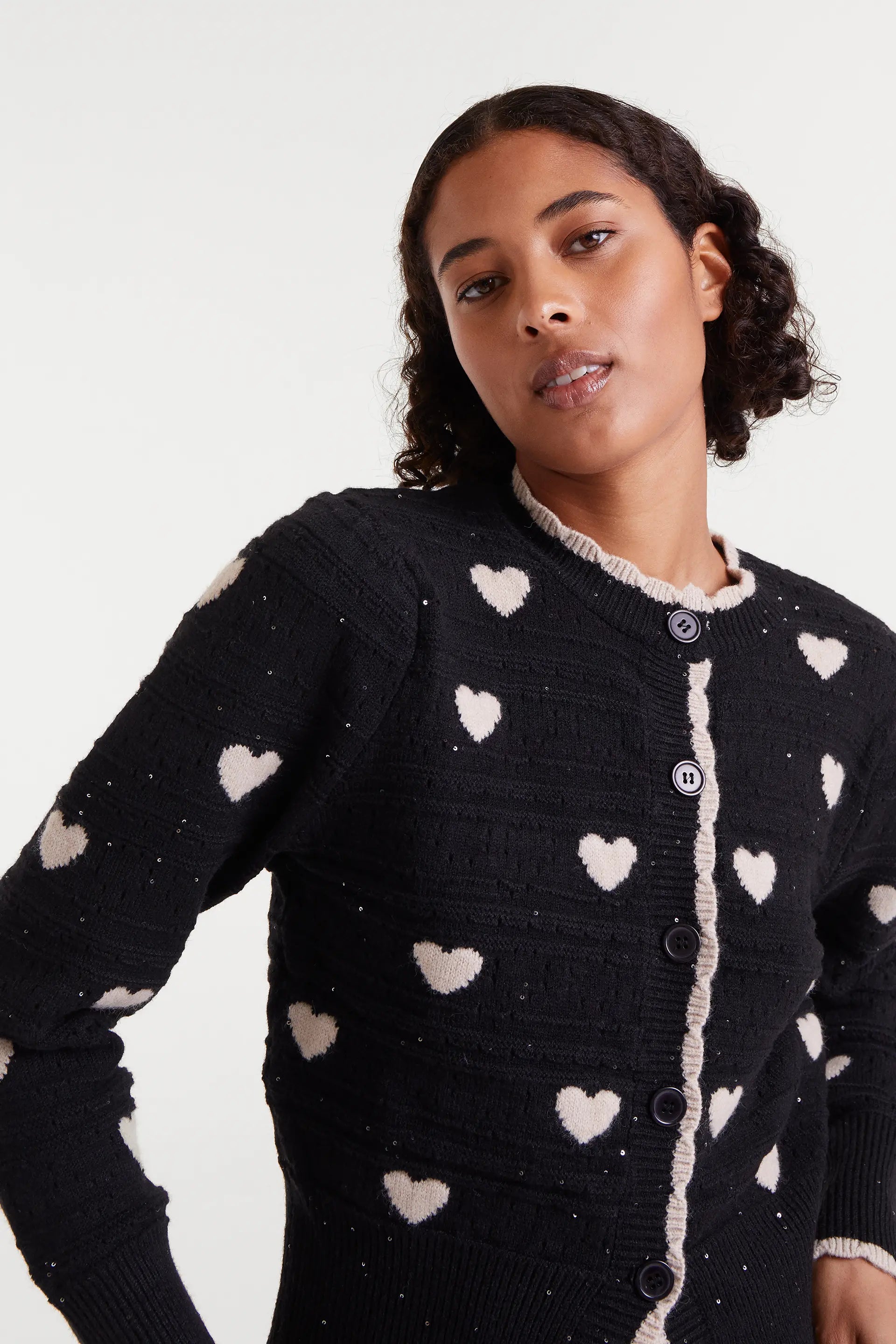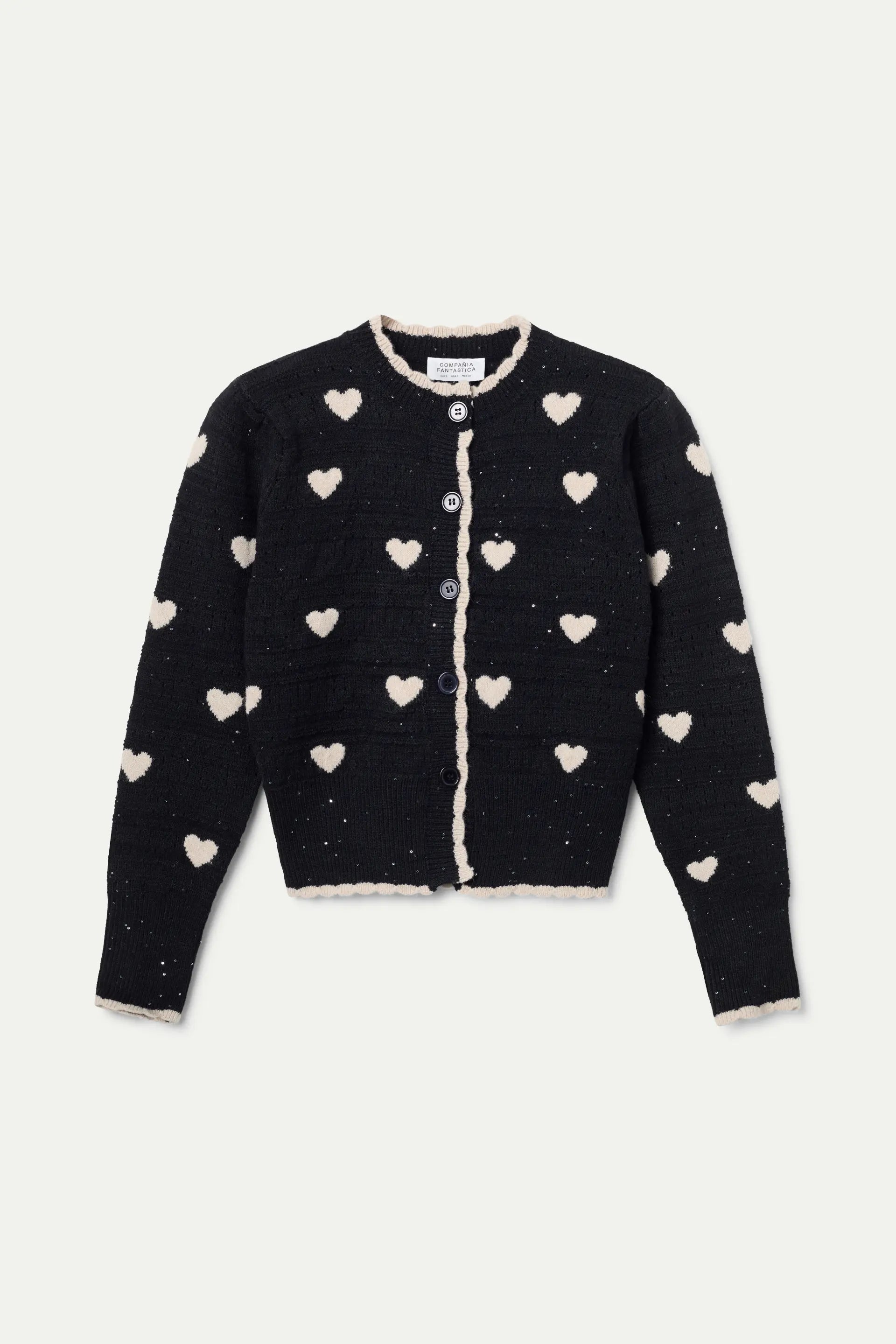 Cardigan jacquard con stampa White Hearts. Scollo rotondo e maniche lunghe a sbuffo. Chiusura frontale con bottoni. Dettagli a coste. La modella è alta 175 cm e indossa una taglia S.