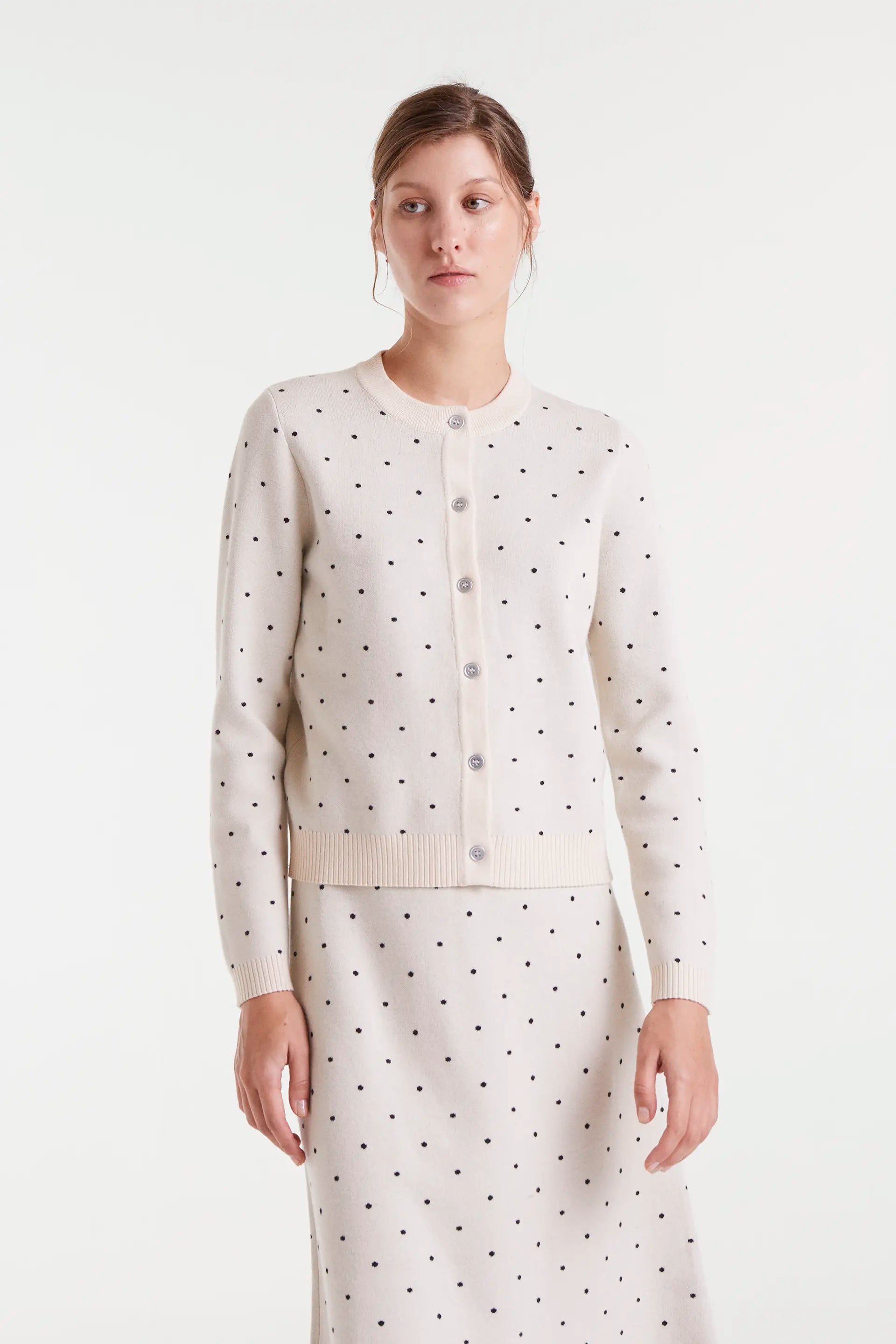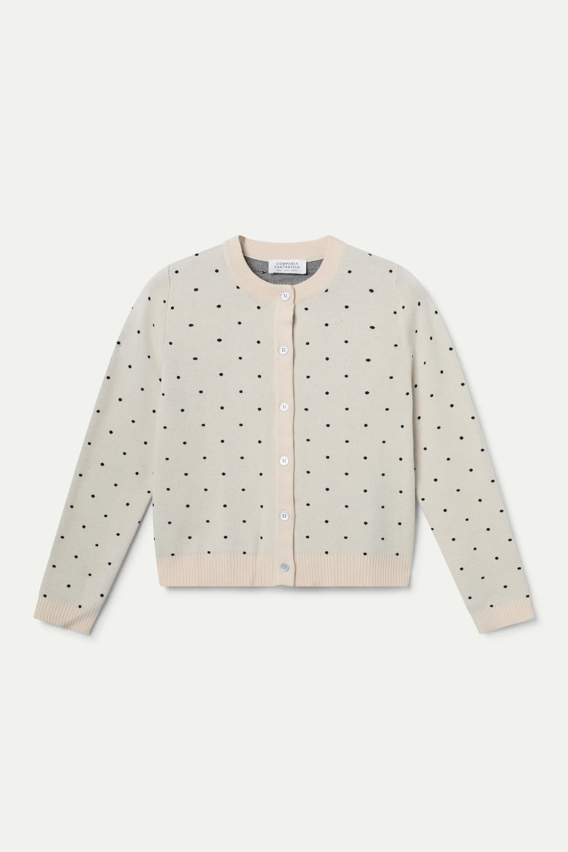 Mini cardigan bianco in jacquard a pois. Scollo rotondo e maniche lunghe. Chiusura con bottoni metallici sul davanti. La modella è alta 177 cm e indossa una taglia S.