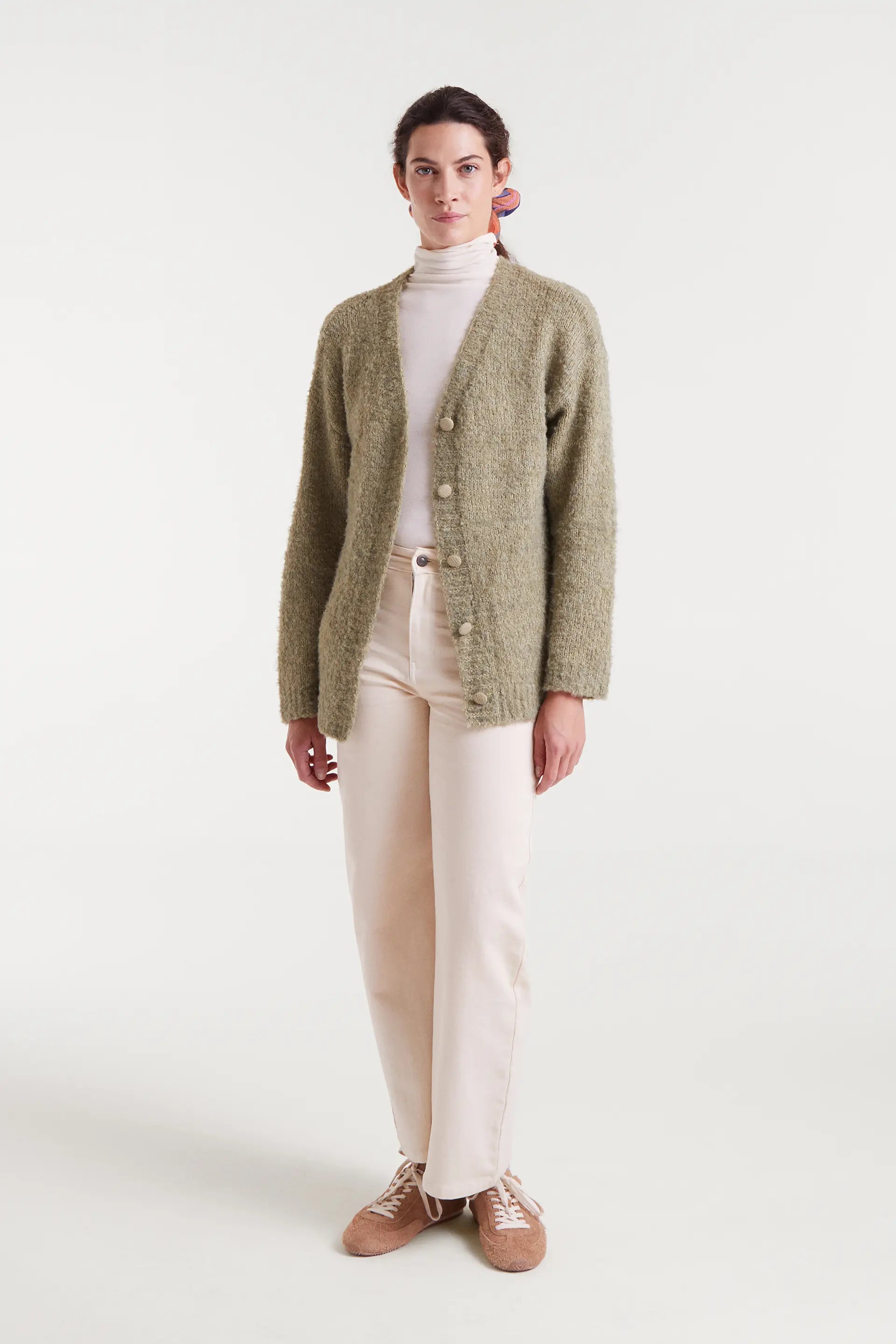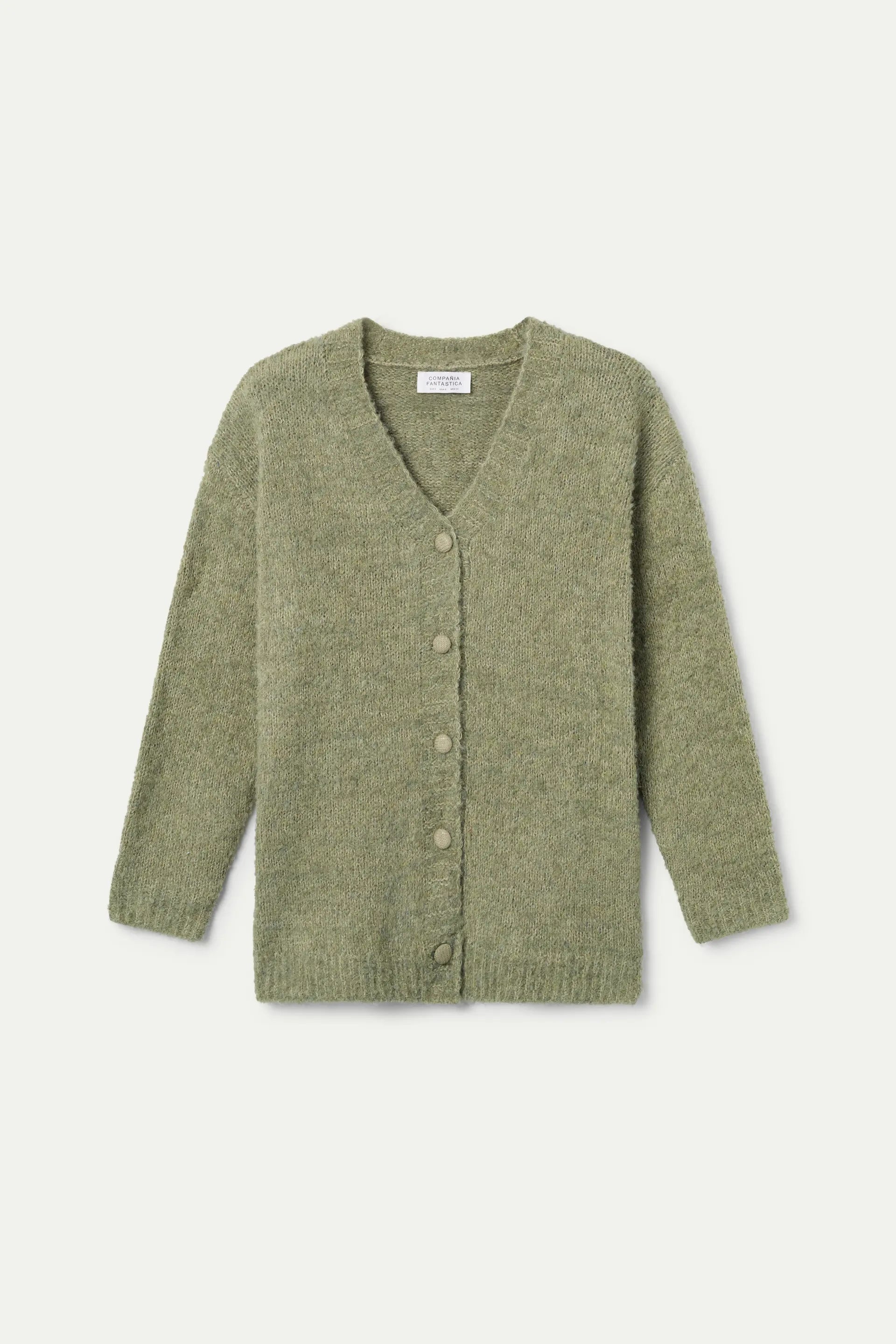 Giacca lunga verde testurizzata con scollo a V e maniche lunghe con spalle leggermente scese. Chiusura con bottoni ricoperti sul davanti. La modella è alta 177 cm e indossa una taglia S.