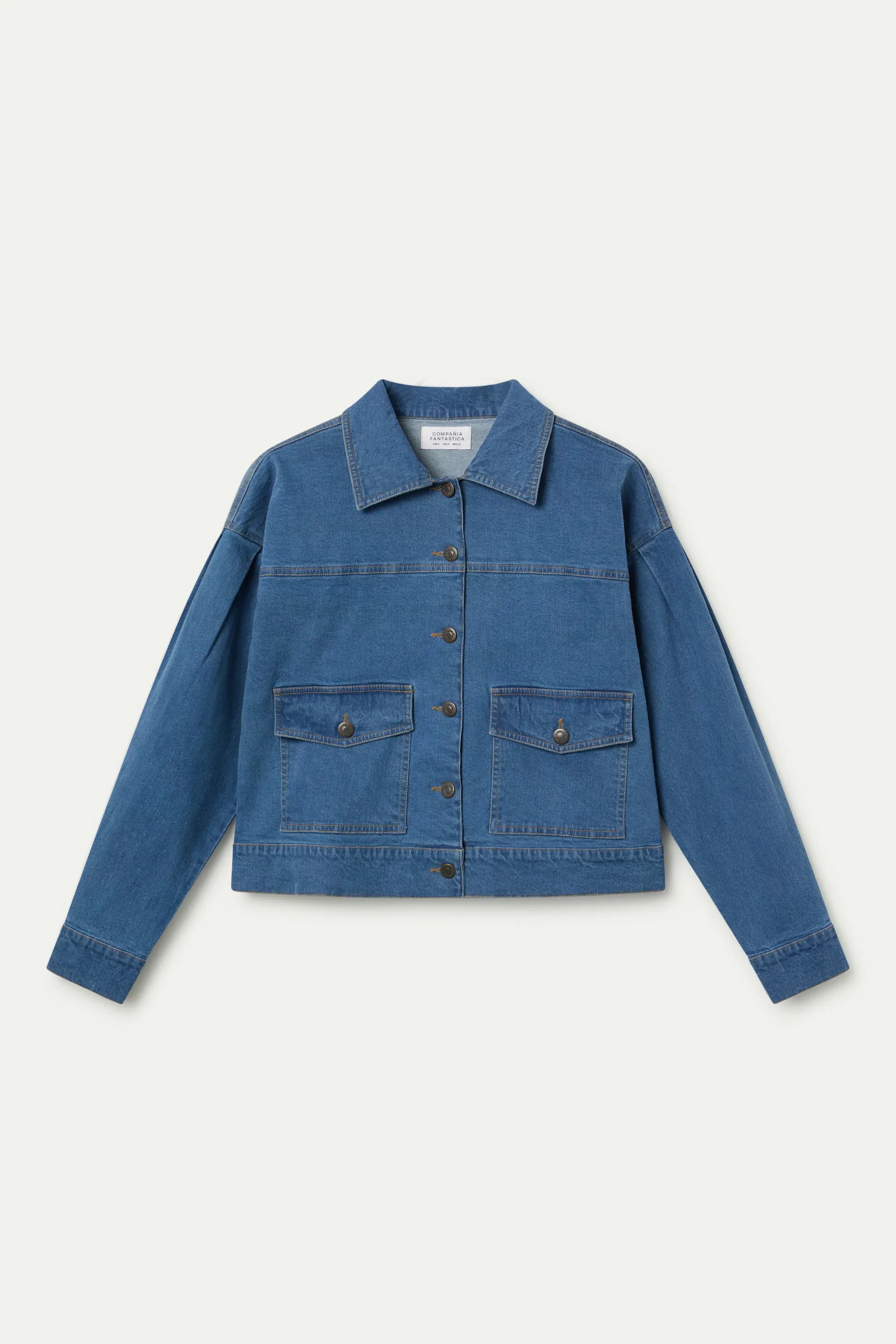 Giacca in denim blu con tessuto denim elasticizzato. Presenta collo a revers e maniche lunghe con polsini abbottonati. Spalle leggermente scese. Tasche anteriori con patta e bottoni. La modella è alta 177 cm e indossa una taglia S.
