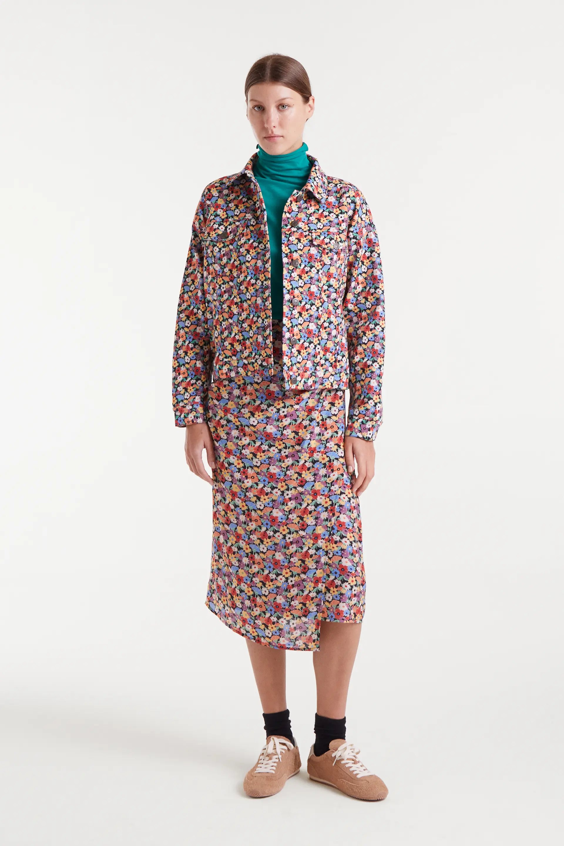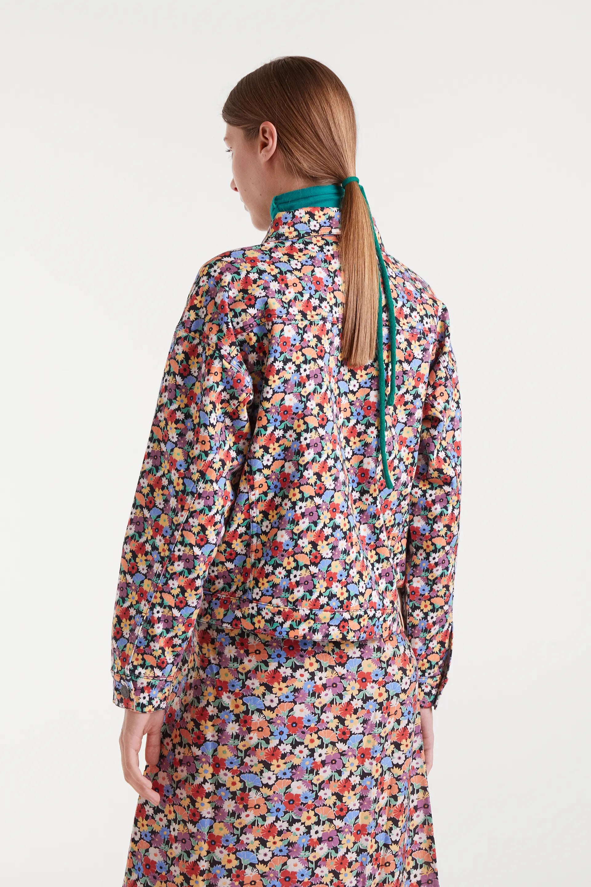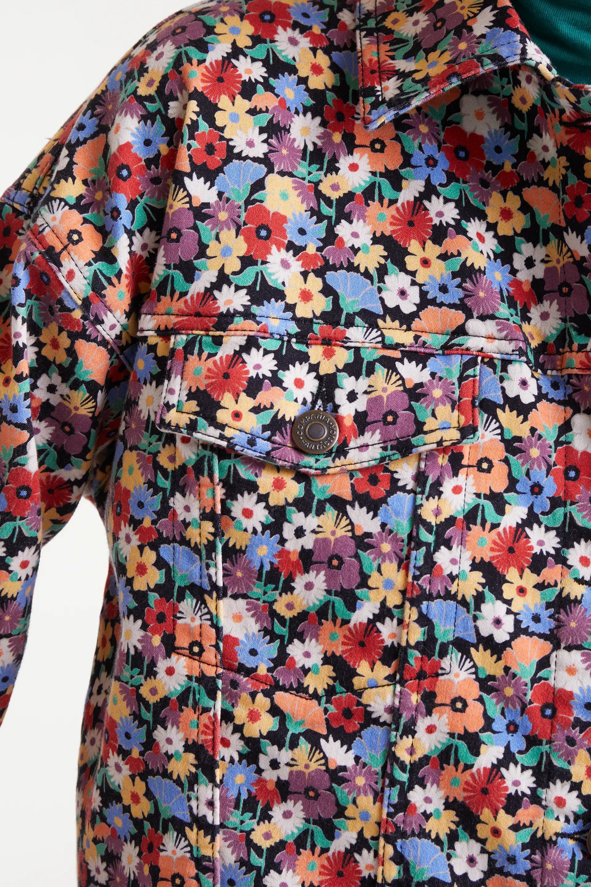 Giacca in denim elasticizzato con stampa Hampton Small. Presenta collo a revers e maniche lunghe con polsini abbottonati. Spalle leggermente scese. Tasche anteriori con patta e bottoni. La modella è alta 177 cm e indossa una taglia S.