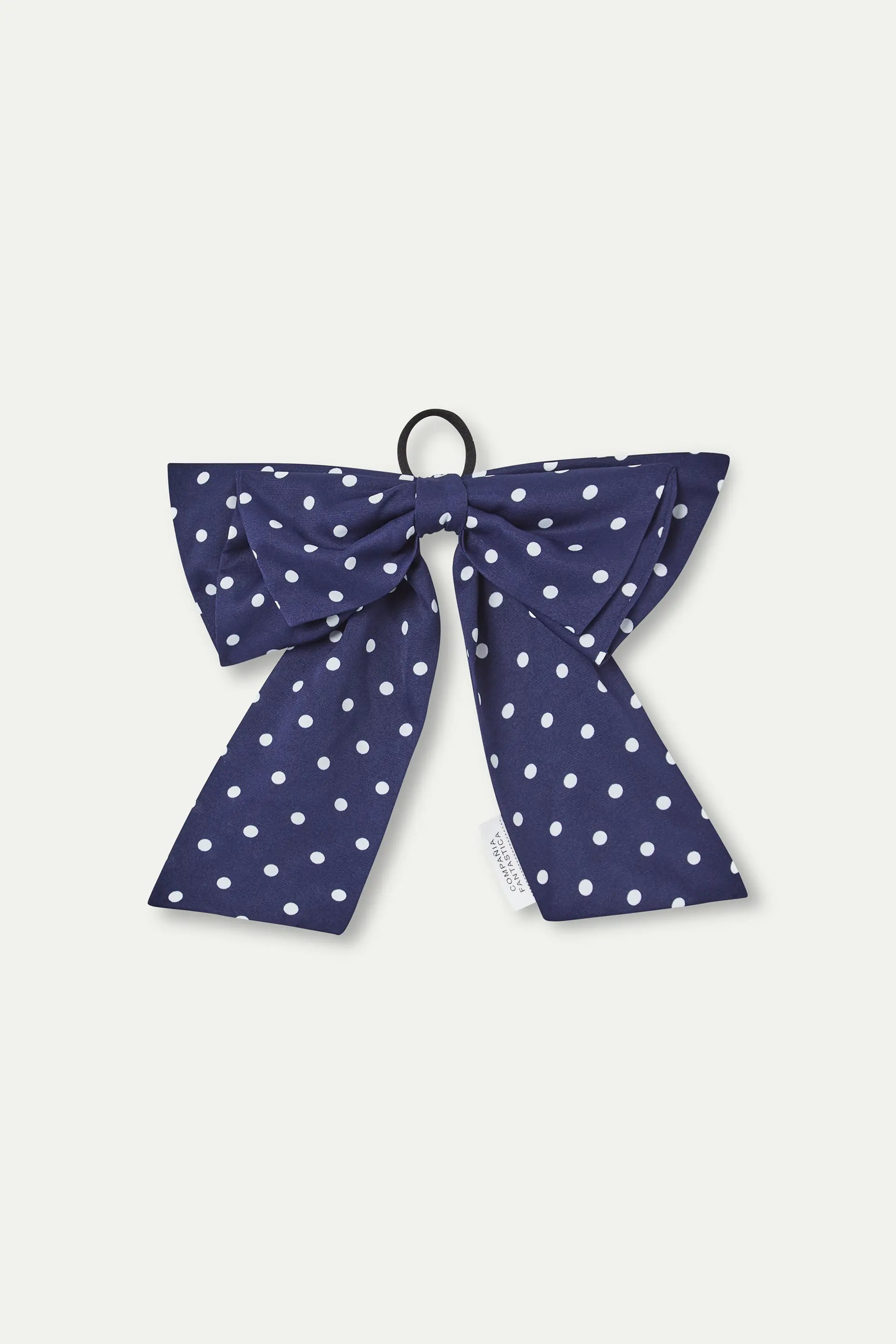Elastico per capelli in tessuto crepe con fiocco blu e stampa a mini pois bianchi.