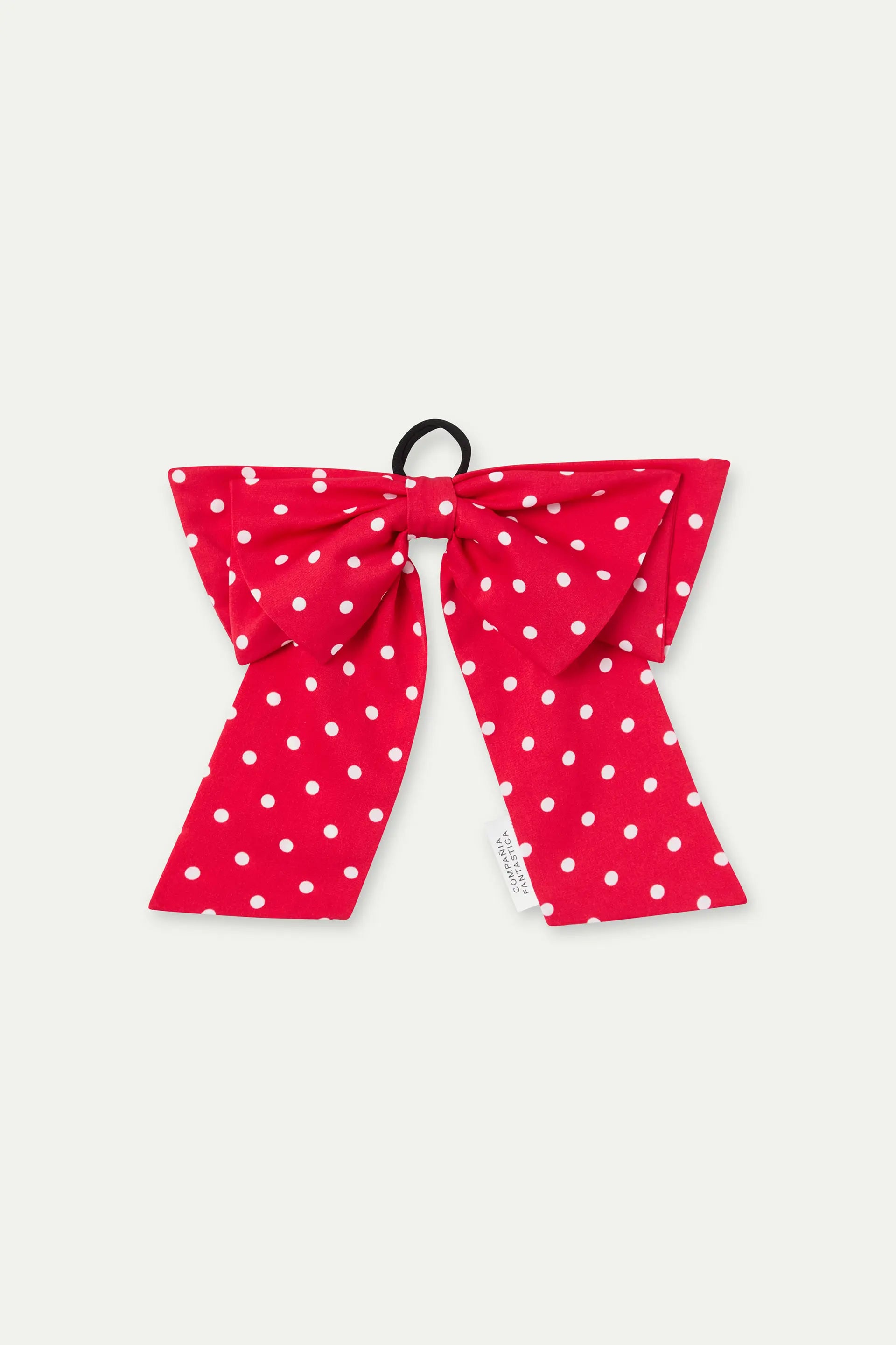 Elastico per capelli in tessuto crepe rosso con stampa a mini pois bianchi.