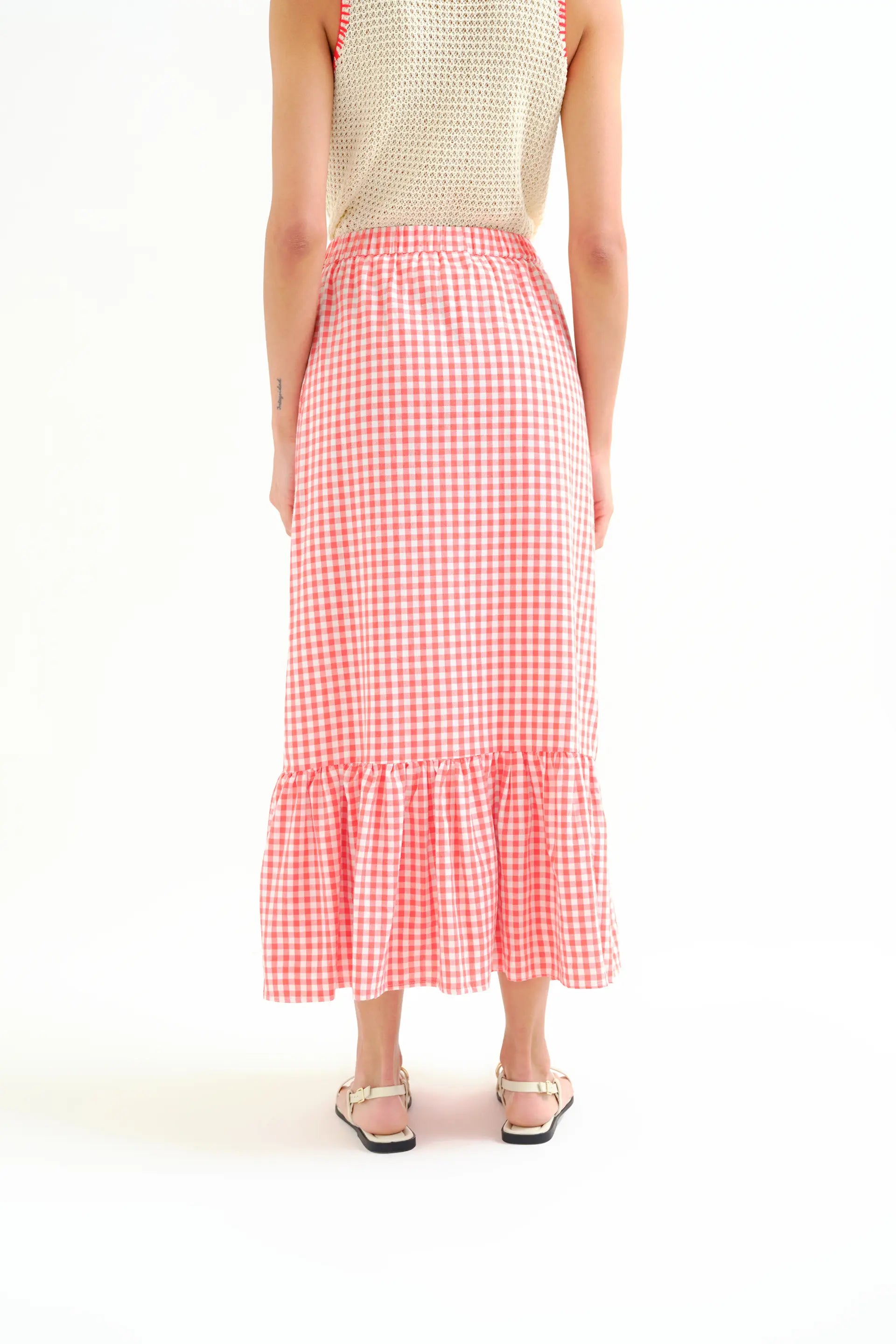 Gonna a quadretti rossi realizzata in 100% cotone. Elastico in vita alta. Gonna svasata. Tasche laterali. La modella è alta 175 cm e indossa una taglia S.