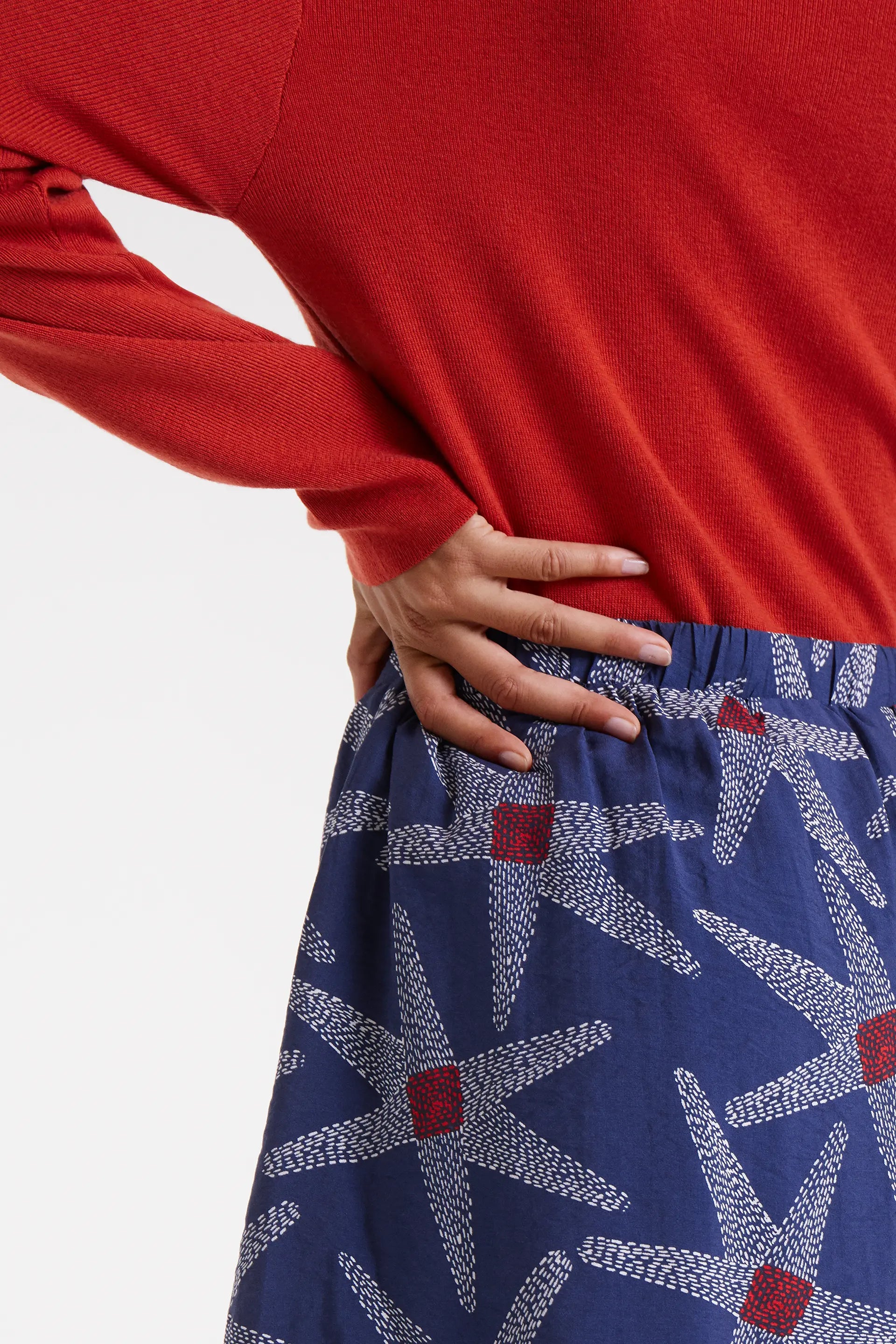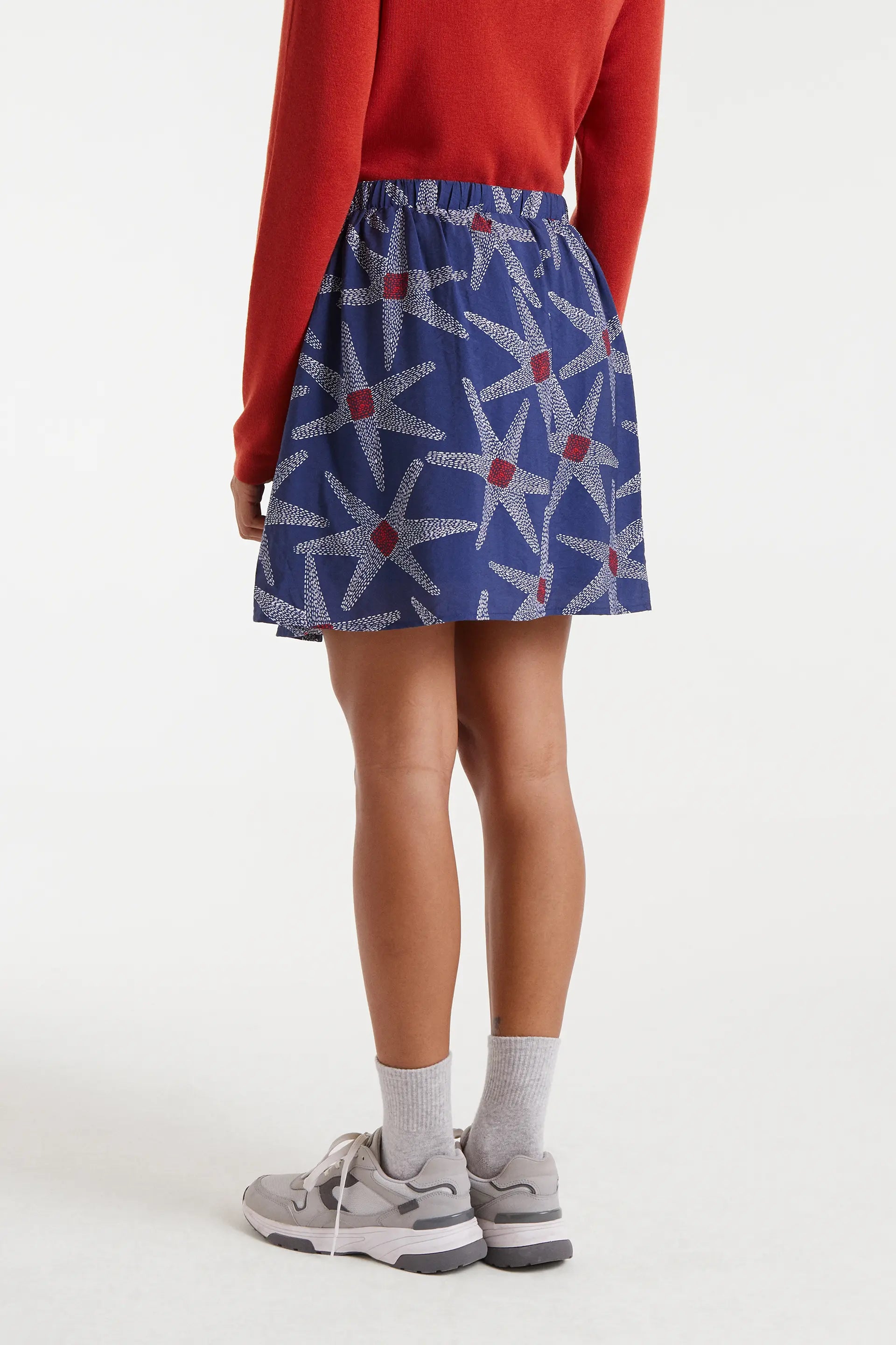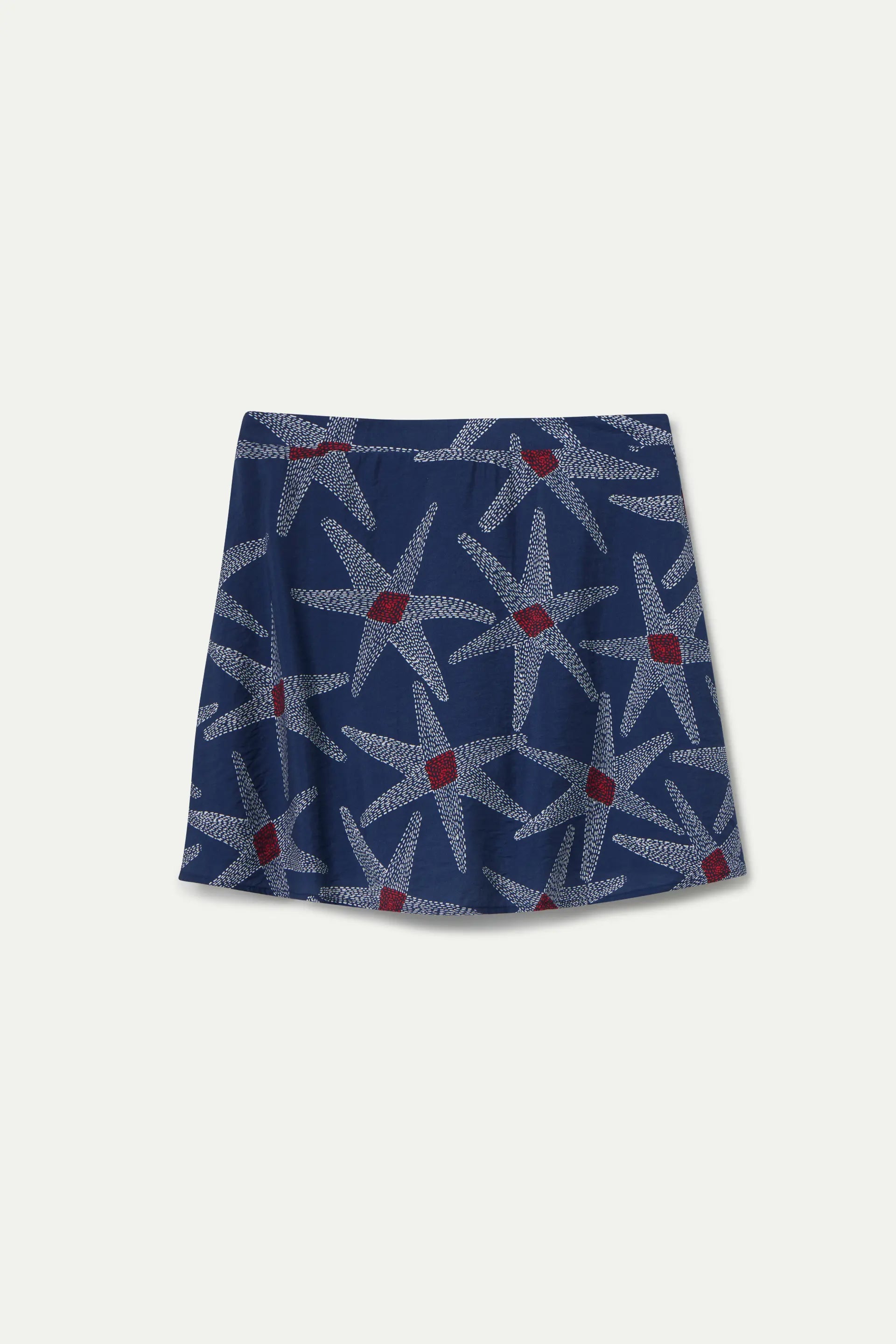 Gonna corta in tessuto crêpe leggero con stampa Starship. Vita alta e fissa. Chiusura con zip laterale invisibile. Foderata. La modella è alta 175 cm e indossa una taglia S.