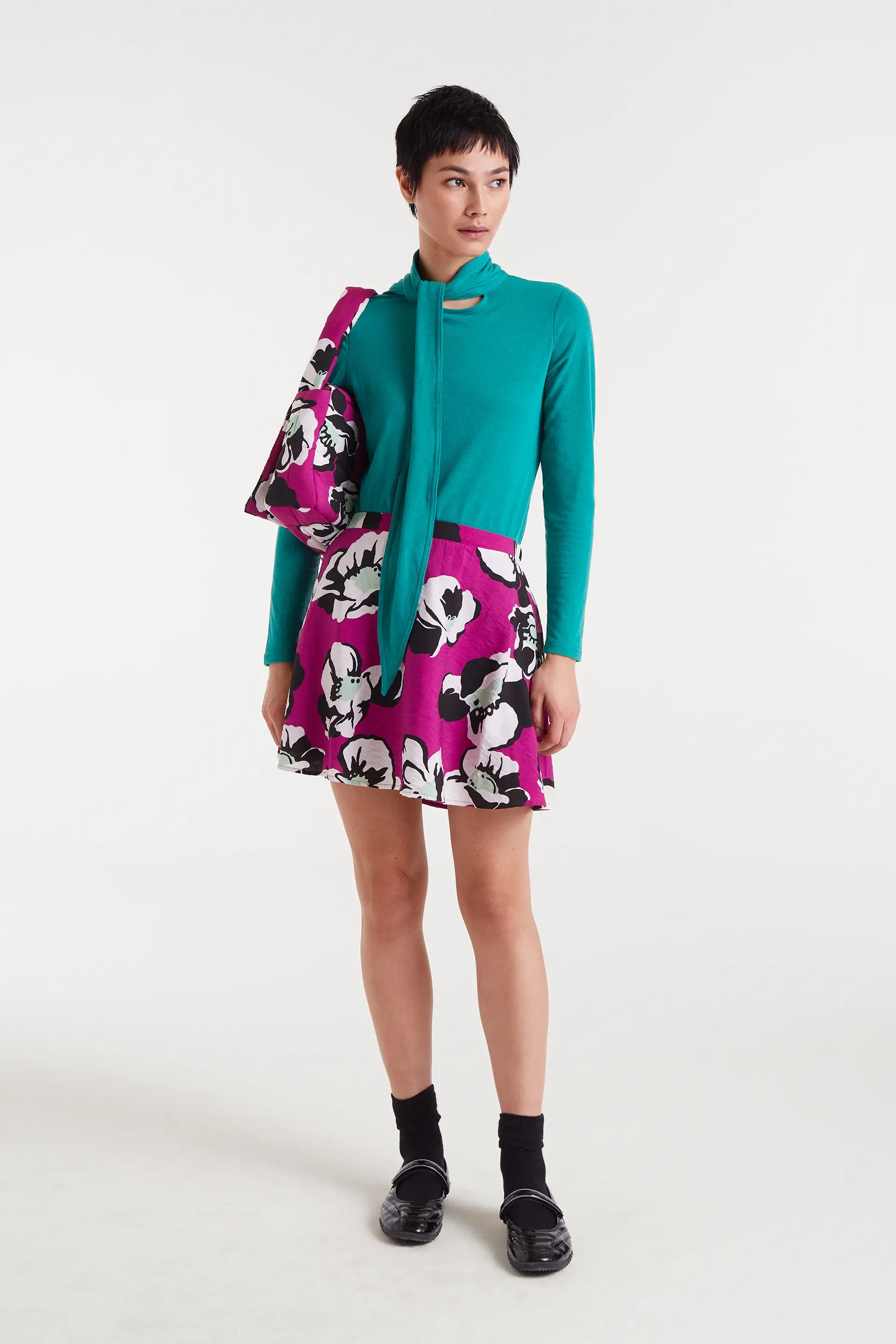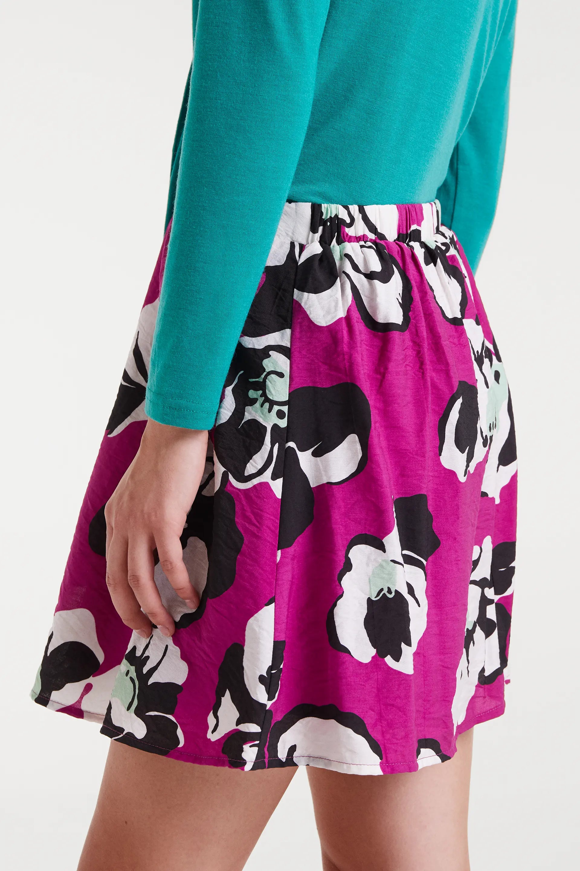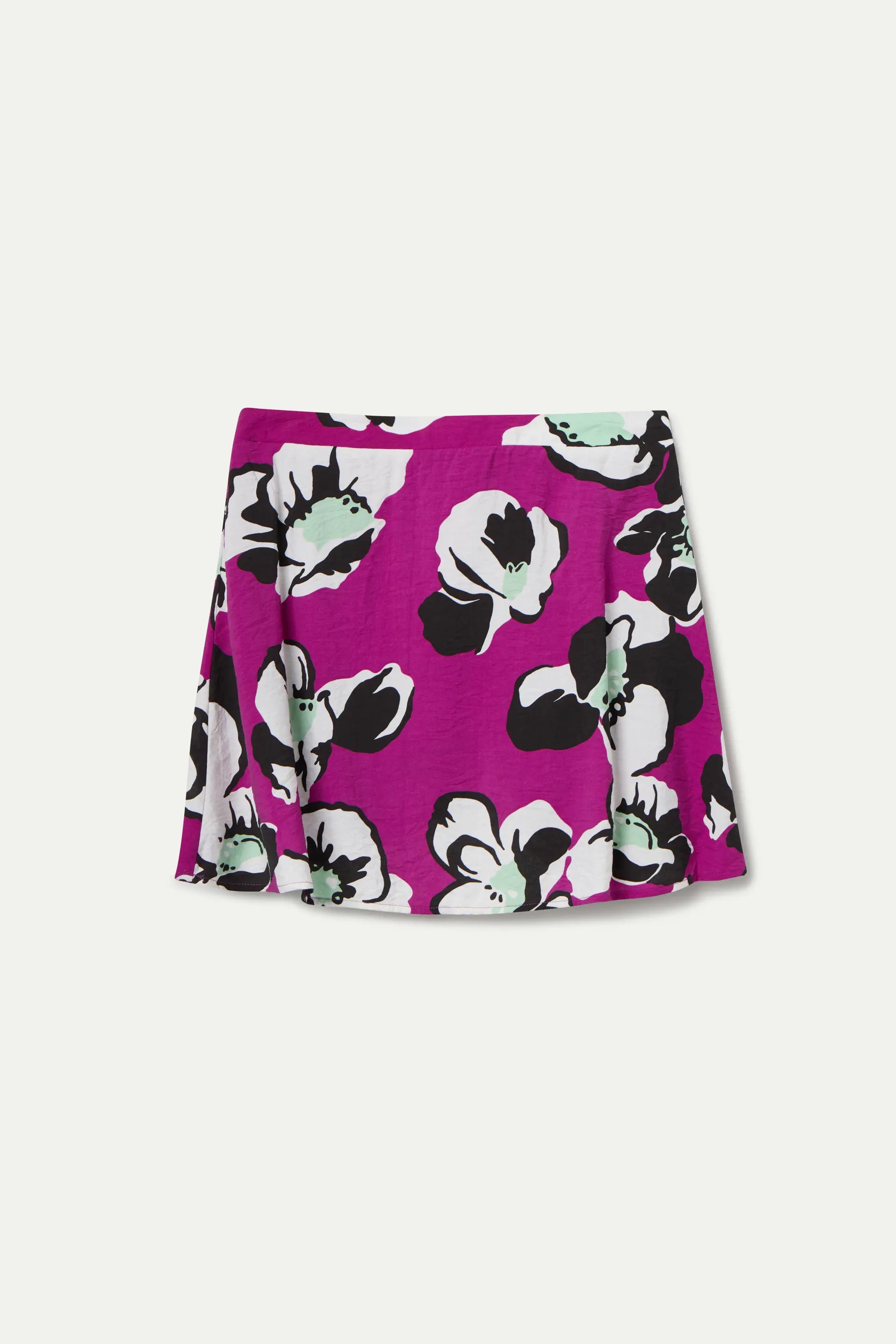 Gonna corta in tessuto crêpe leggero con stampa Vivid Viola. Vita alta, fissa. Chiusura con zip laterale invisibile. Foderata. La modella è alta 177 cm e indossa una taglia S.