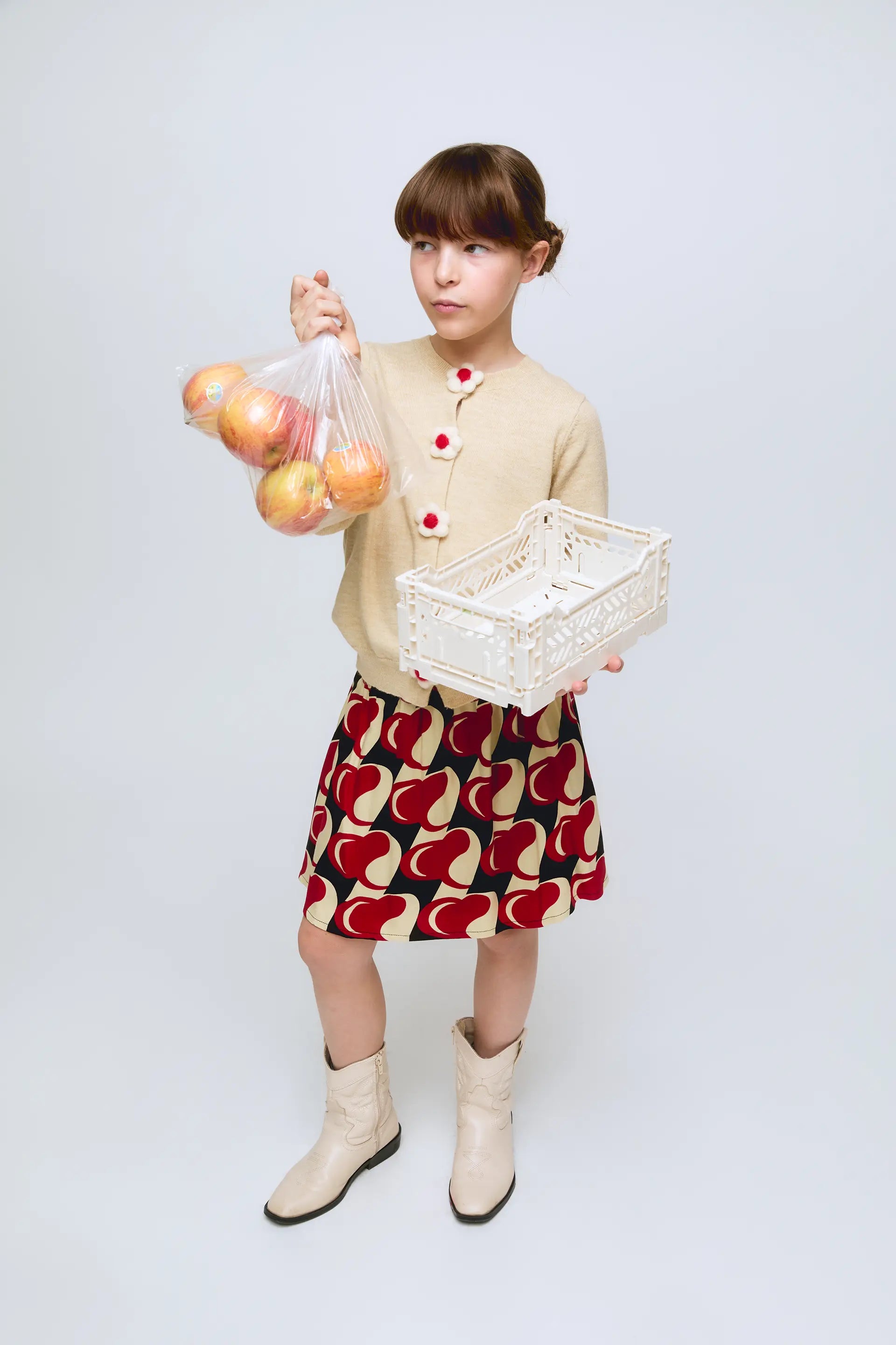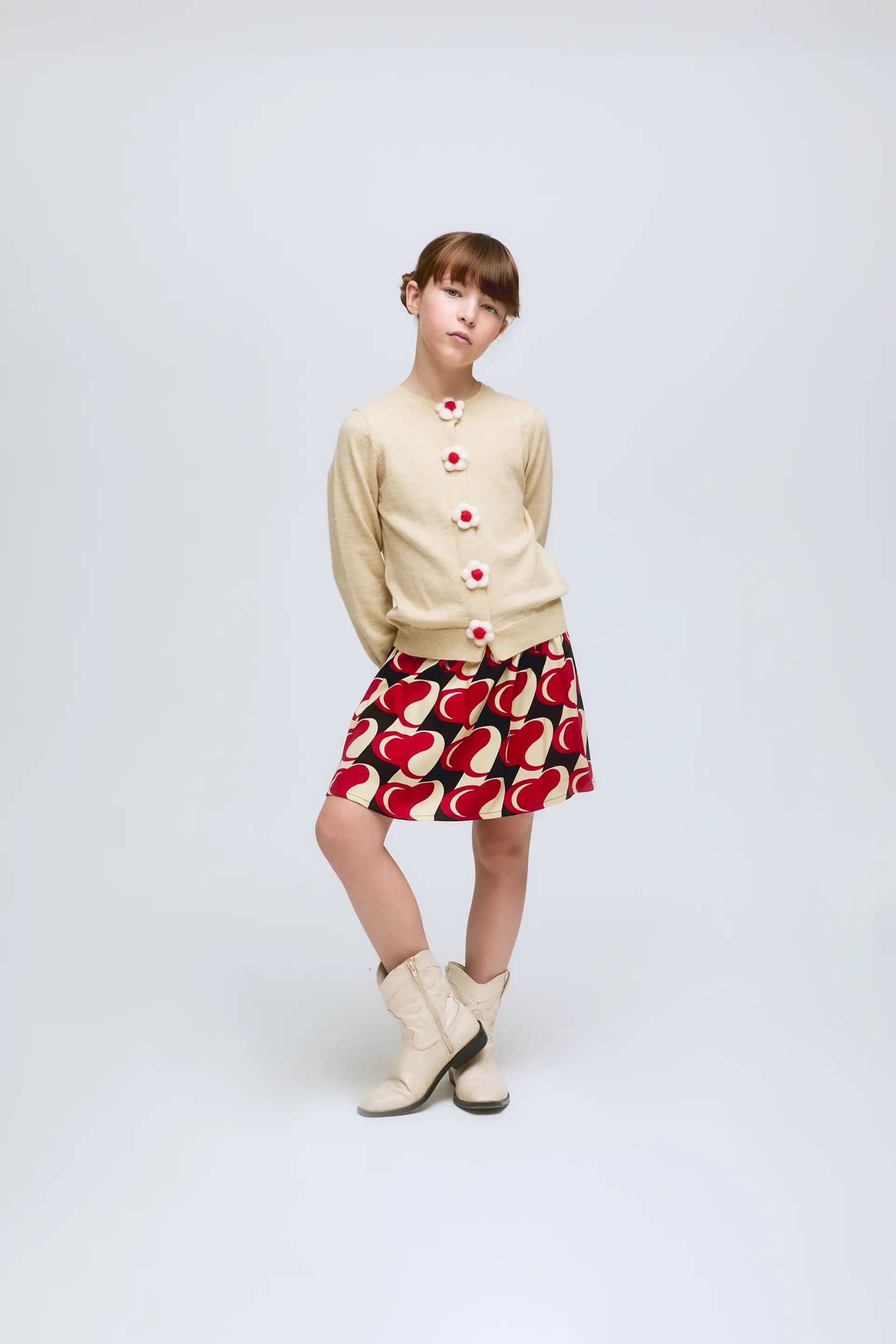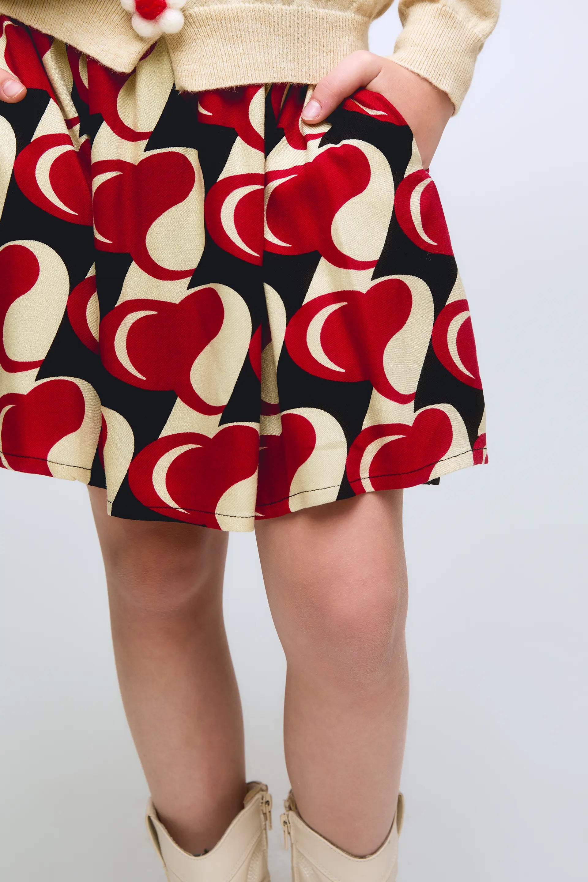 Gonna corta da bambina con stampa grafica Heart Attack di cuori rossi su sfondo bianco e nero. Elastico in vita con dettaglio arricciato.