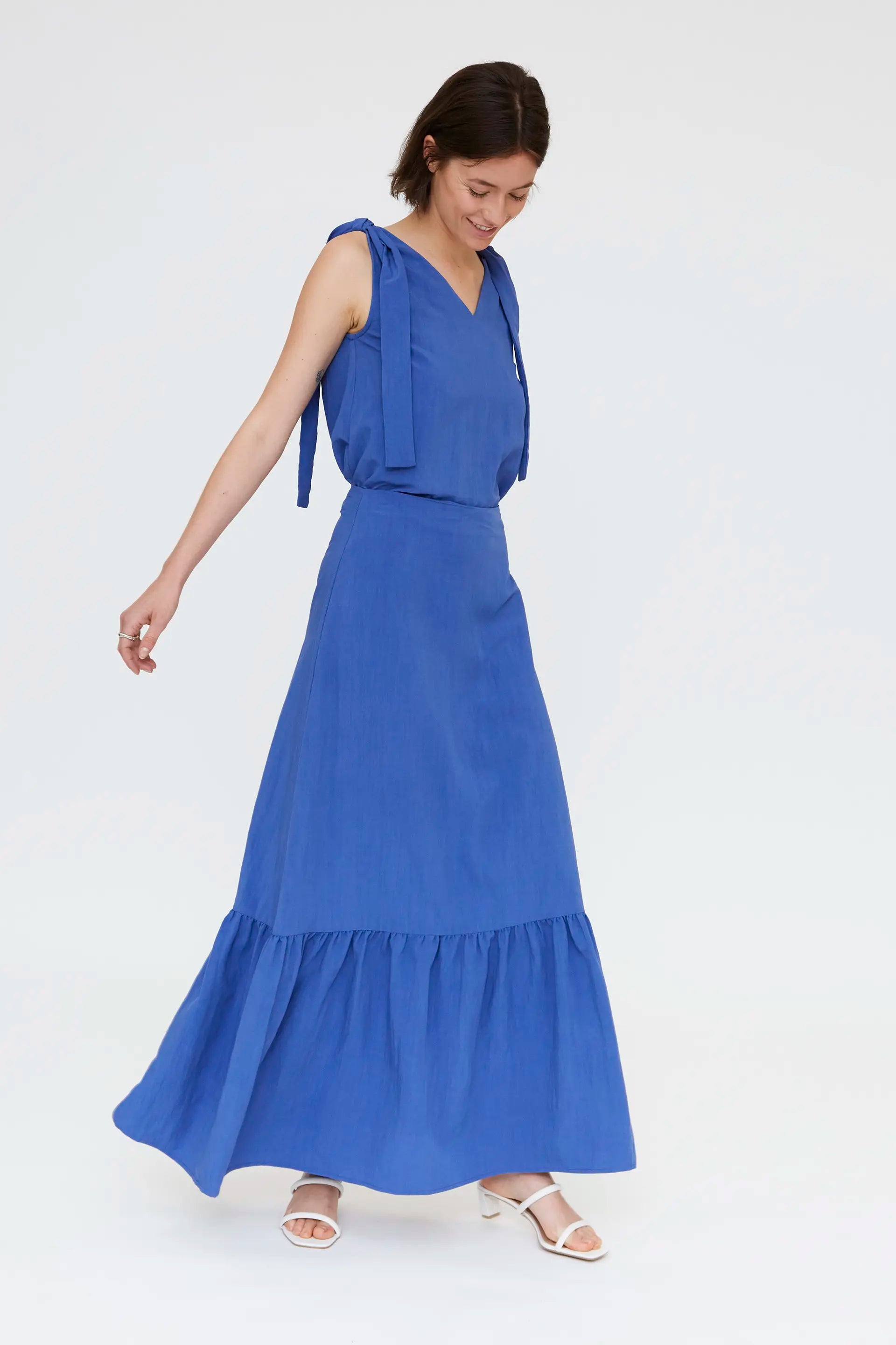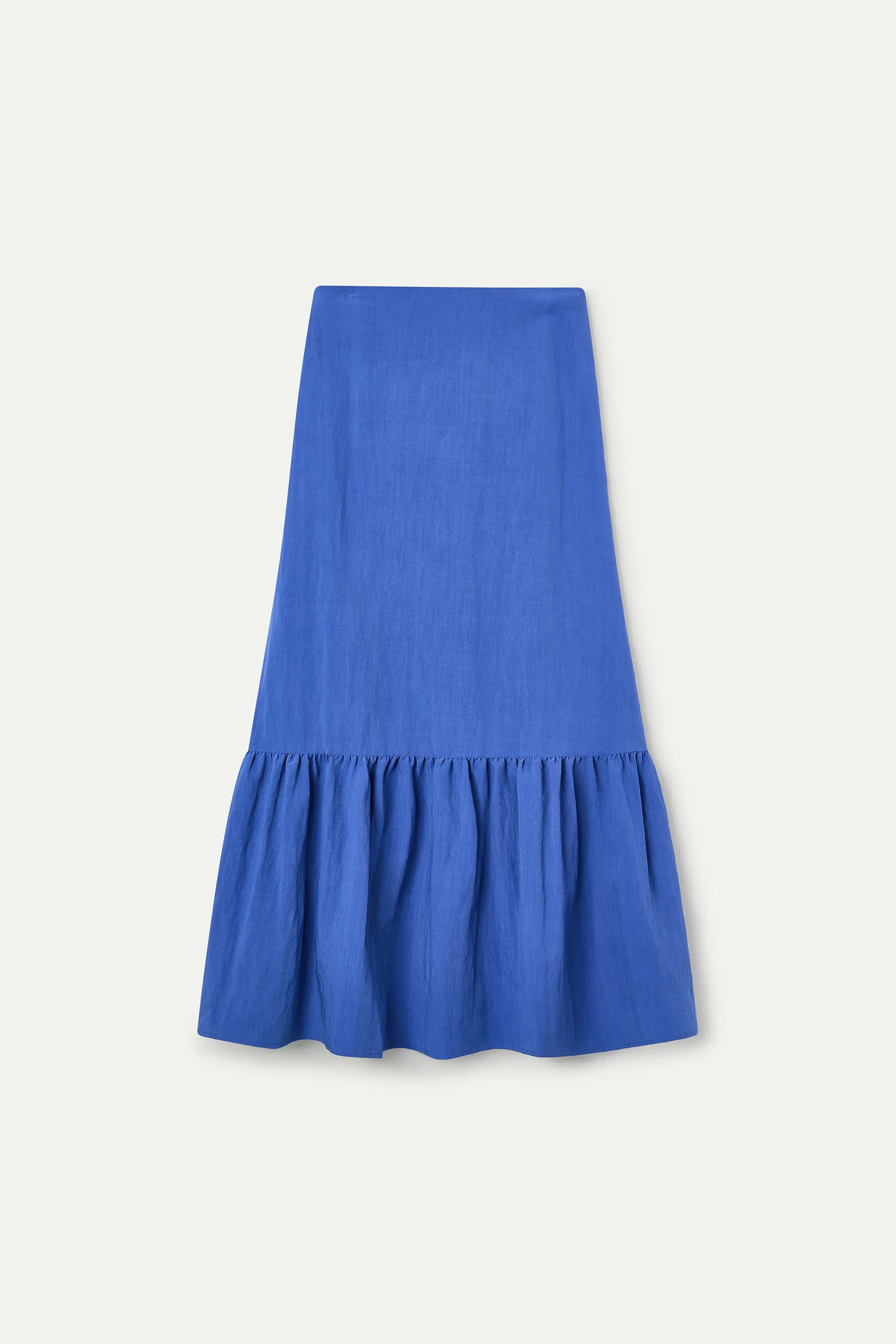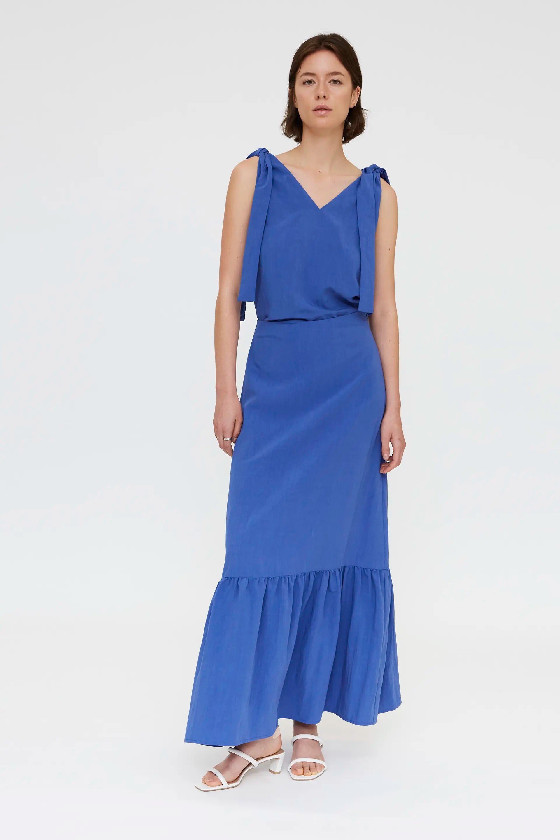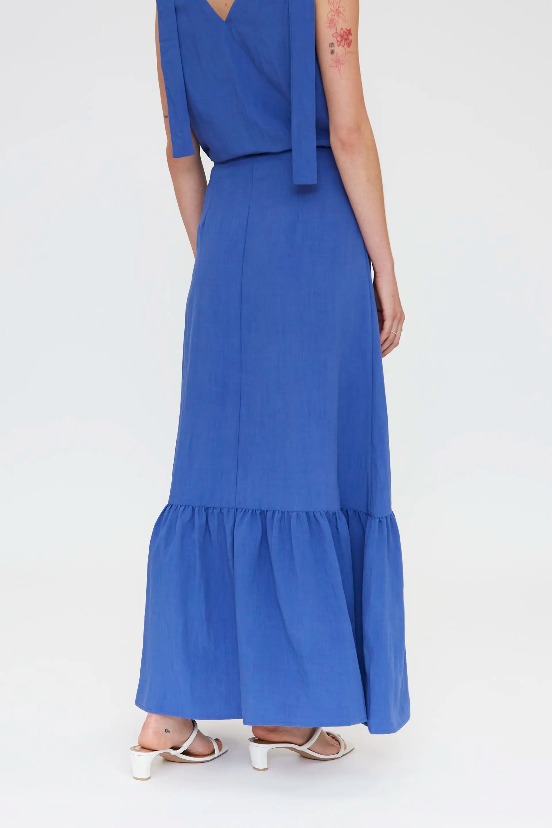 Gonna lunga in leggero tessuto crêpe blu. Vita alta con cinturino fisso. Dettaglio volant. Chiusura laterale con zip nascosta. La modella è alta 175 cm e indossa una taglia S.