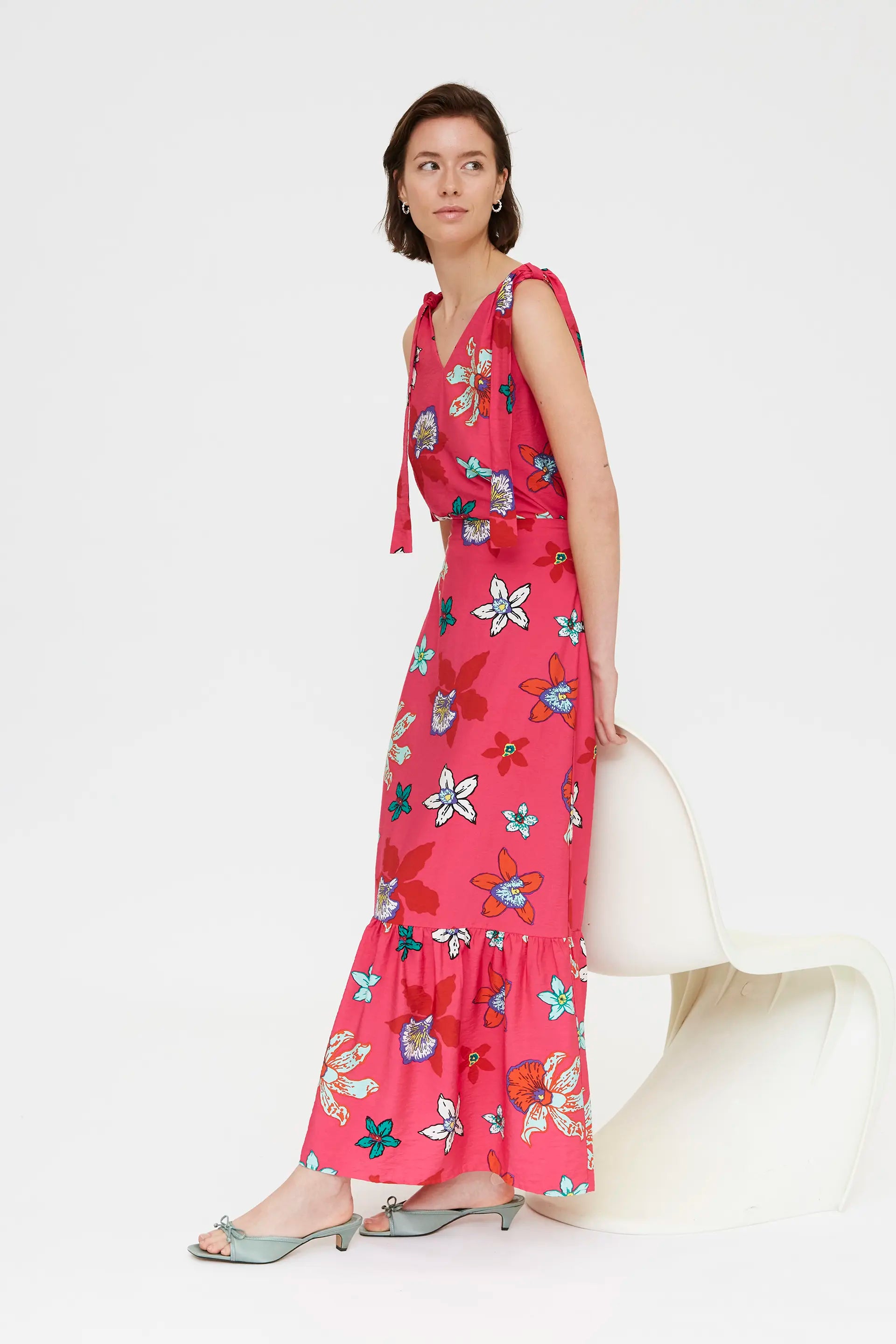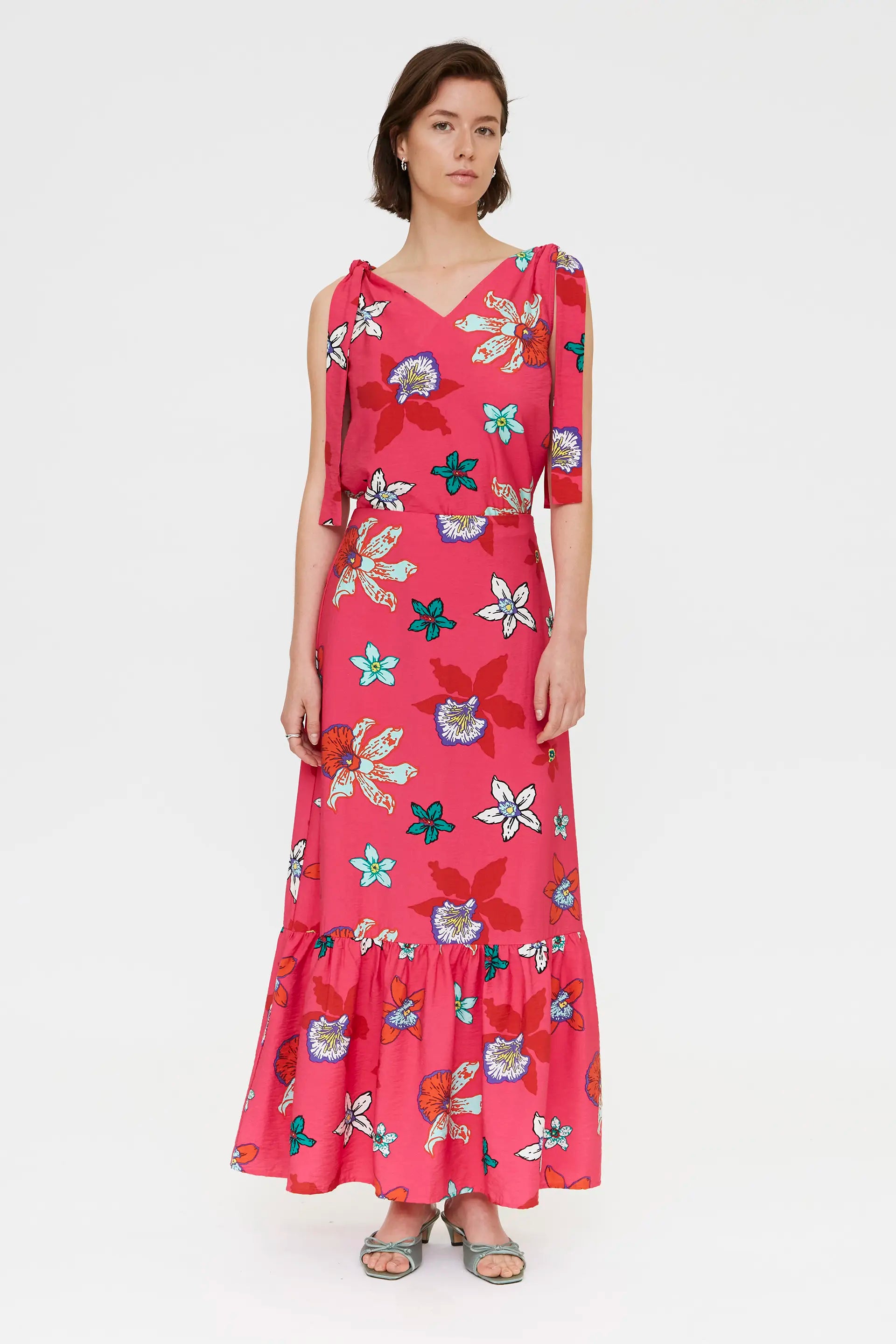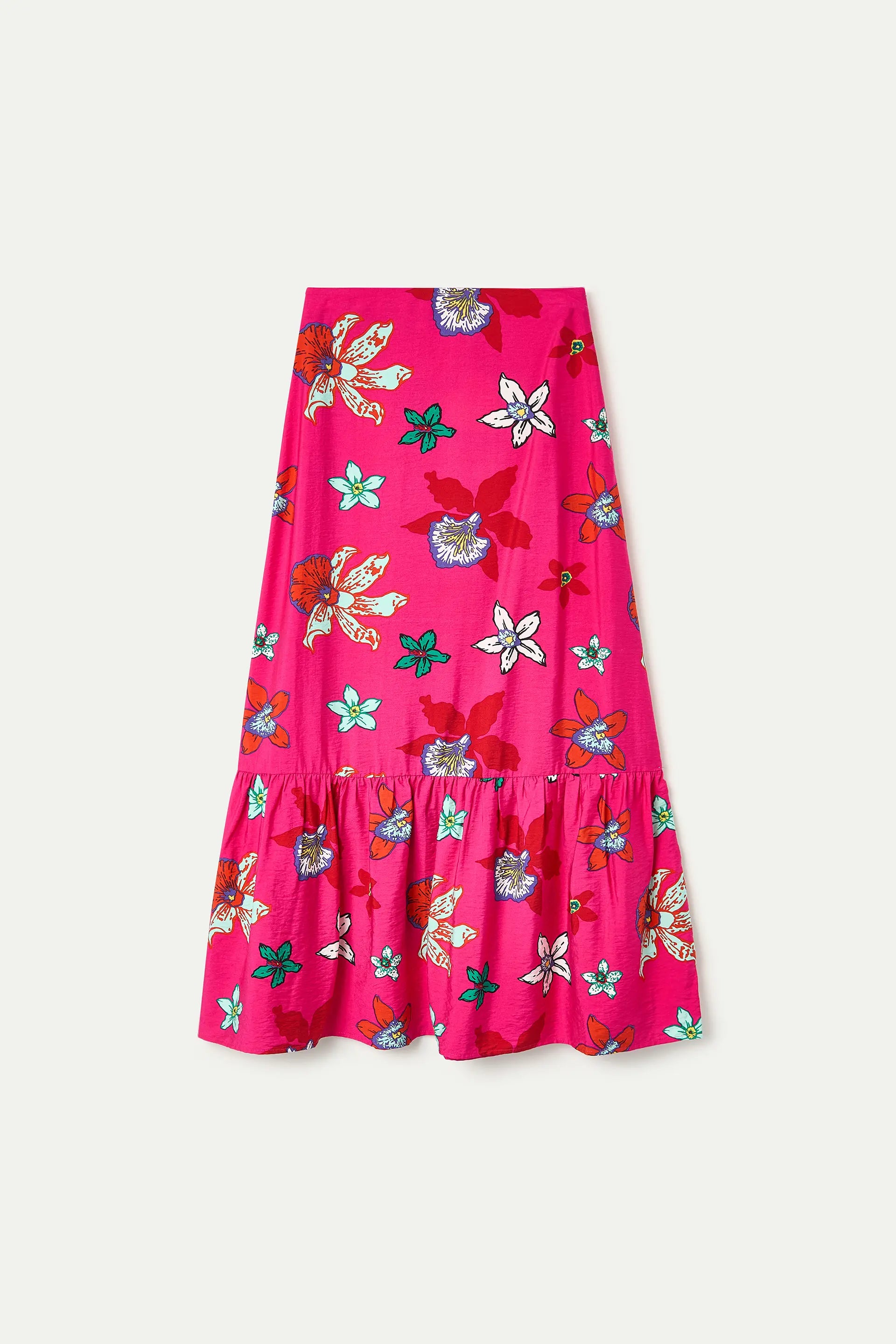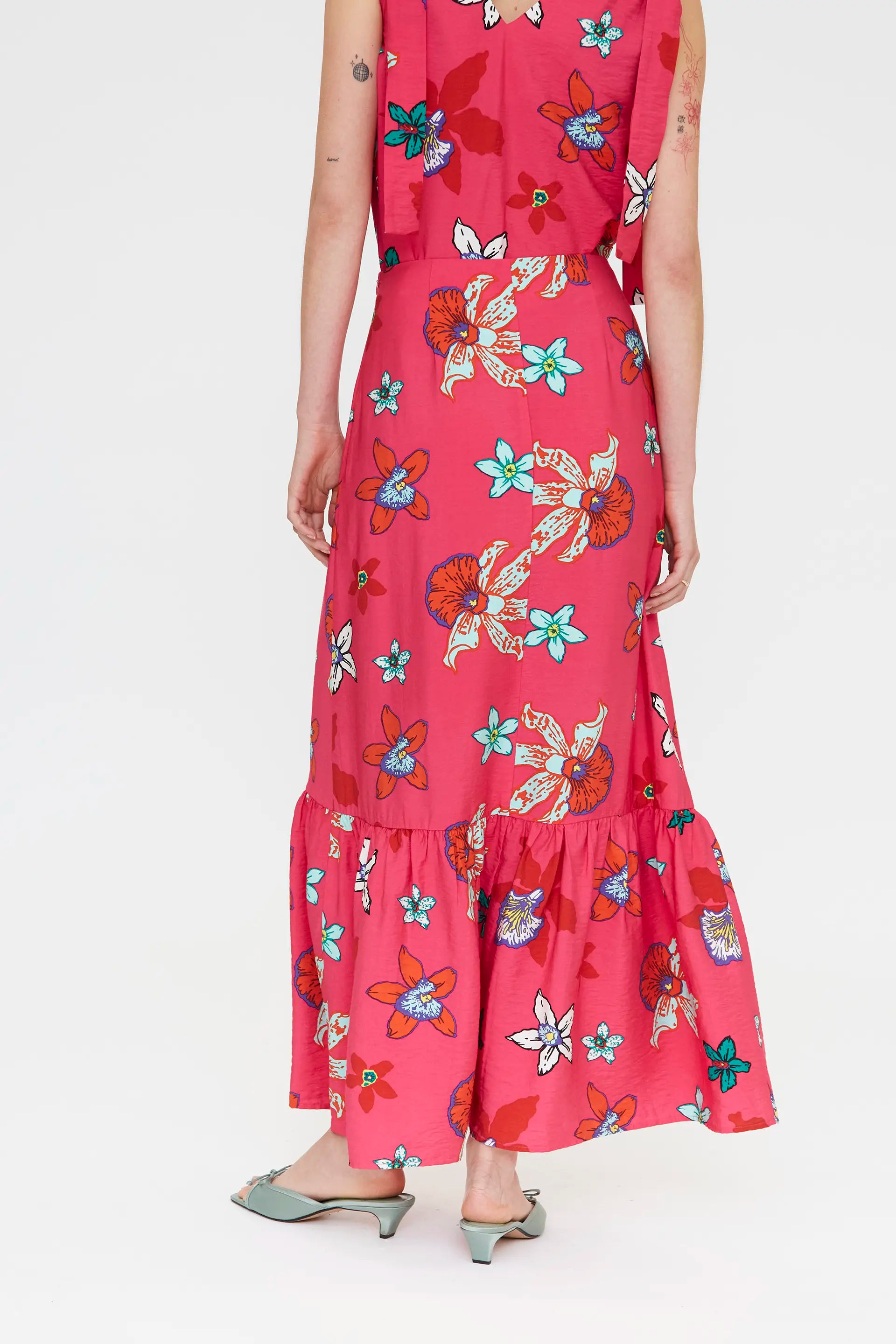 Gonna lunga in crêpe con stampa Vanda. Vita alta con cinturino fisso. Chiusura laterale con zip nascosta. Dettaglio volant. La modella è alta 177 cm e indossa una taglia S.