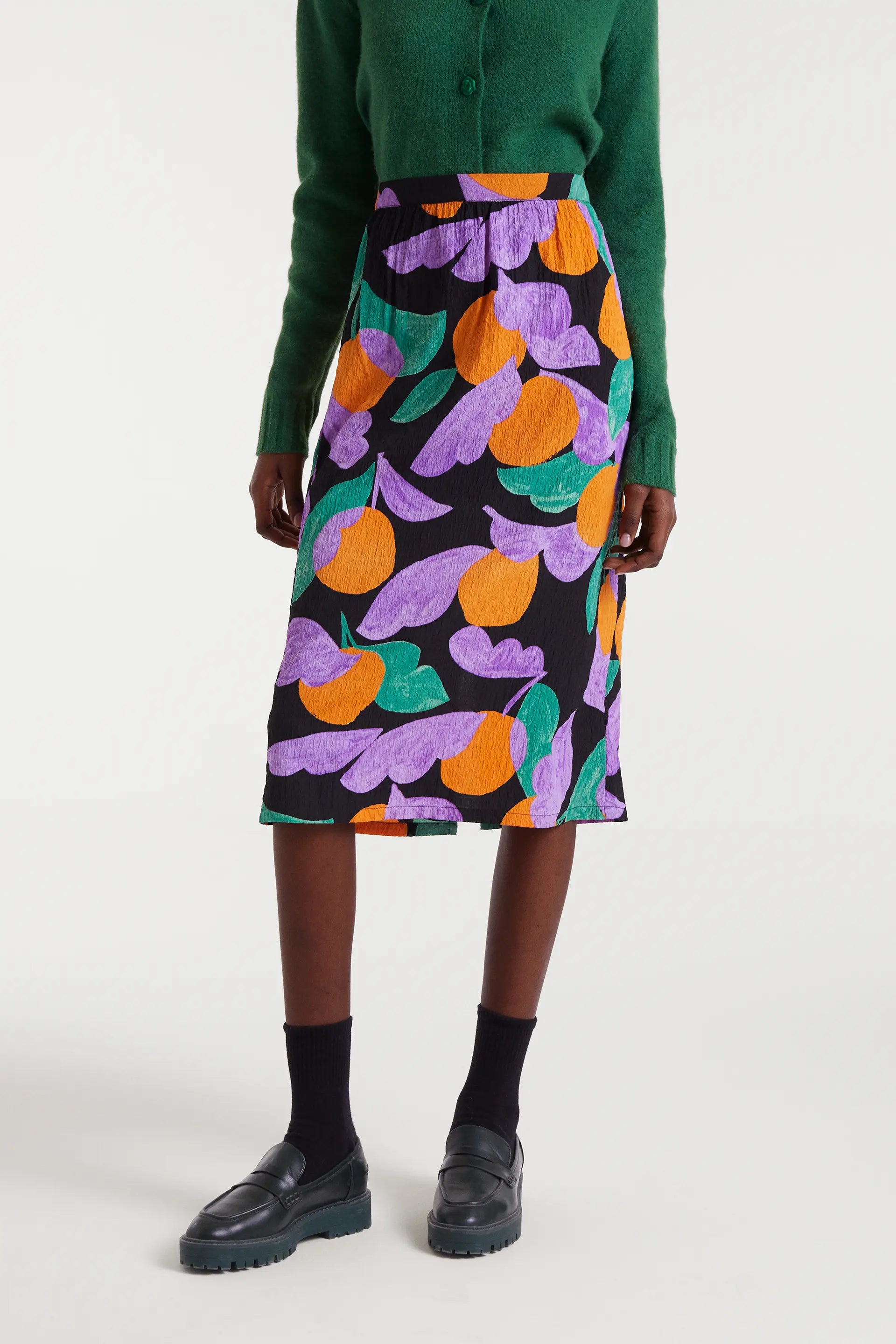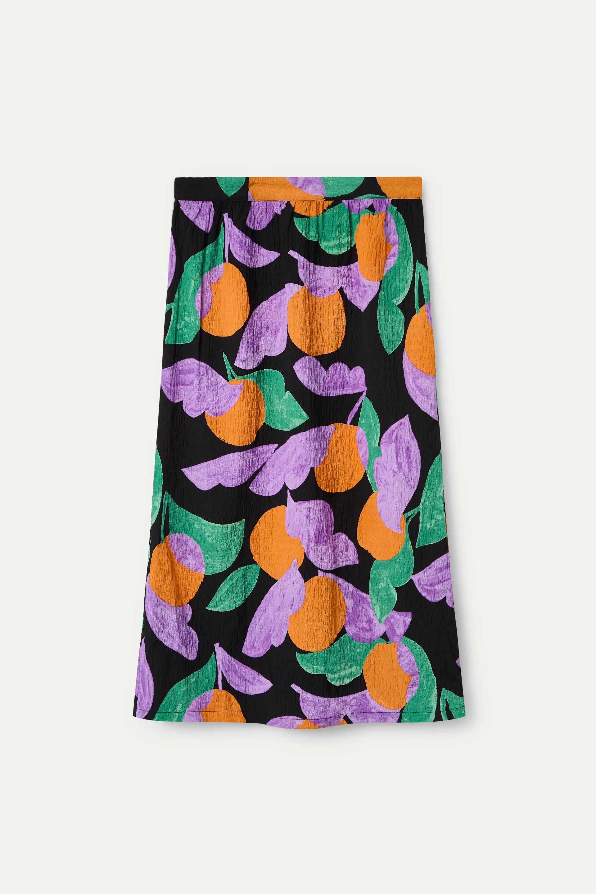 Gonna midi in seersucker con stampa albicocca. Vita alta con elastico posteriore. Spacco laterale. Foderata. La modella è alta 178 cm e indossa una taglia S.