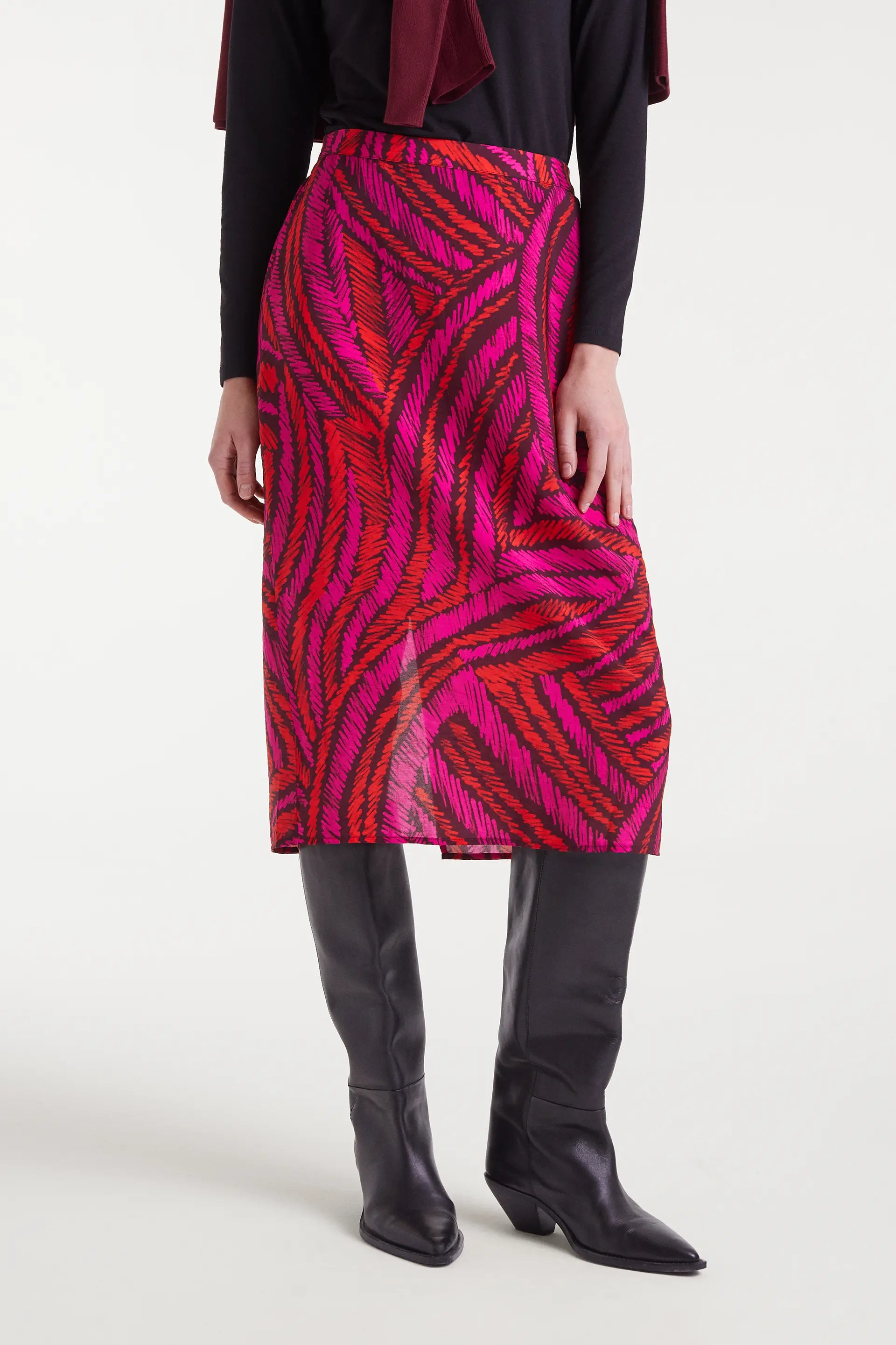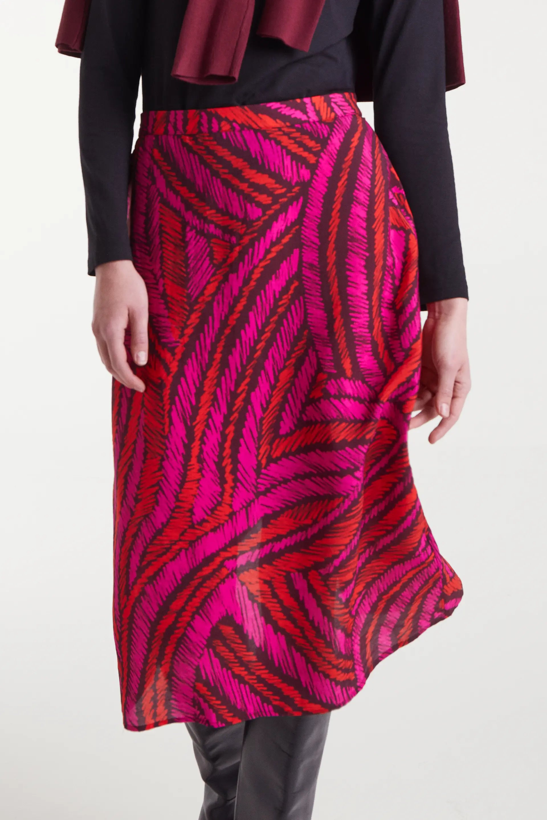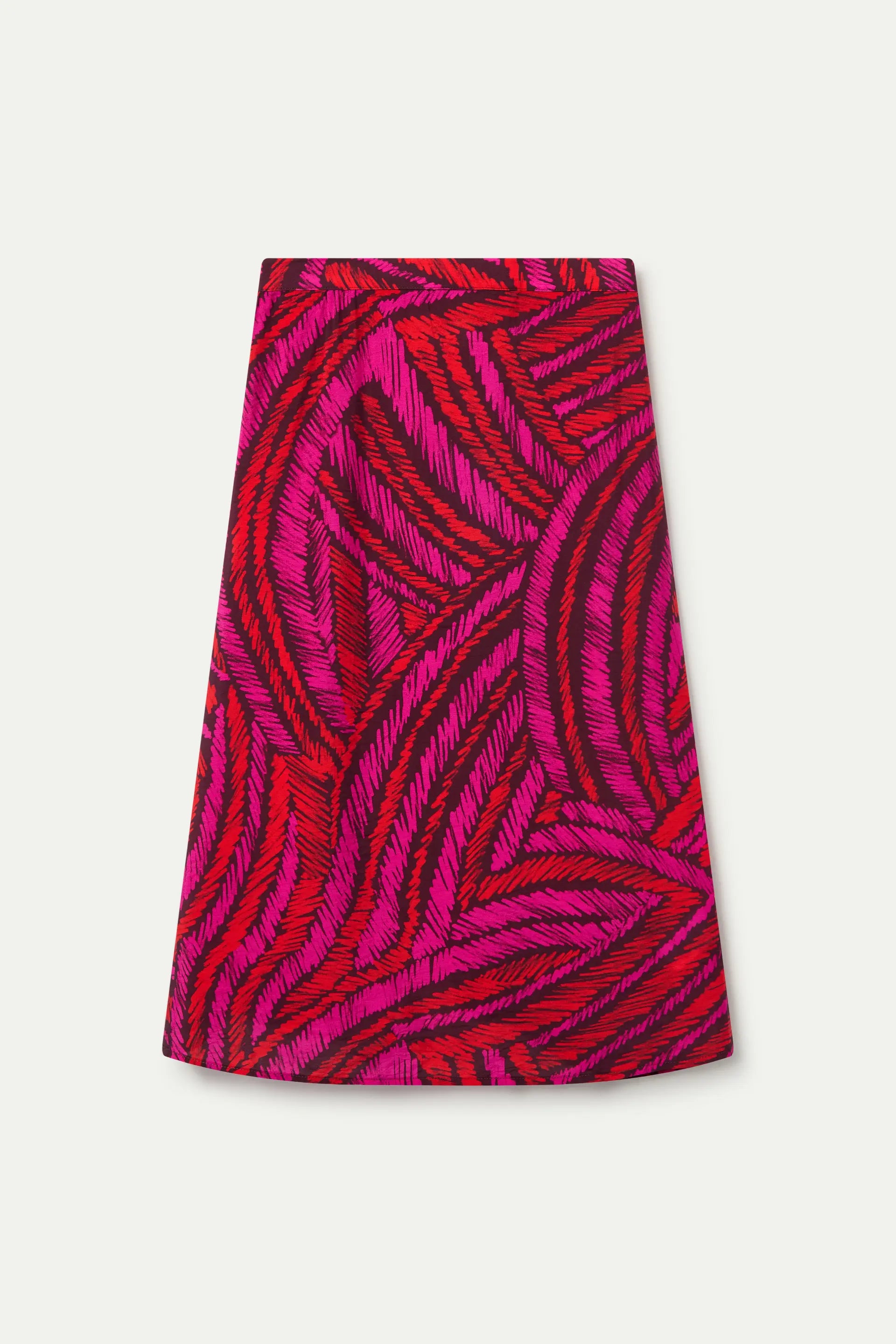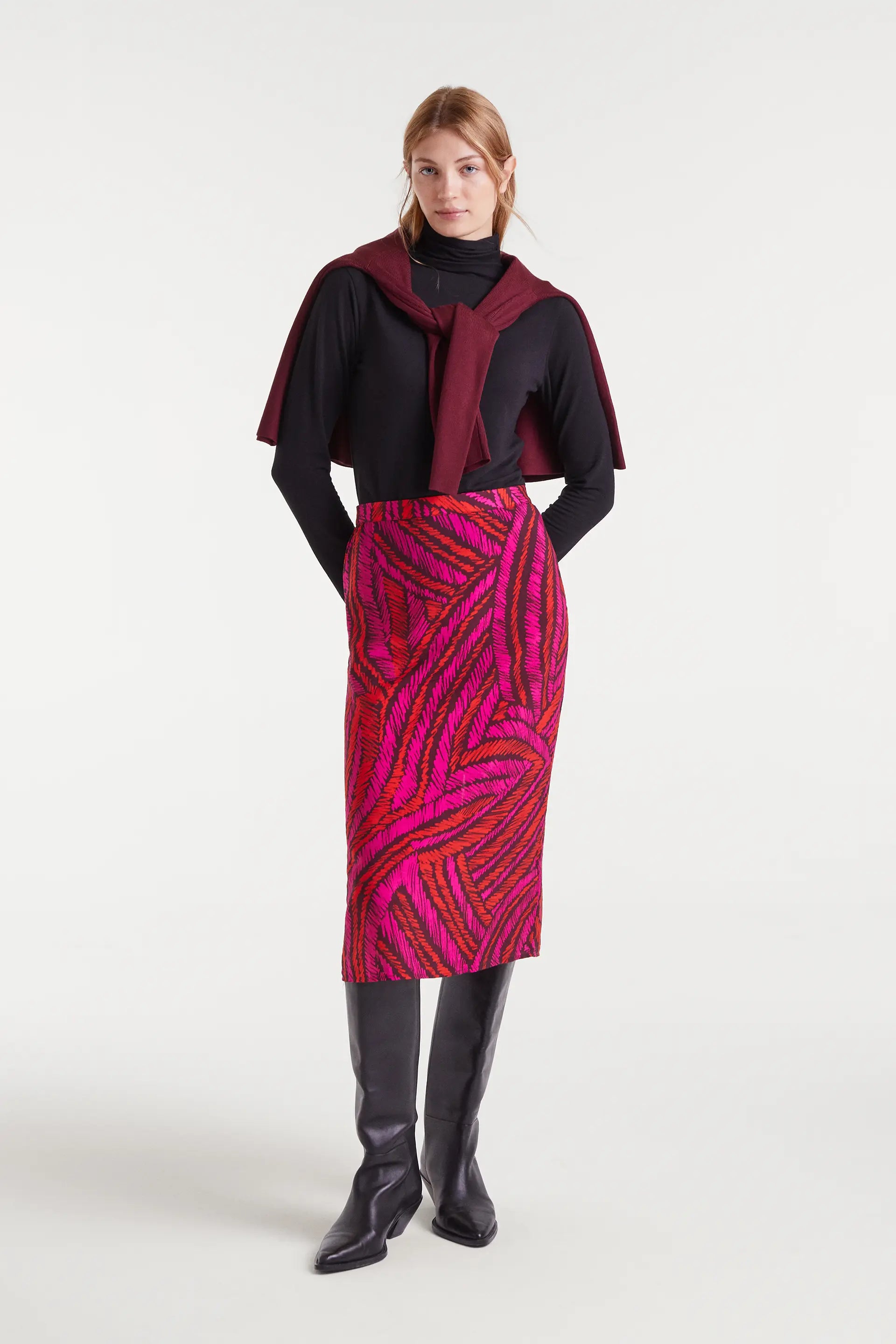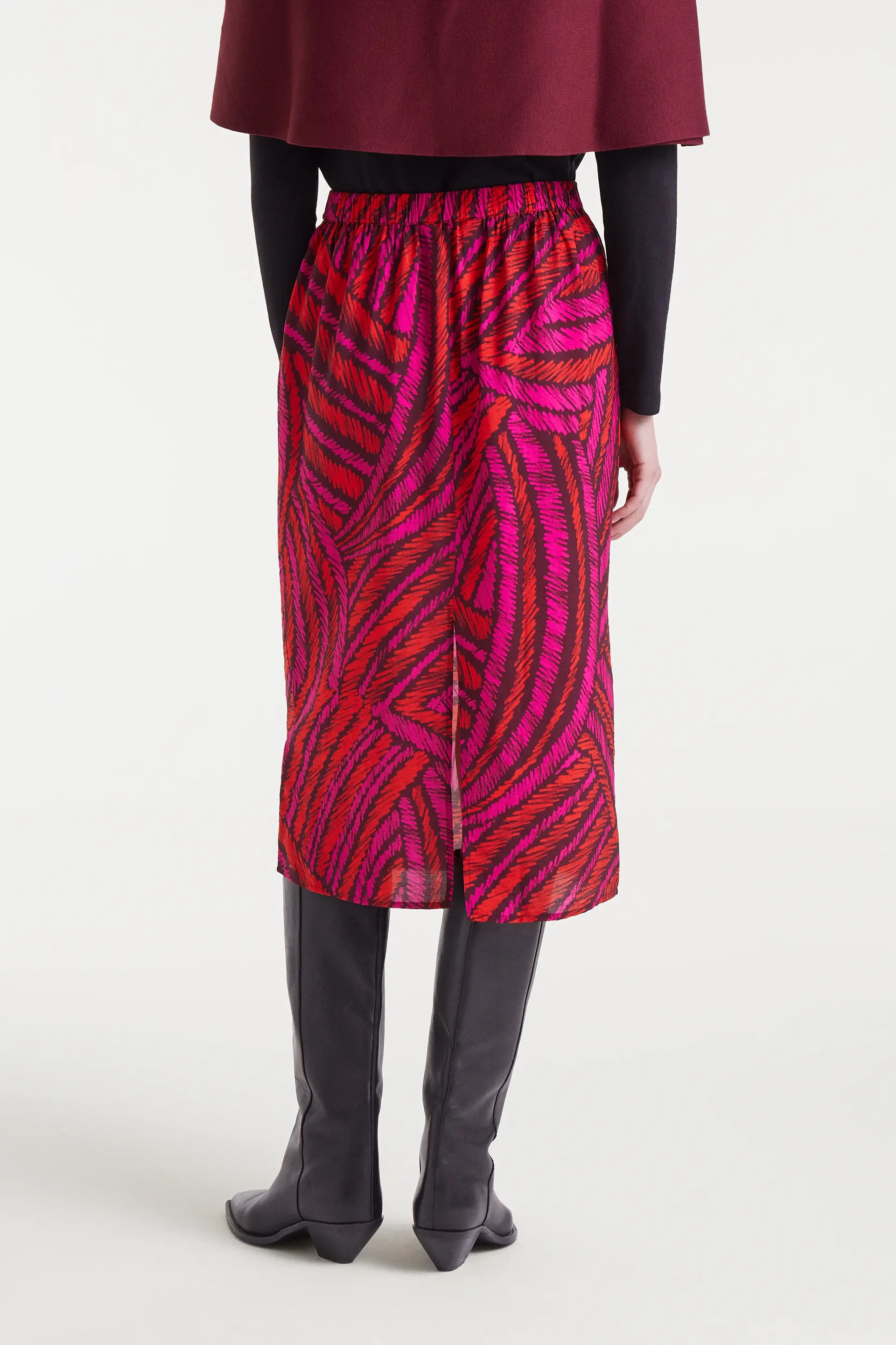 Gonna midi in tessuto crêpe leggero con stampa Fedora. Vita media con elastico in vita sul retro. Leggero spacco posteriore. La modella è alta 179 cm e indossa una taglia S.