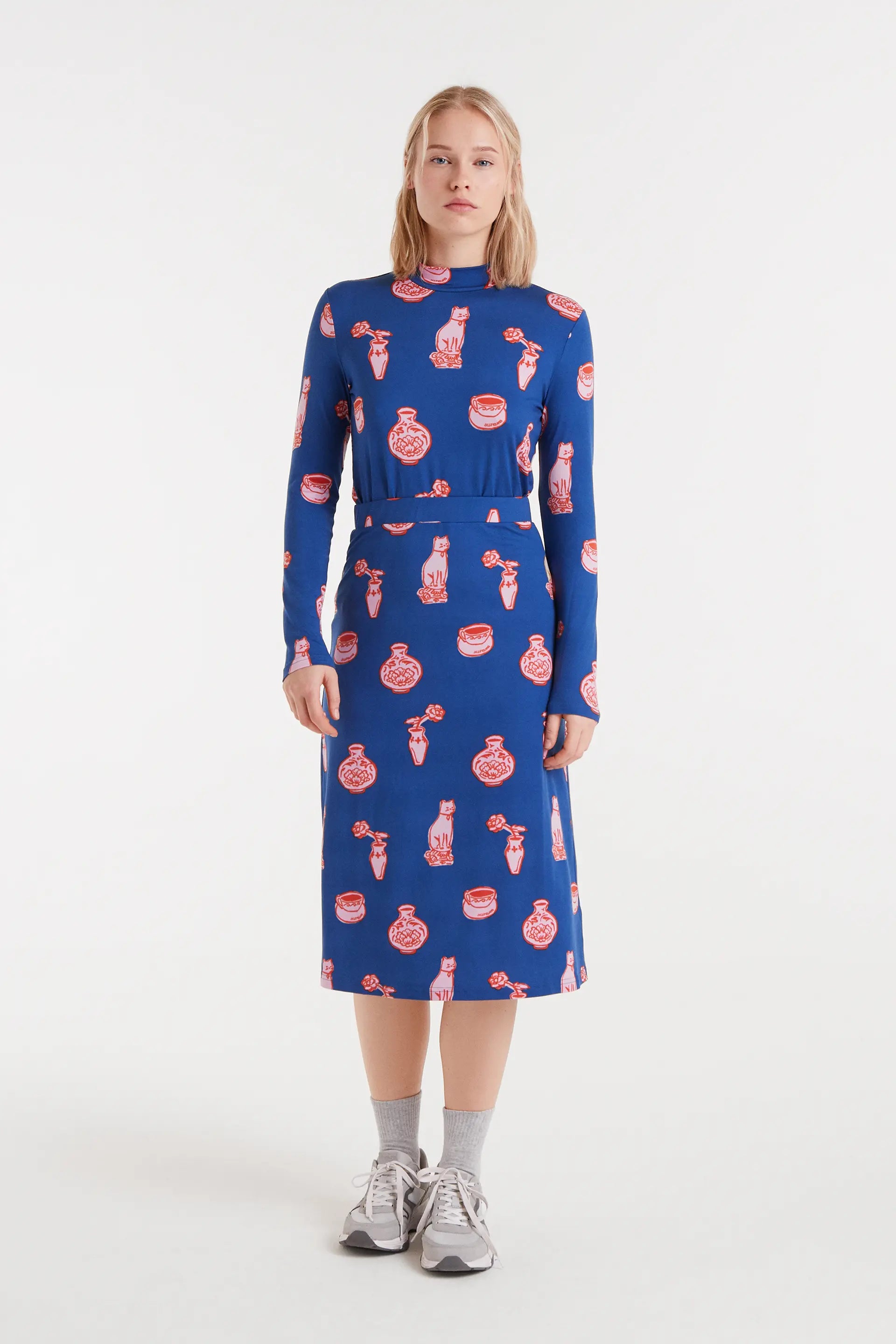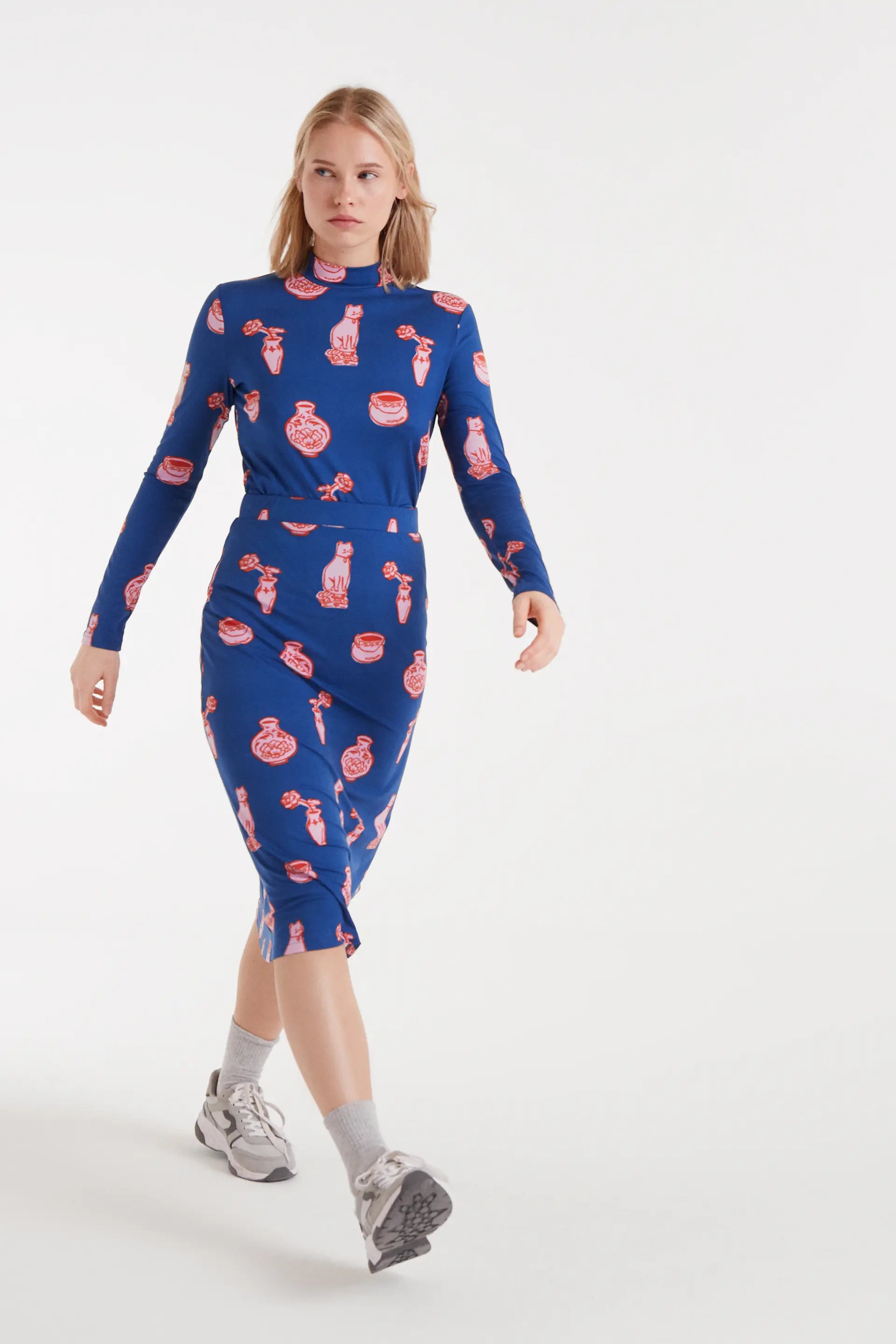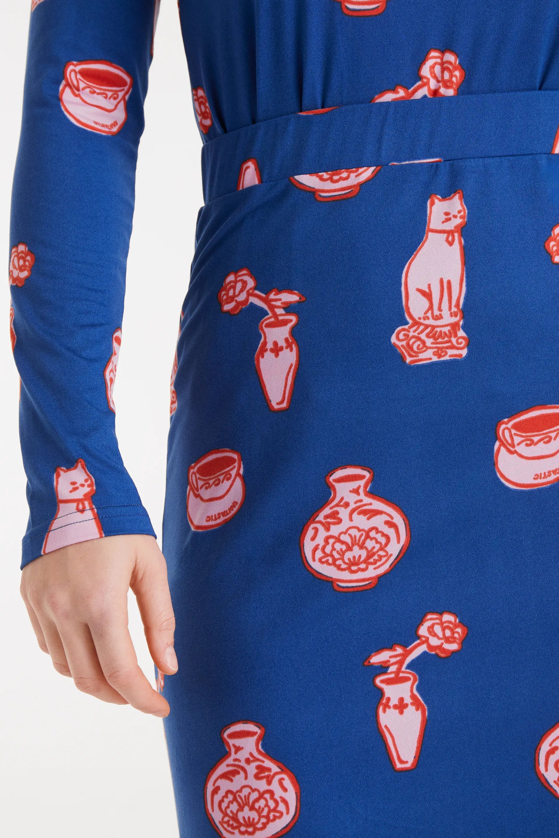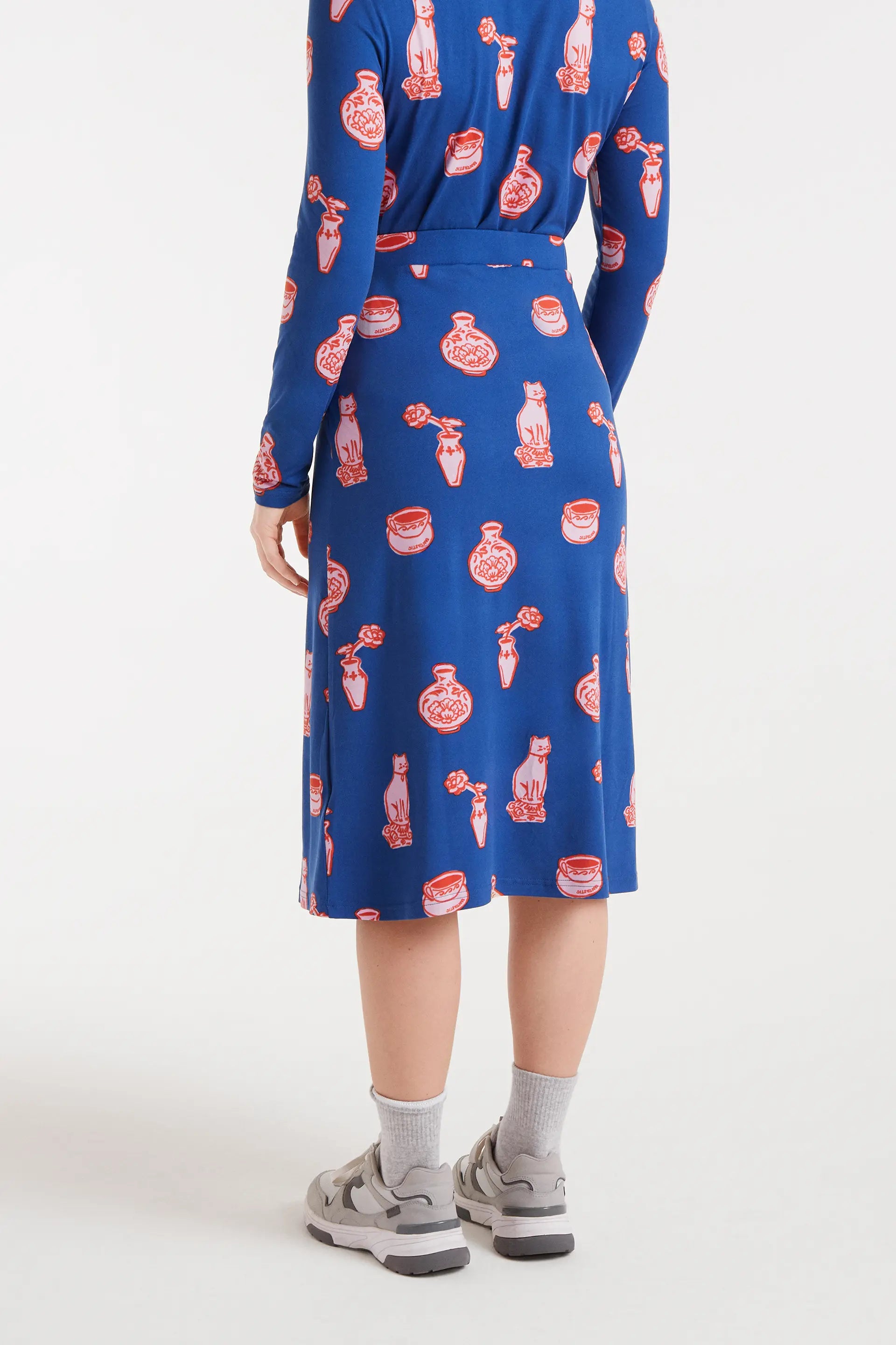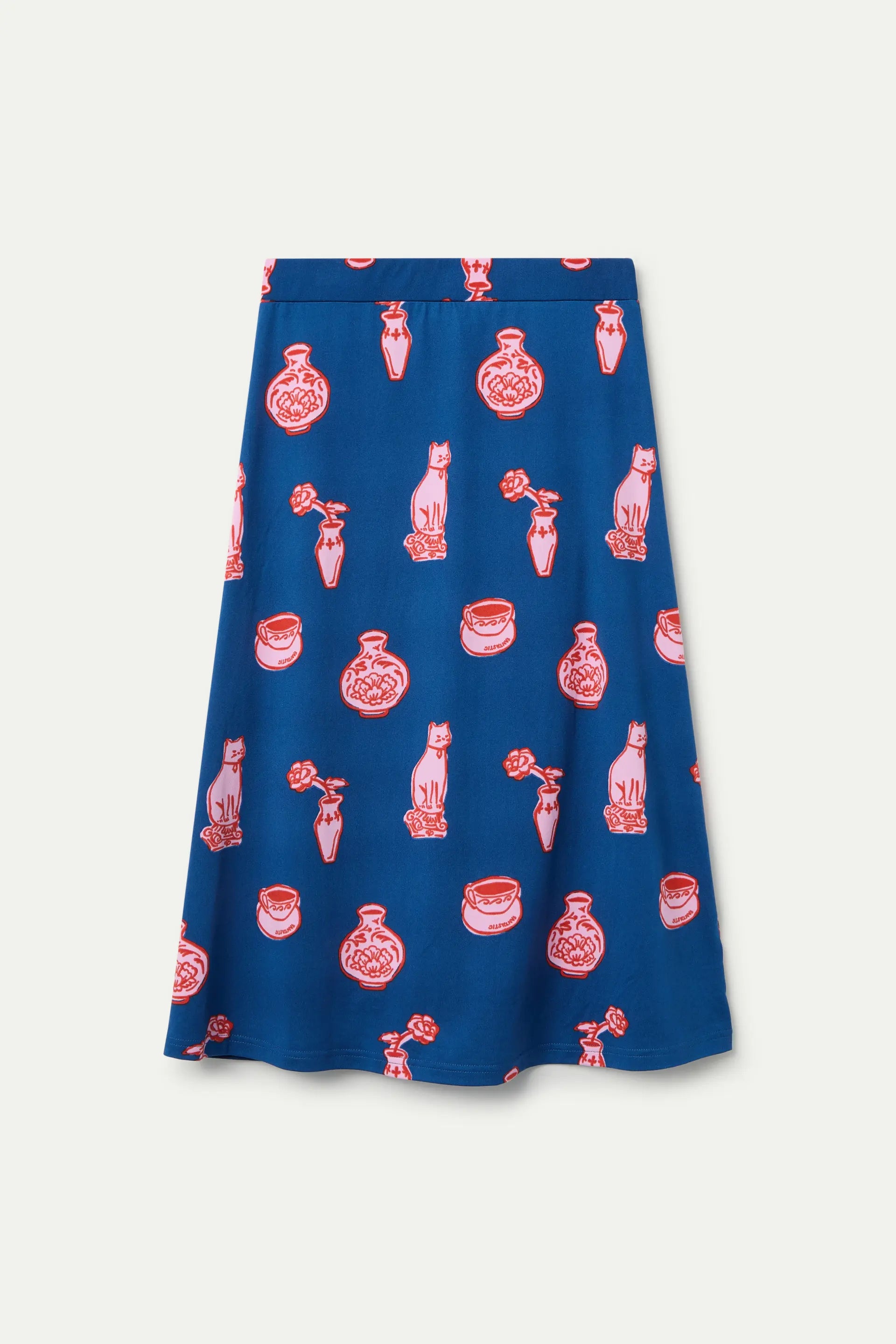 Gonna midi con stampa porcellana, vita media e ampio elastico in vita. La modella è alta 177 cm e indossa una taglia S.