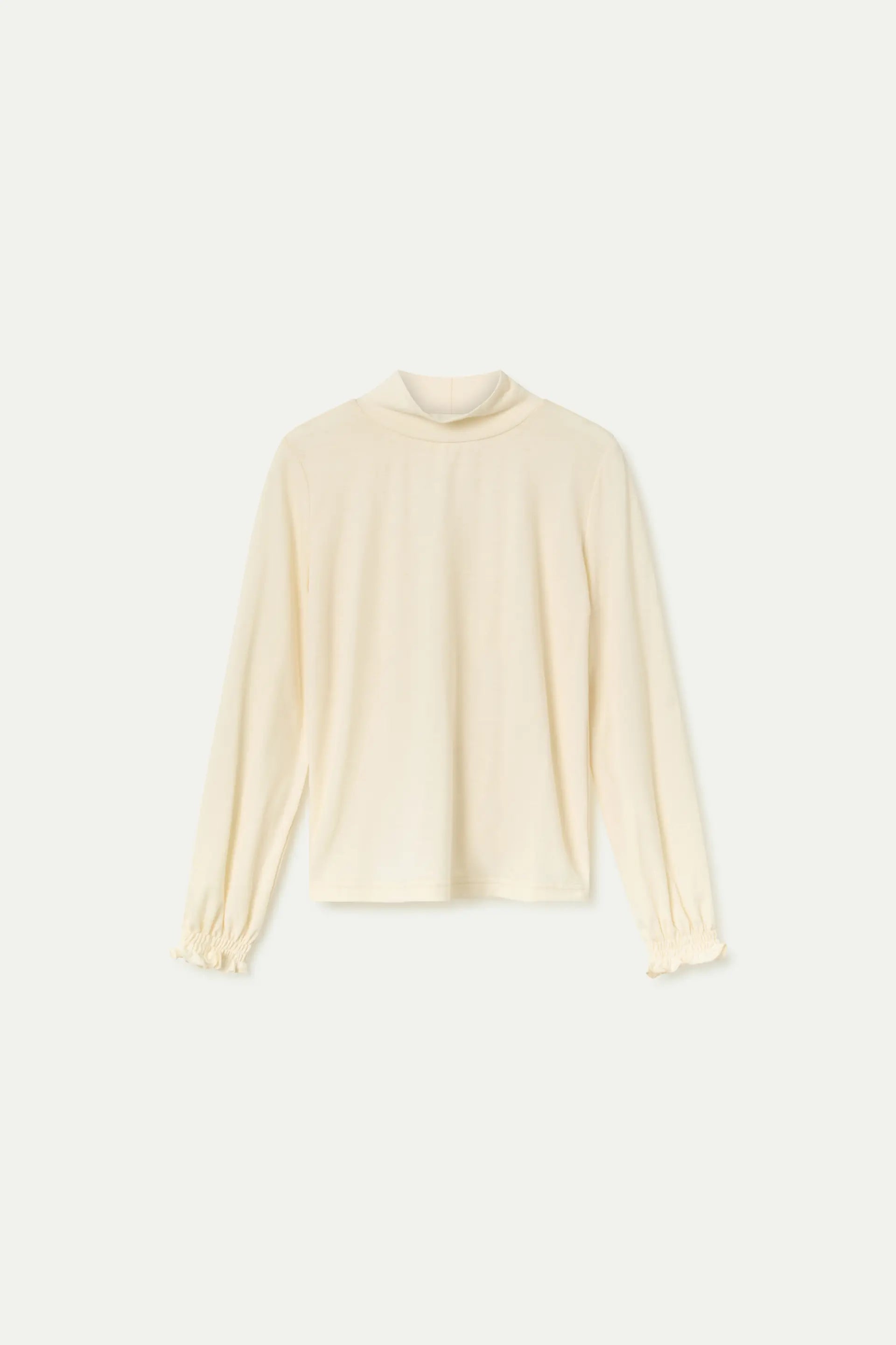 Maglione bianco in maglia fine con maniche lunghe, collo alto e polsini elastici arricciati.