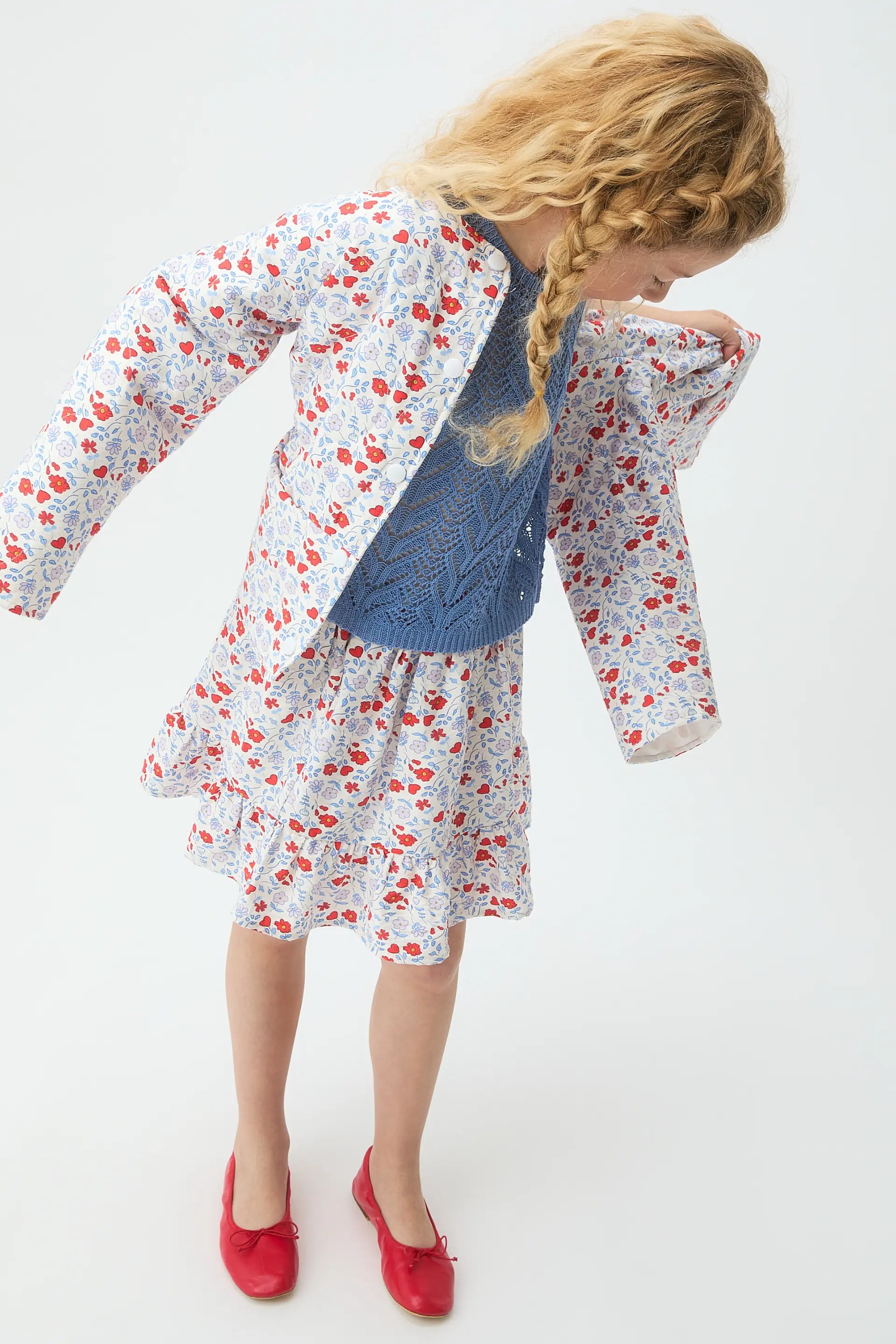 Maglione blu in maglia da bambina con dettagli ricamati. Scollo rotondo e maniche corte. Rifiniture a coste. La modella è alta 126 cm e indossa la taglia 8-9 anni.