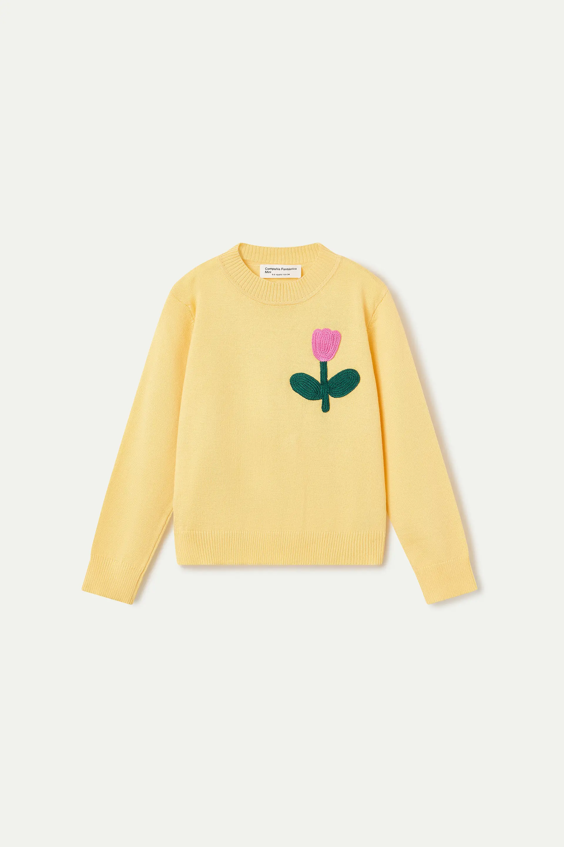 Maglione giallo da bambina in maglia con dettaglio floreale ricamato. Scollo rotondo e maniche lunghe. Rifiniture a coste. La modella è alta 136 cm e indossa la taglia 8-9 anni.
