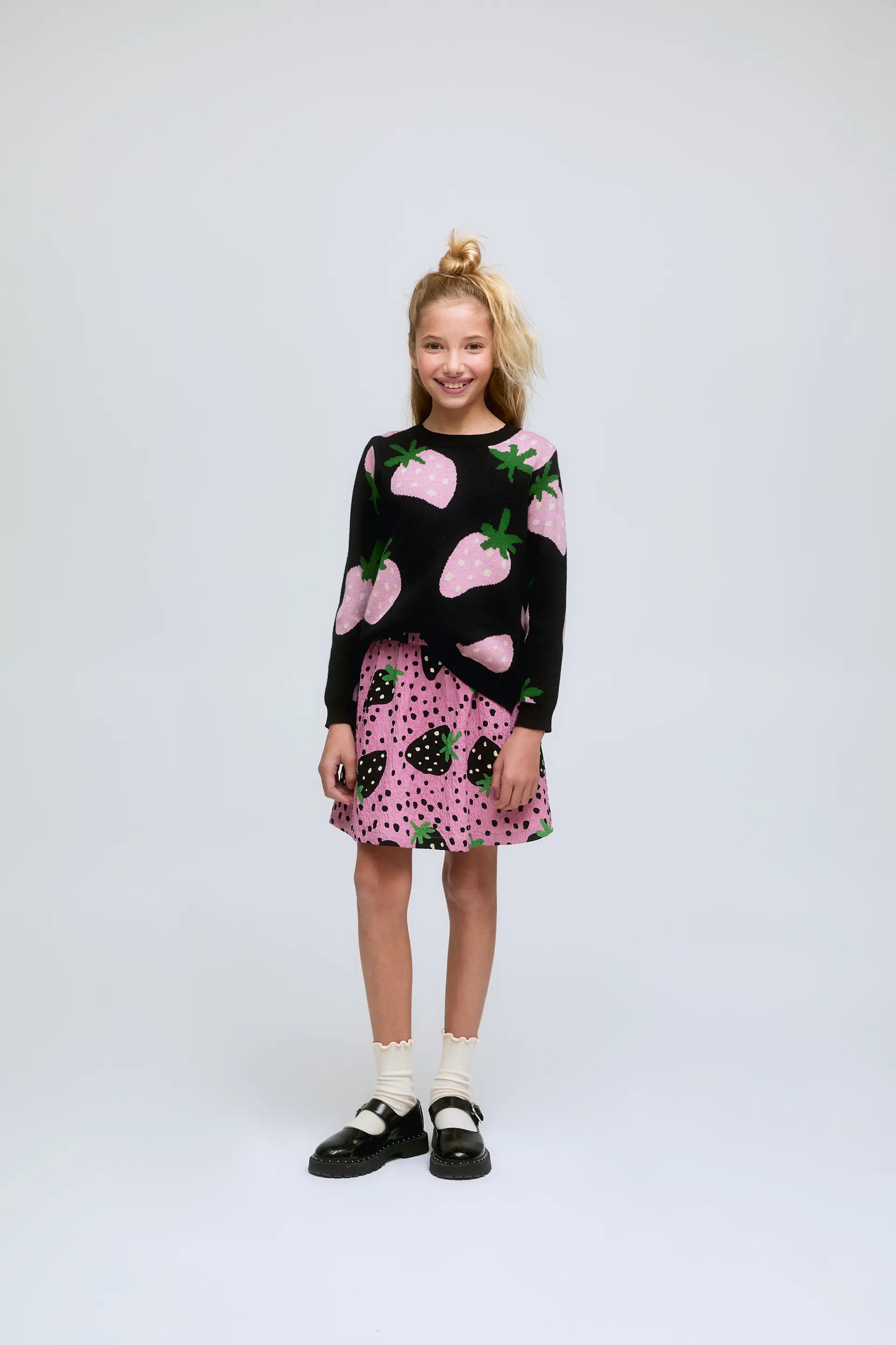 Maglione in maglia da bambina con stampa Morango e fragole. Scollo rotondo e maniche lunghe. Rifiniture a coste.