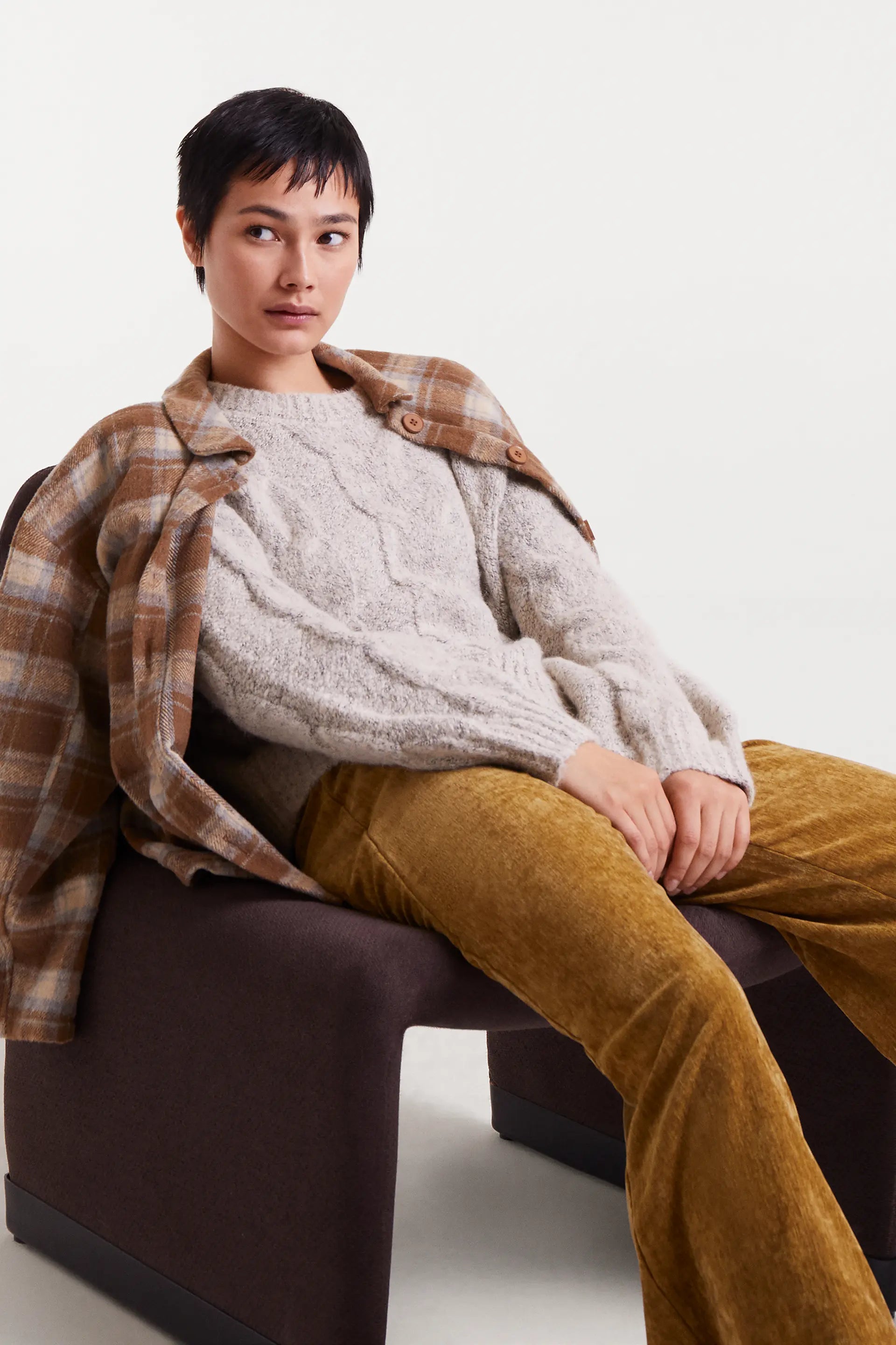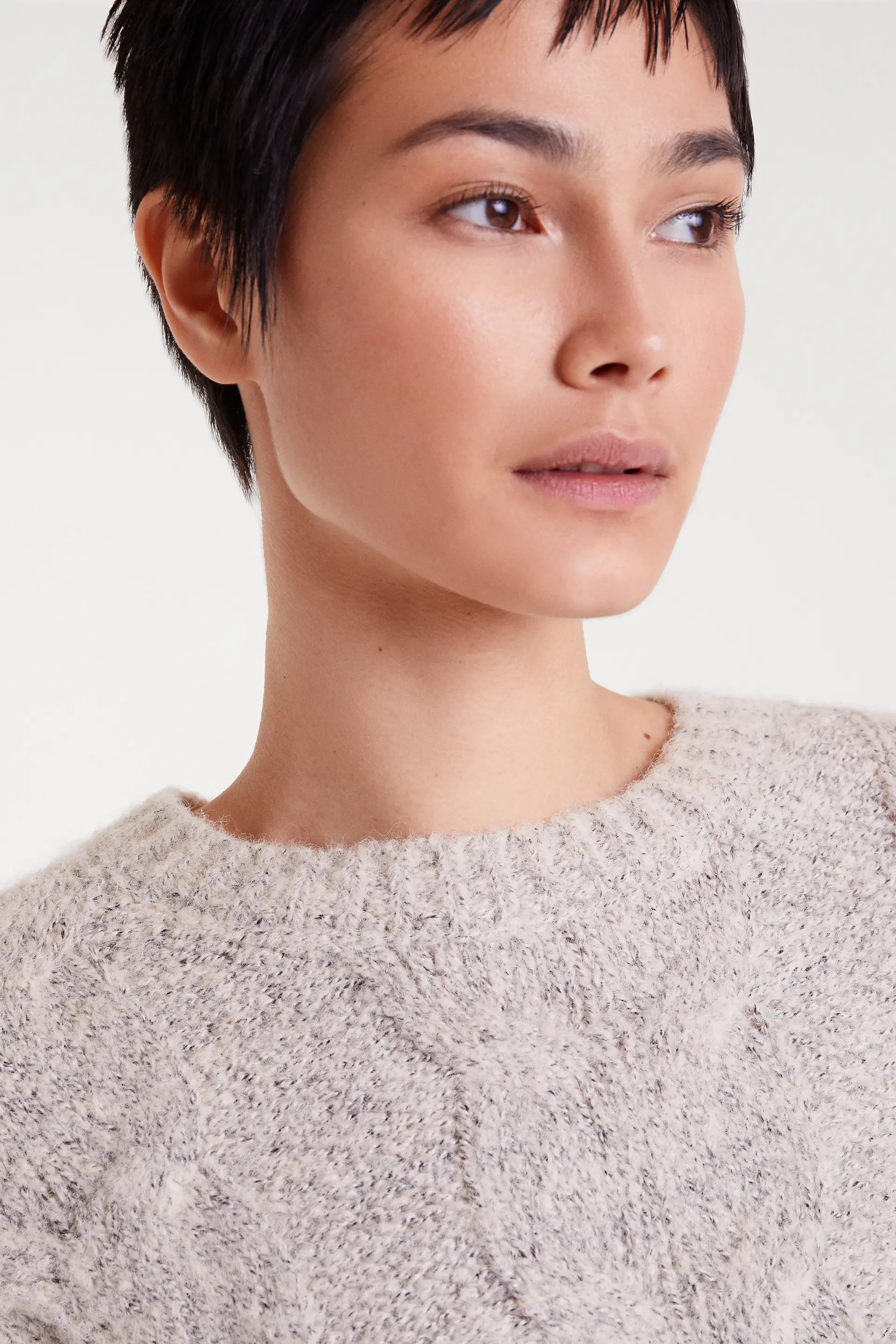 Maglione bianco in maglia con dettagli a catena. Scollo rotondo e maniche lunghe. Dettagli a coste. La modella è alta 177 cm e indossa una taglia S.
