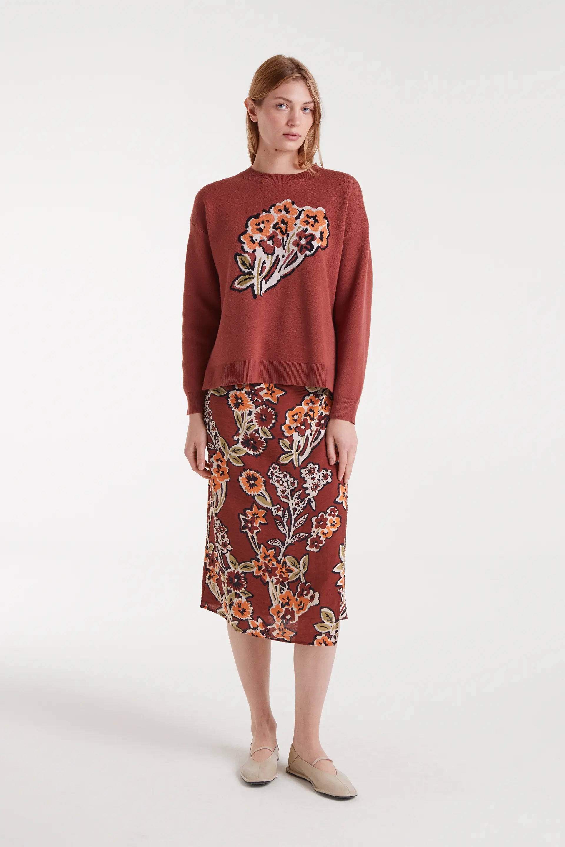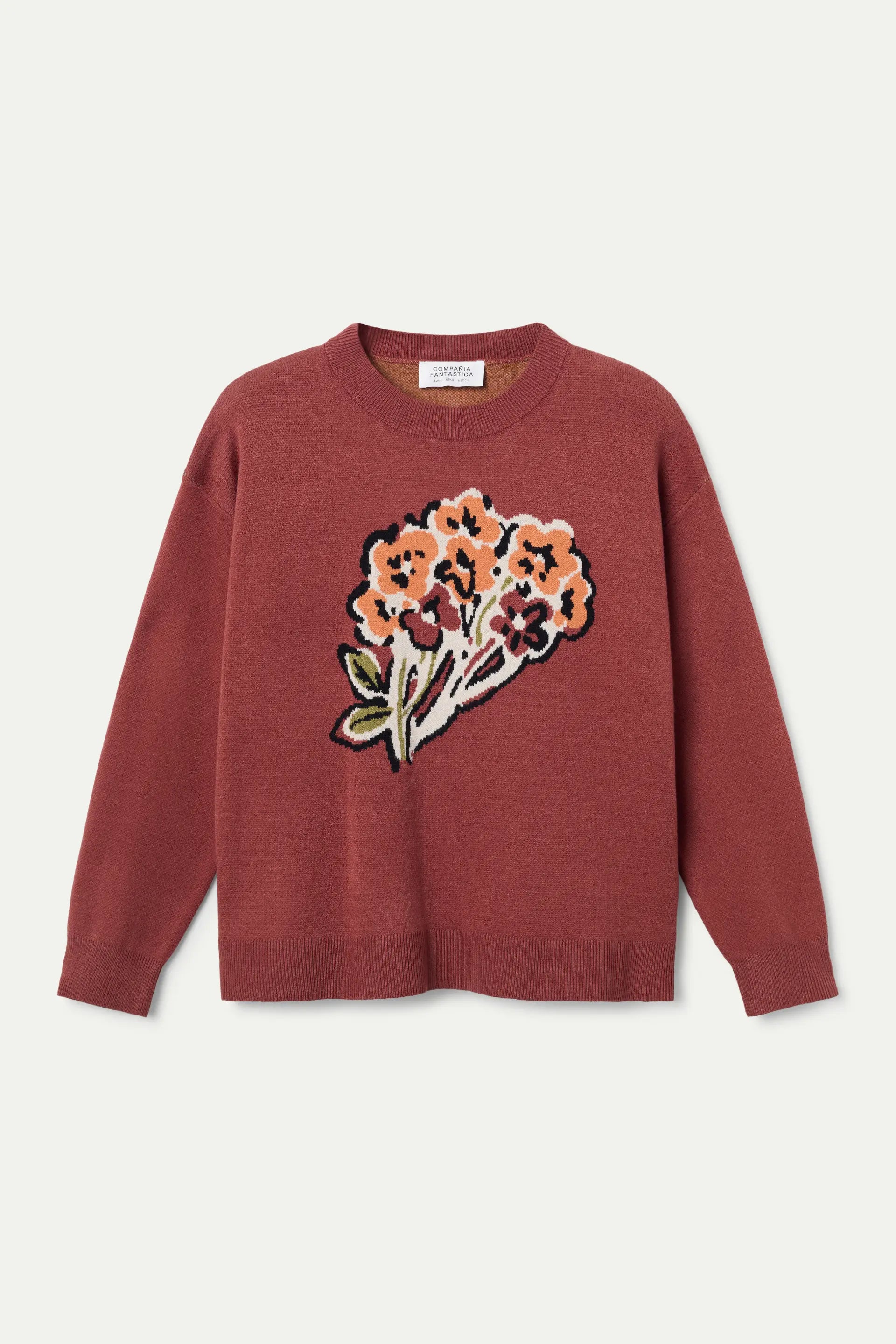 Maglione marrone in maglia jacquard con stampa a bouquet. Scollo rotondo e maniche lunghe con spalle leggermente scese. Rifiniture a coste. La modella è alta 179 cm e indossa una taglia S.
