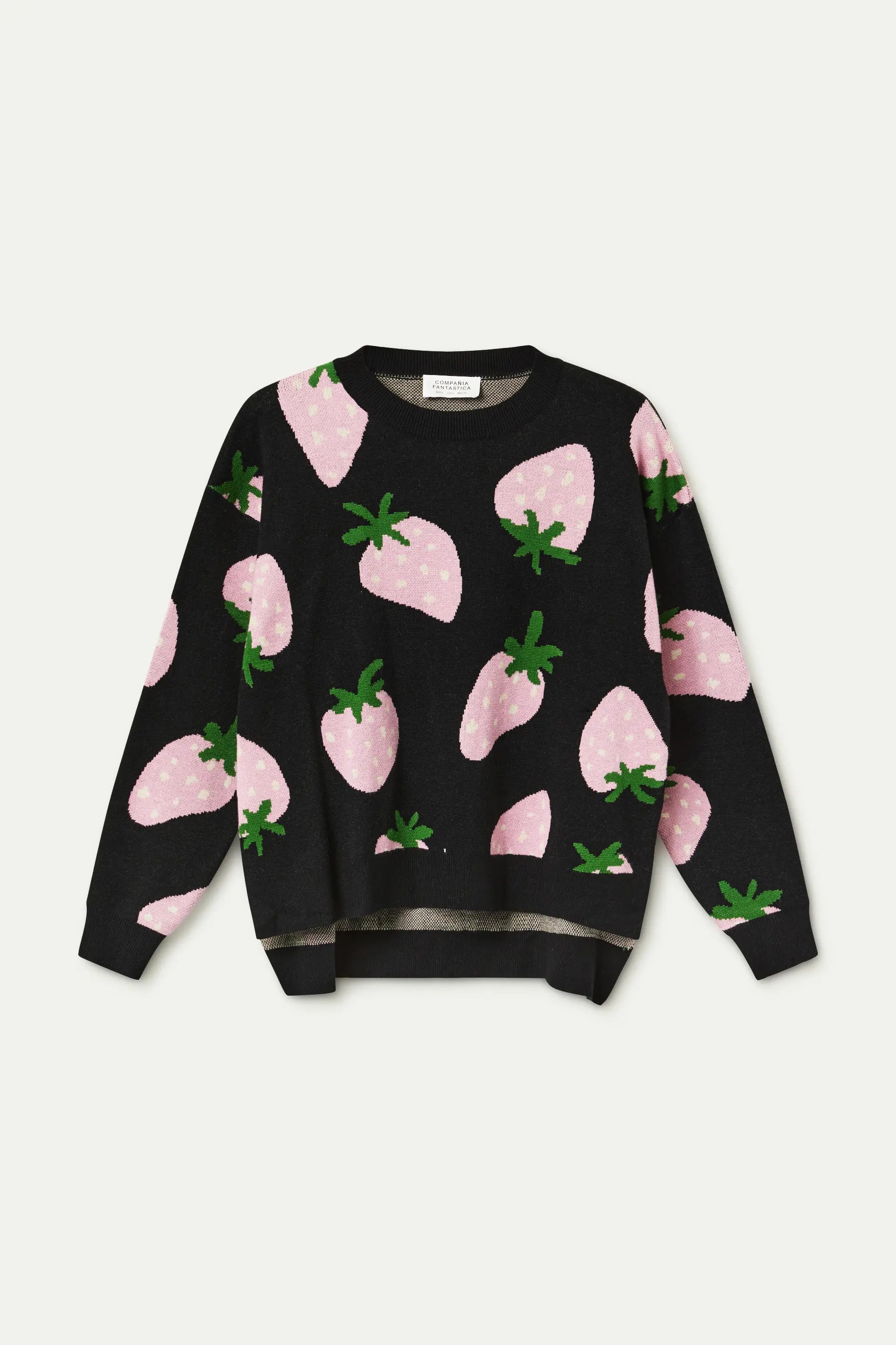 Maglione in maglia jacquard con stampa Morango. Presenta scollo rotondo e maniche lunghe con spalle leggermente scese. Rifiniture a coste. La modella è alta 174 cm e indossa una taglia S.