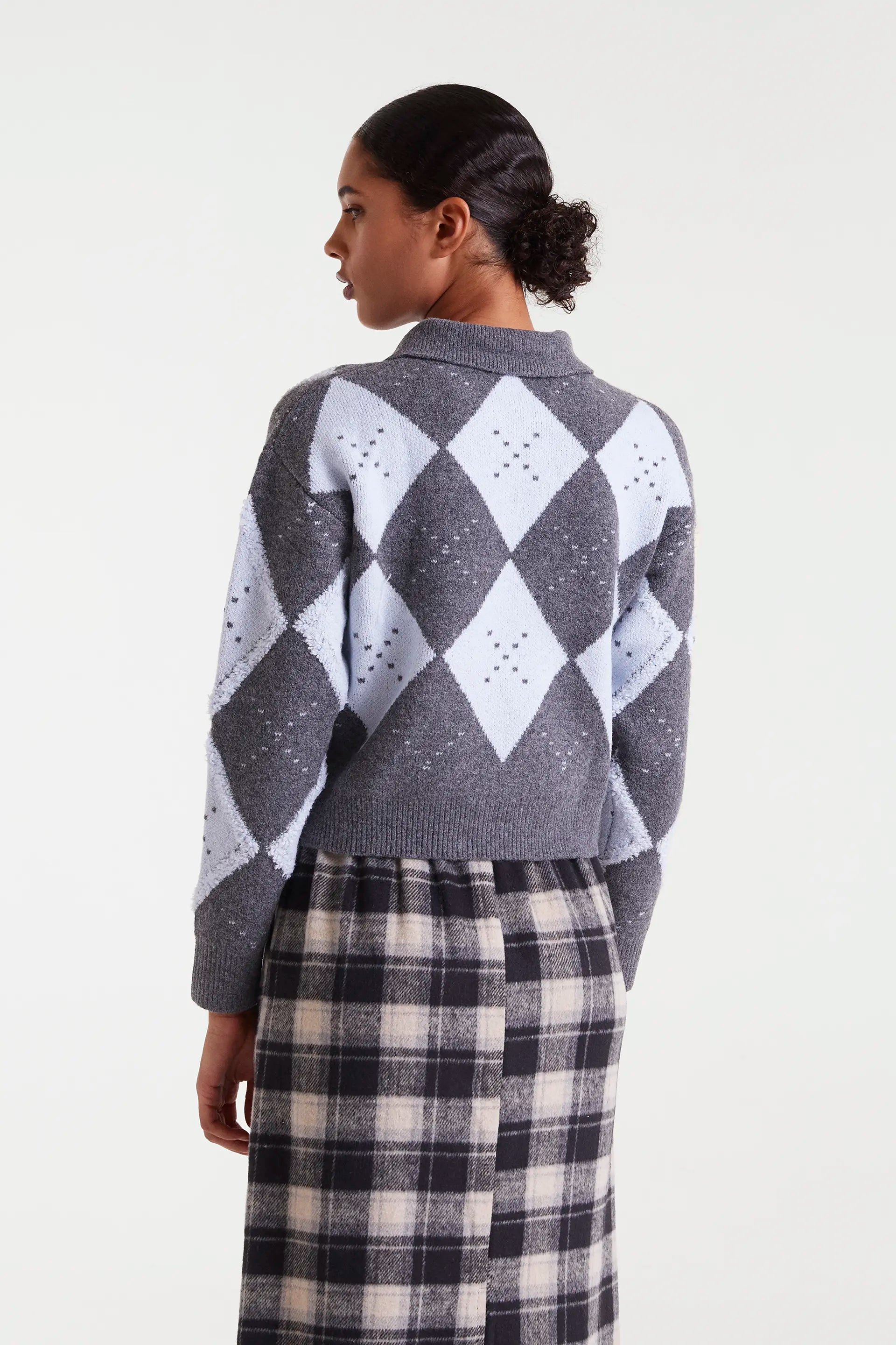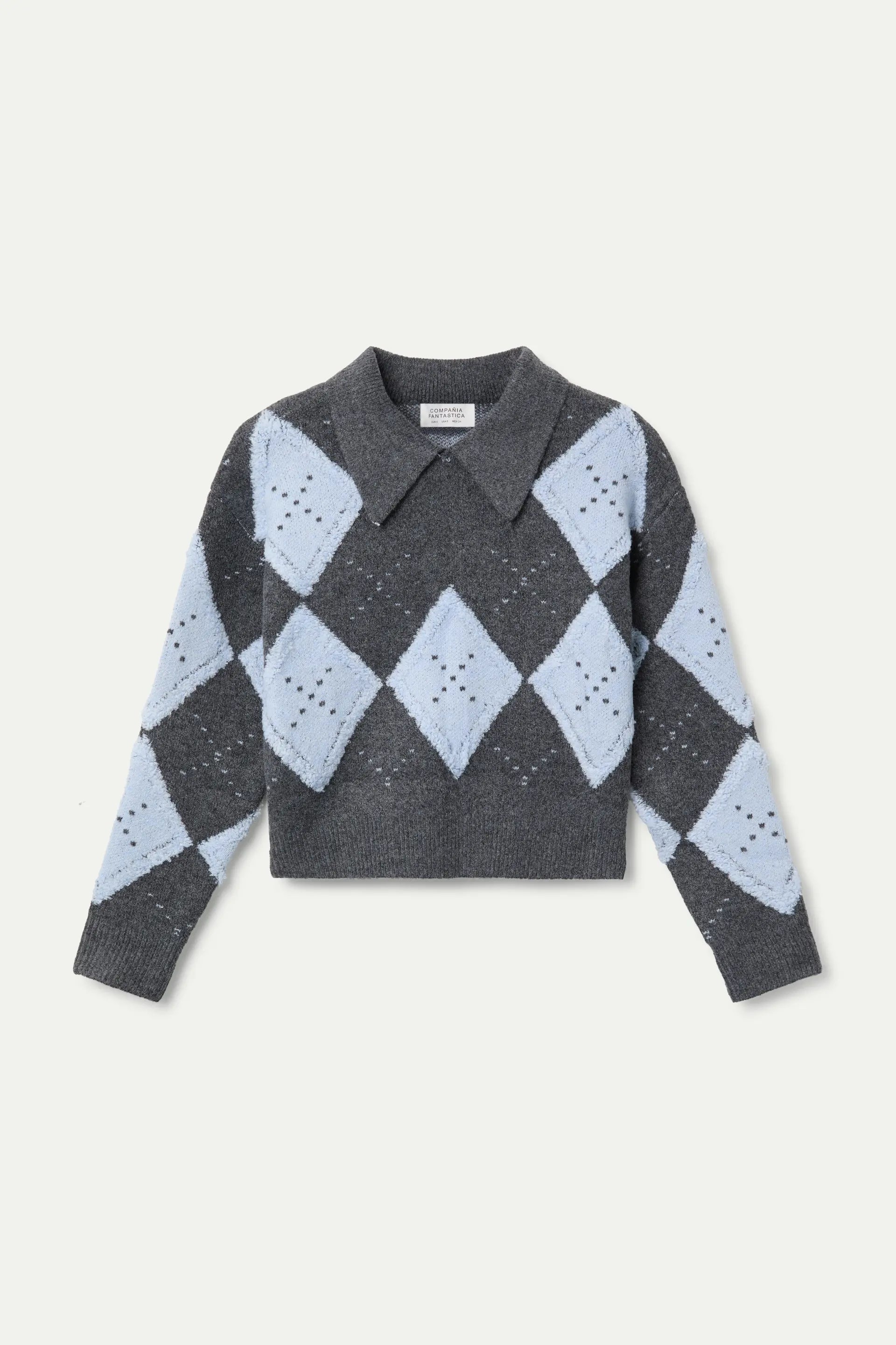 Maglione jacquard grigio e blu con collo a revers e maniche lunghe. Spalle leggermente scese. Dettagli ricamati a rombi e finiture a costine. La modella è alta 175 cm e indossa una taglia S.