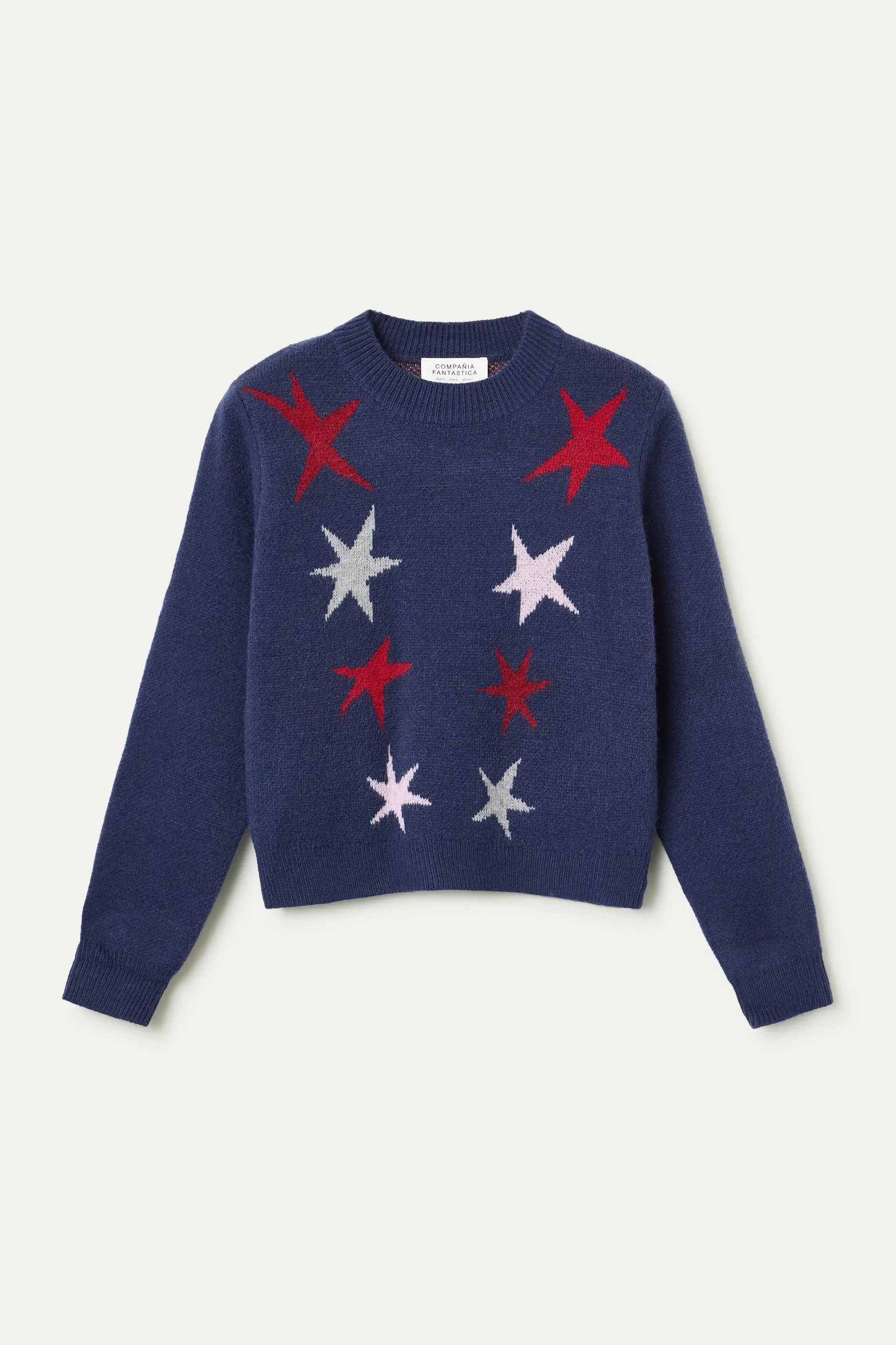 Jersey de tejido jacquard con estampado de estrellas multicolor. Cuello redondo y manga larga.
