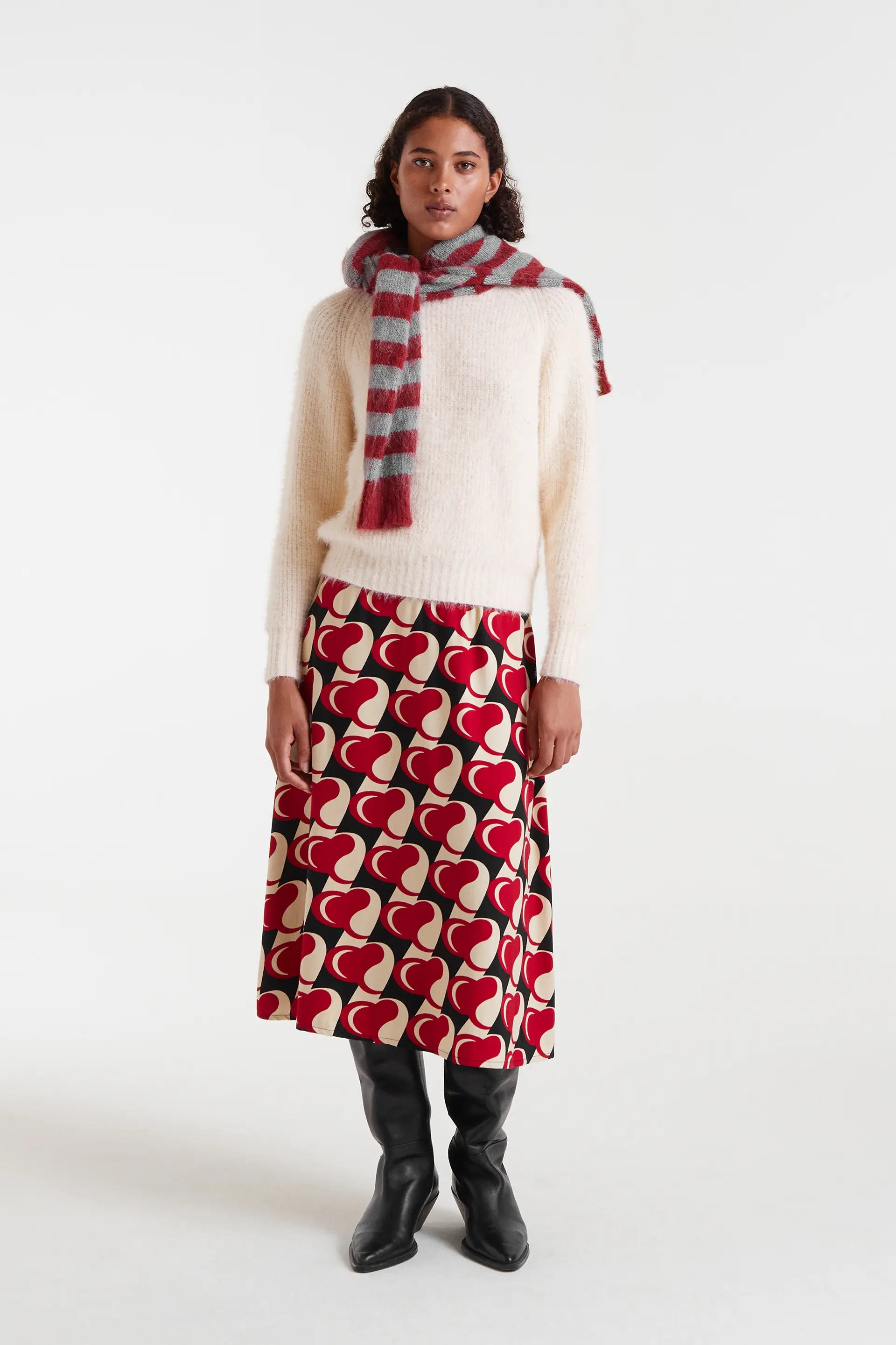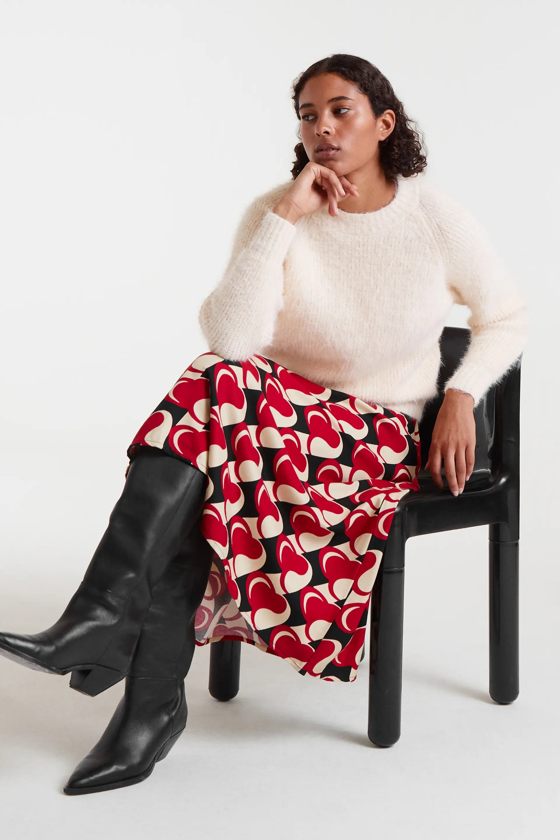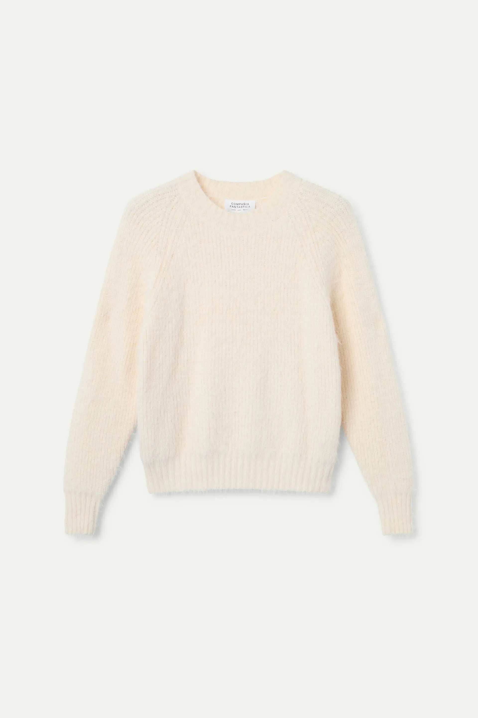 Maglione bianco in maglia testurizzata con scollo rotondo e maniche lunghe. Dettagli a coste. La modella è alta 175 cm e indossa una taglia S.