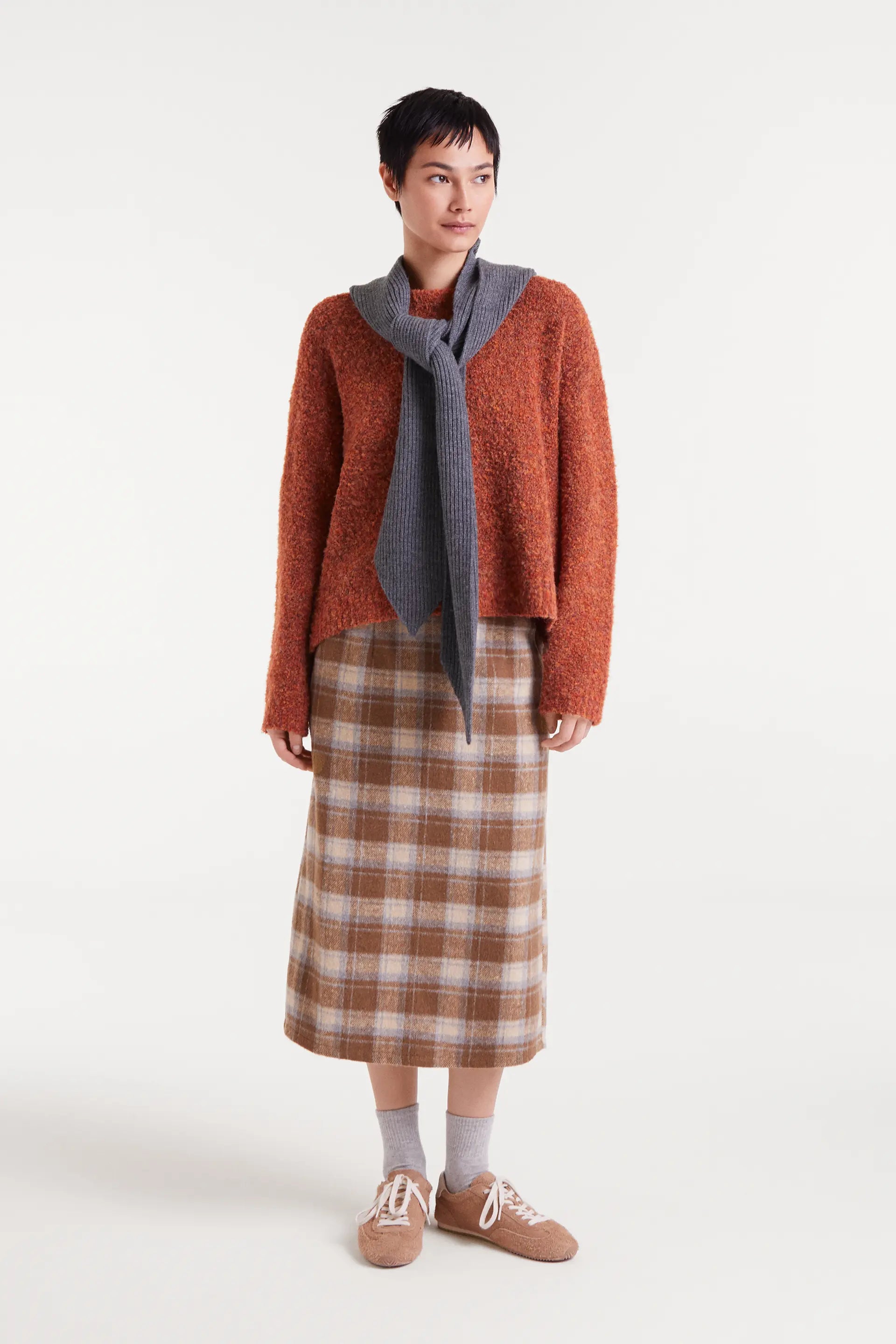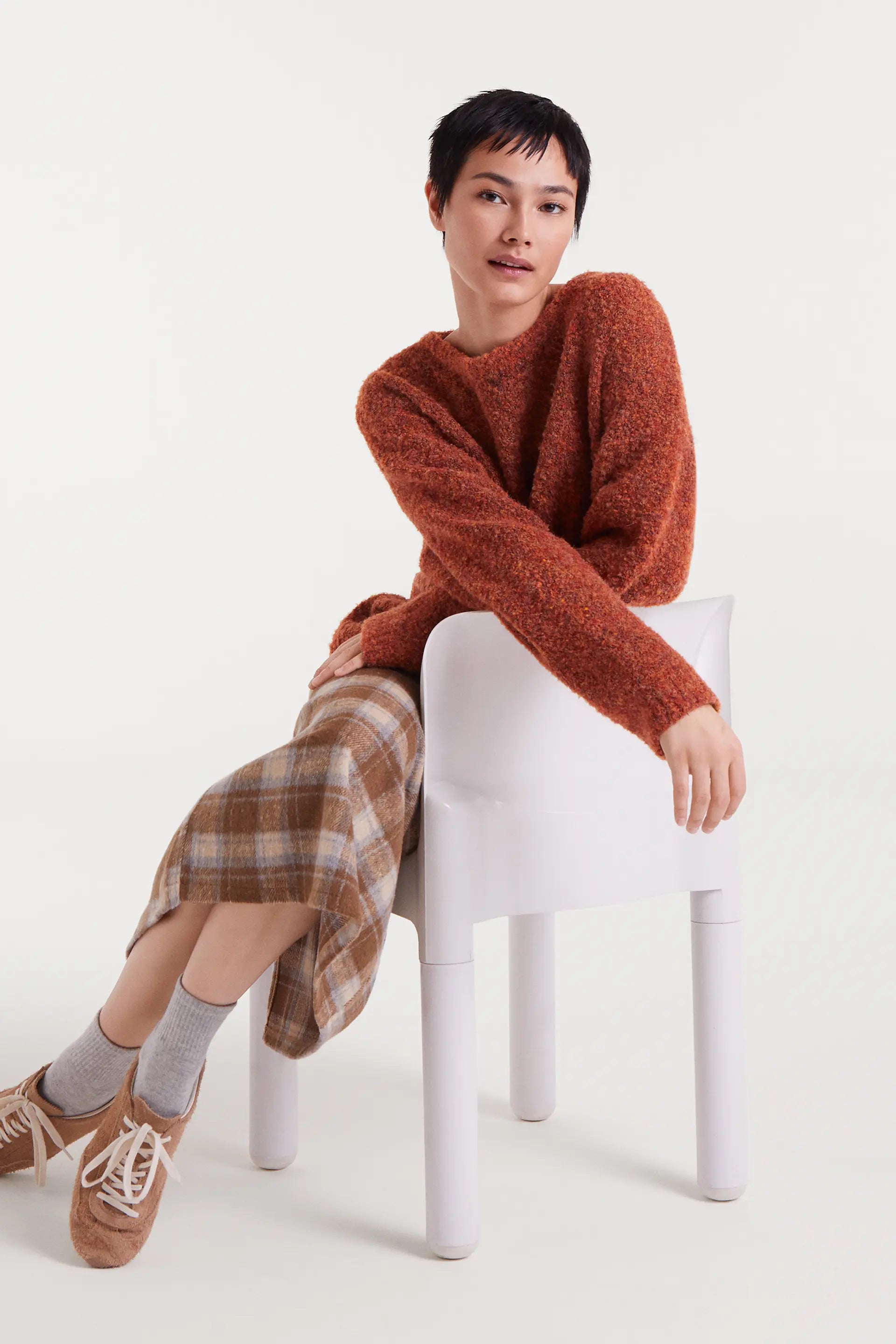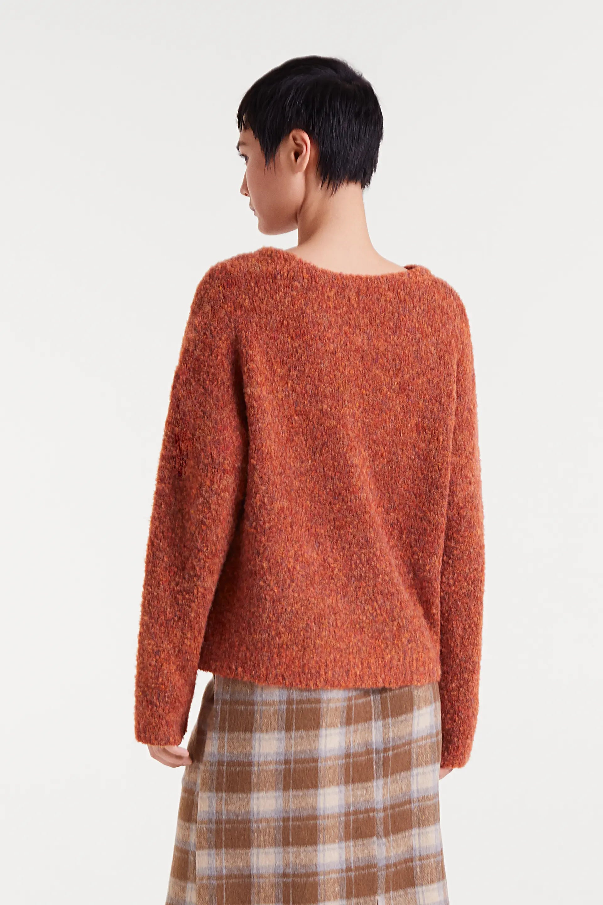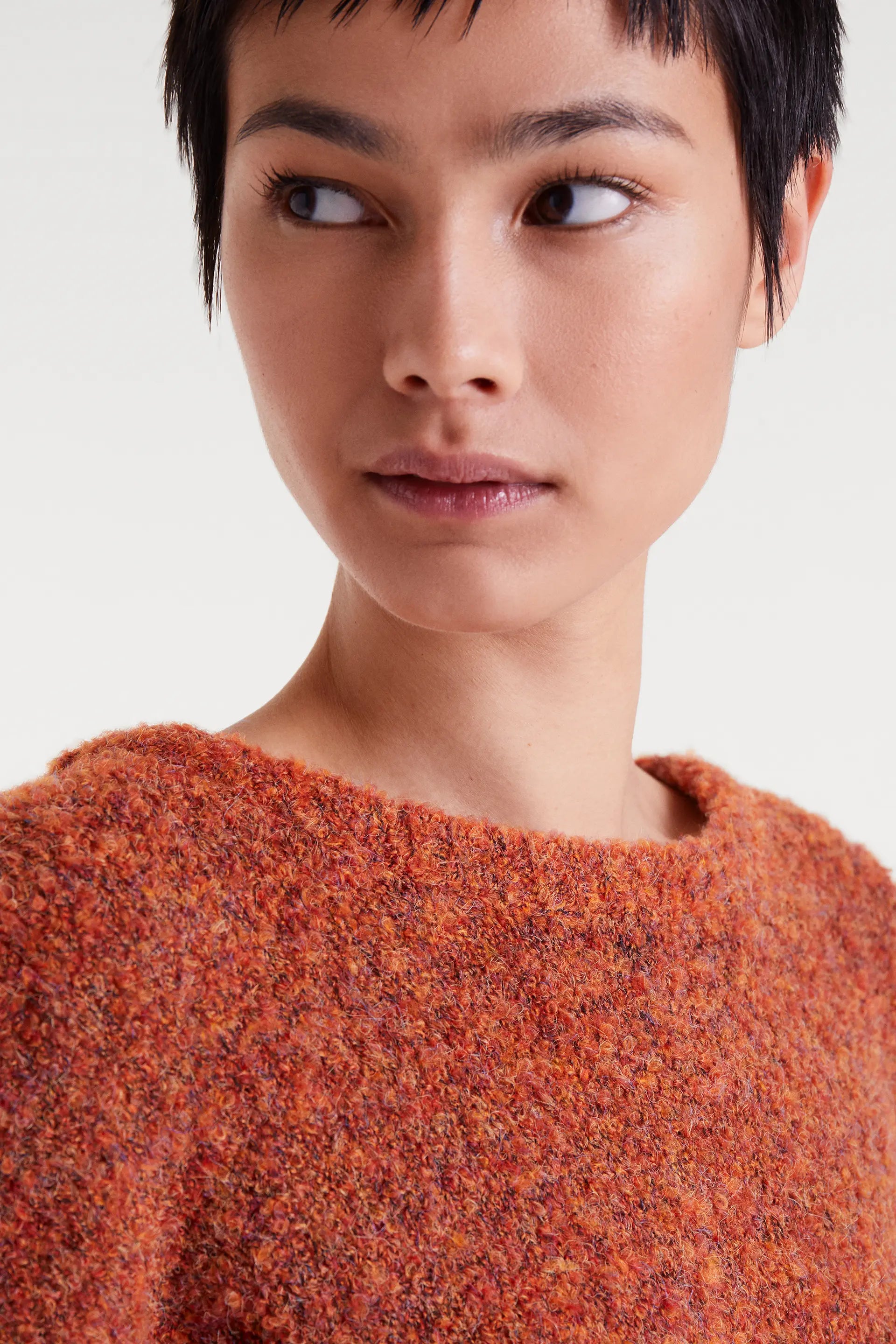 Maglione arancione testurizzato con scollo a barca e maniche lunghe. Spalle leggermente scese. La modella è alta 177 cm e indossa una taglia S.