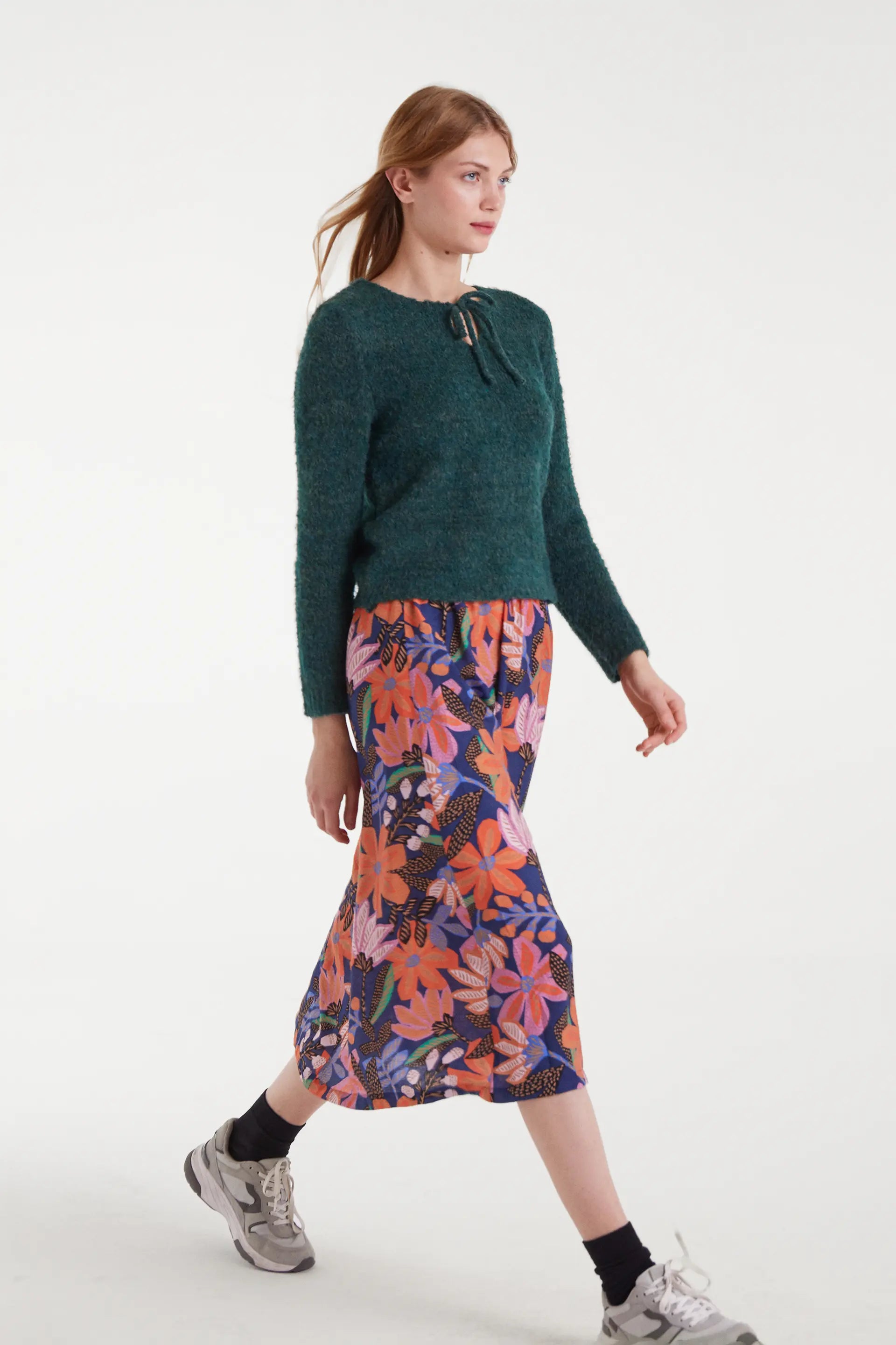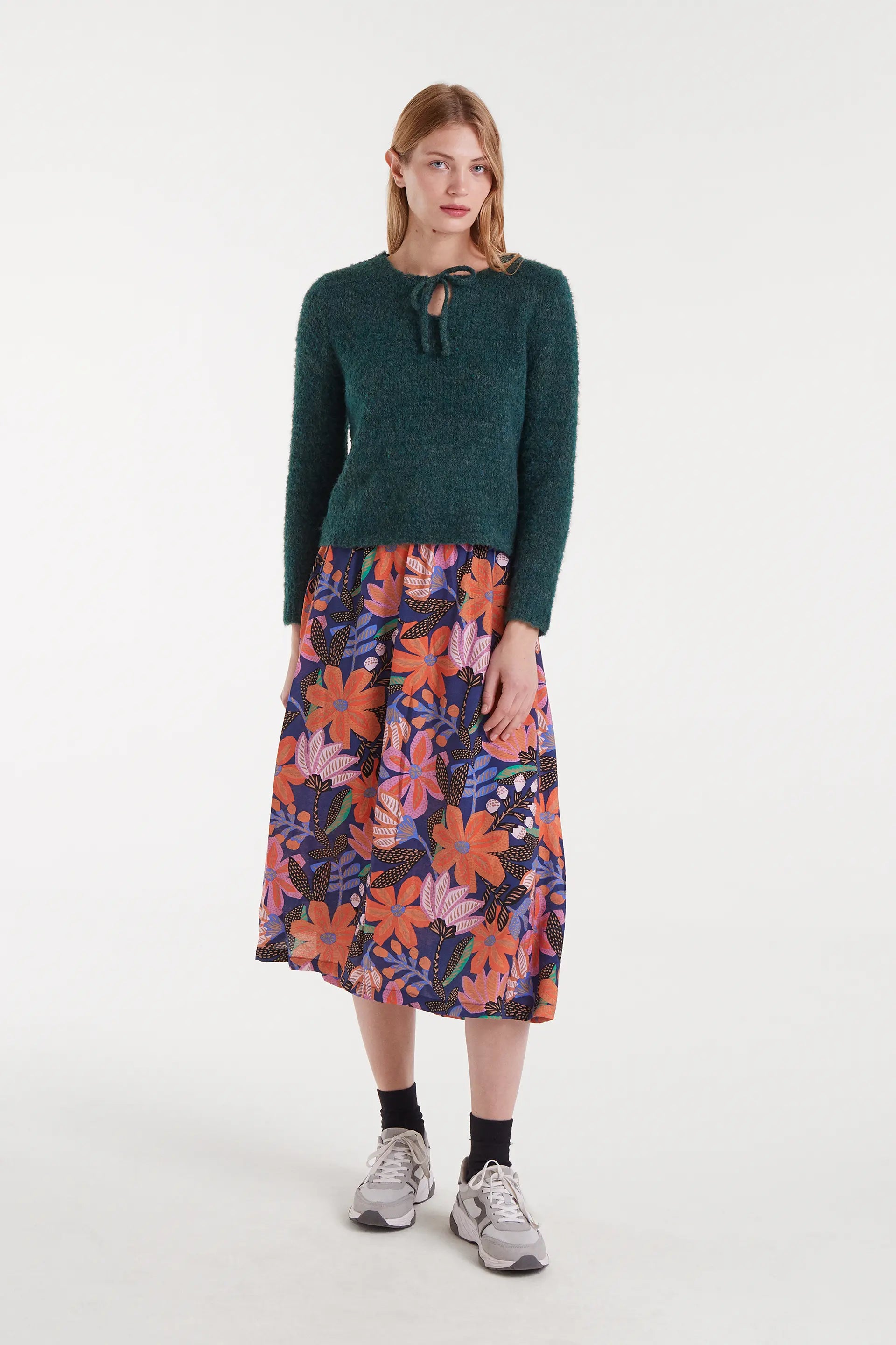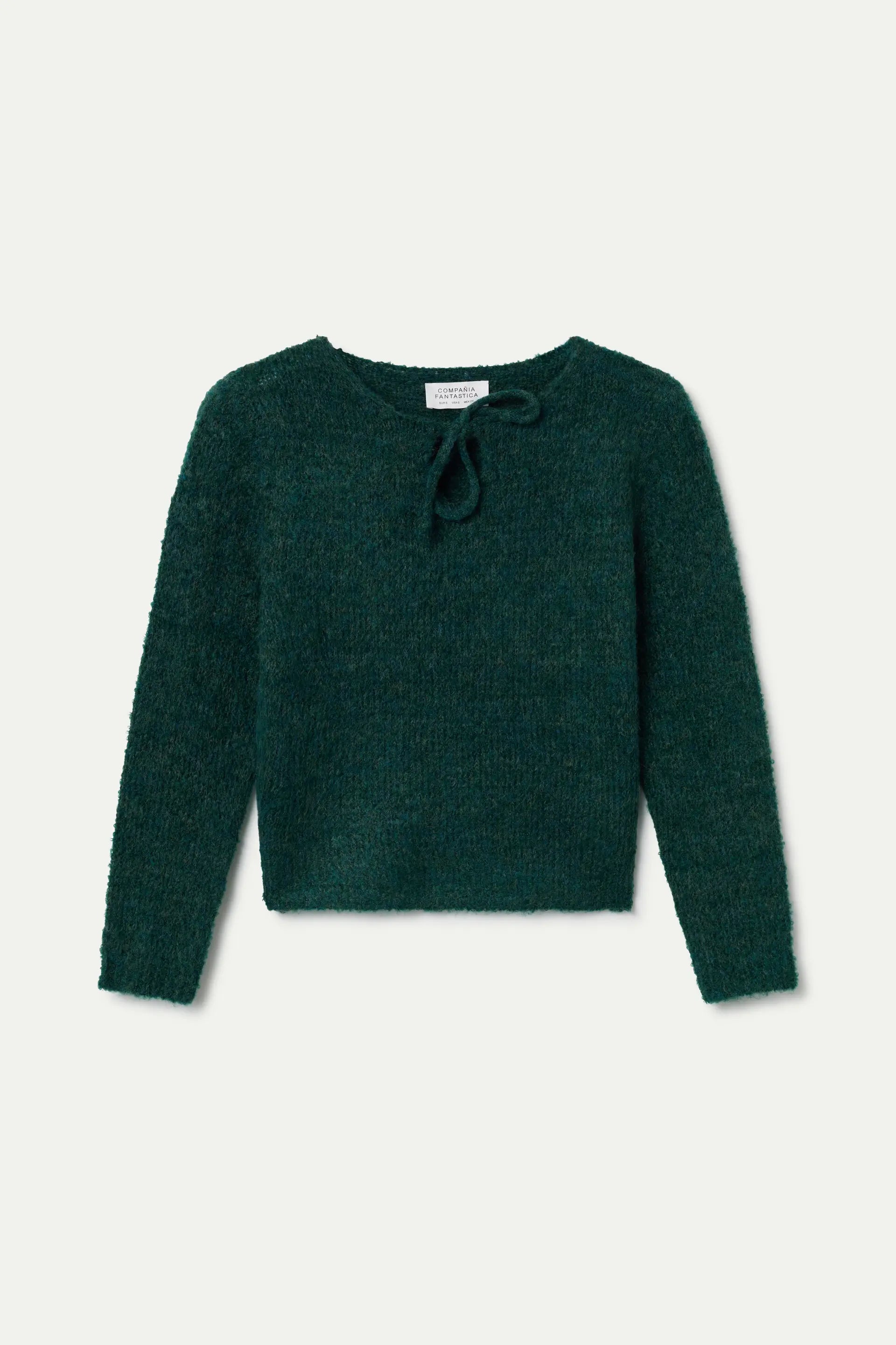 Maglione verde in maglia testurizzata. Scollo rotondo con fiocco. Maniche lunghe. La modella è alta 179 cm e indossa una taglia S.
