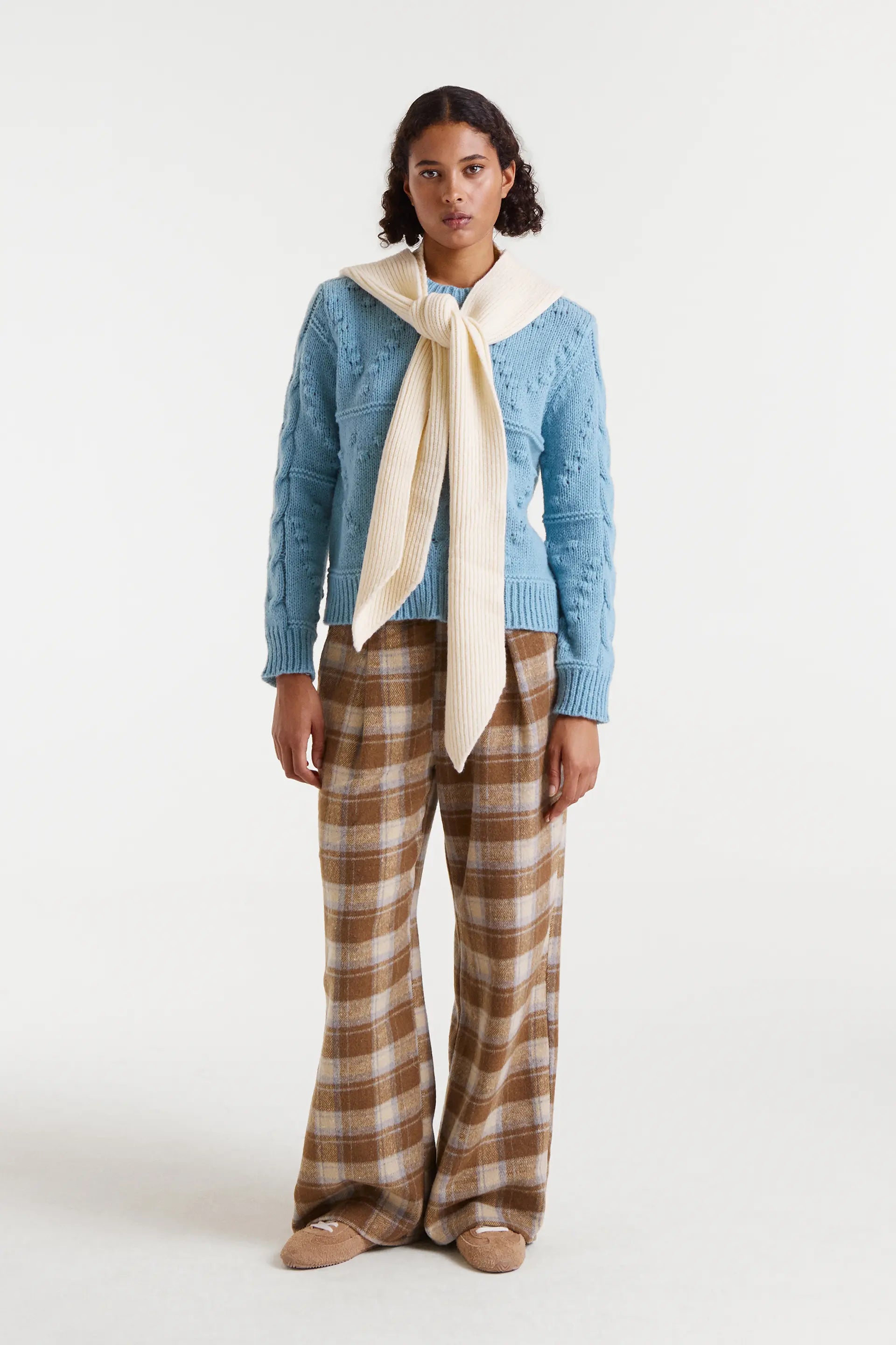 Maglione blu a trecce con scollo rotondo e maniche lunghe. Dettagli a coste. La modella è alta 175 cm e indossa una taglia S.