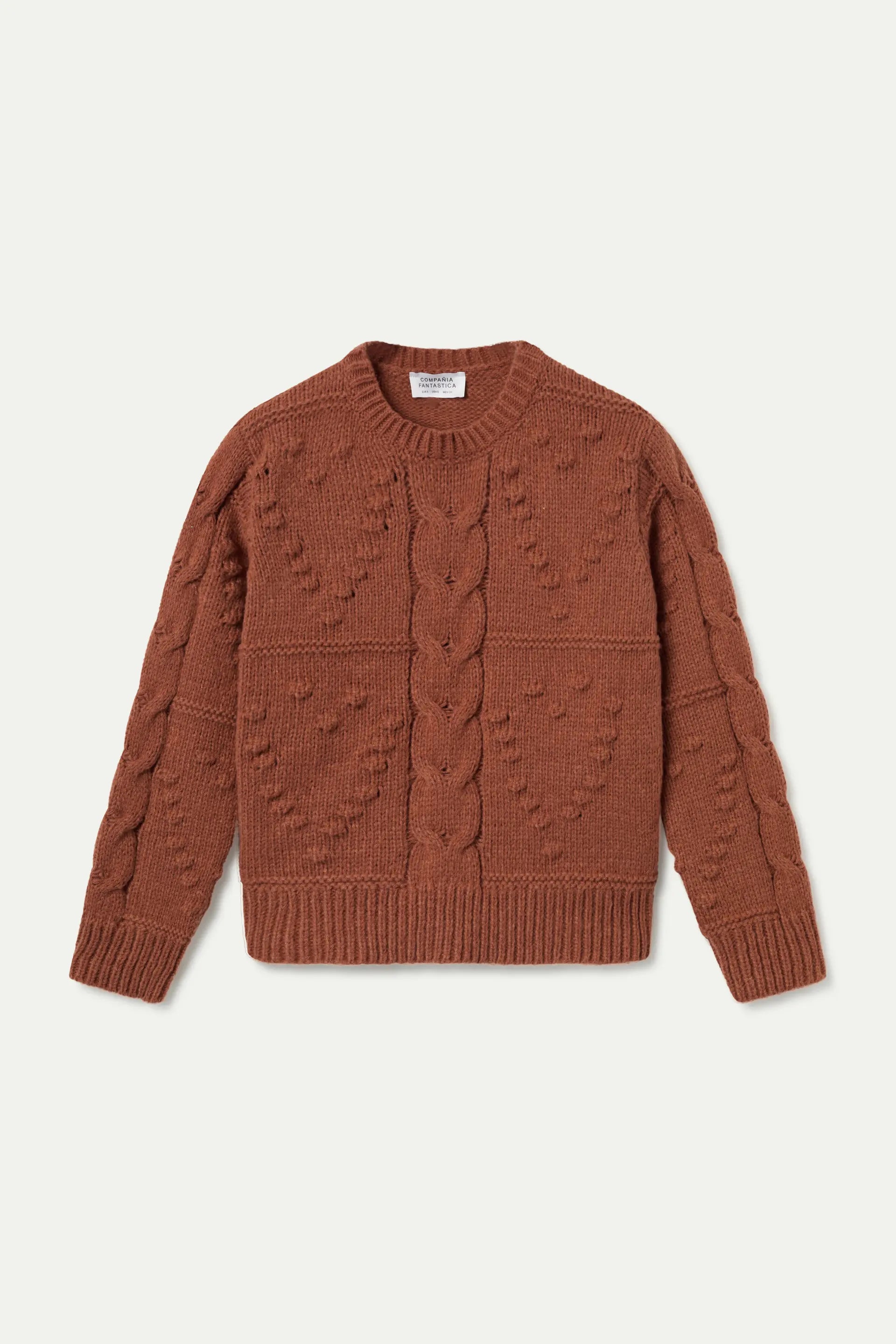 Maglione marrone a trecce con scollo rotondo e maniche lunghe. Dettagli a coste. La modella è alta 175 cm e indossa una taglia S.