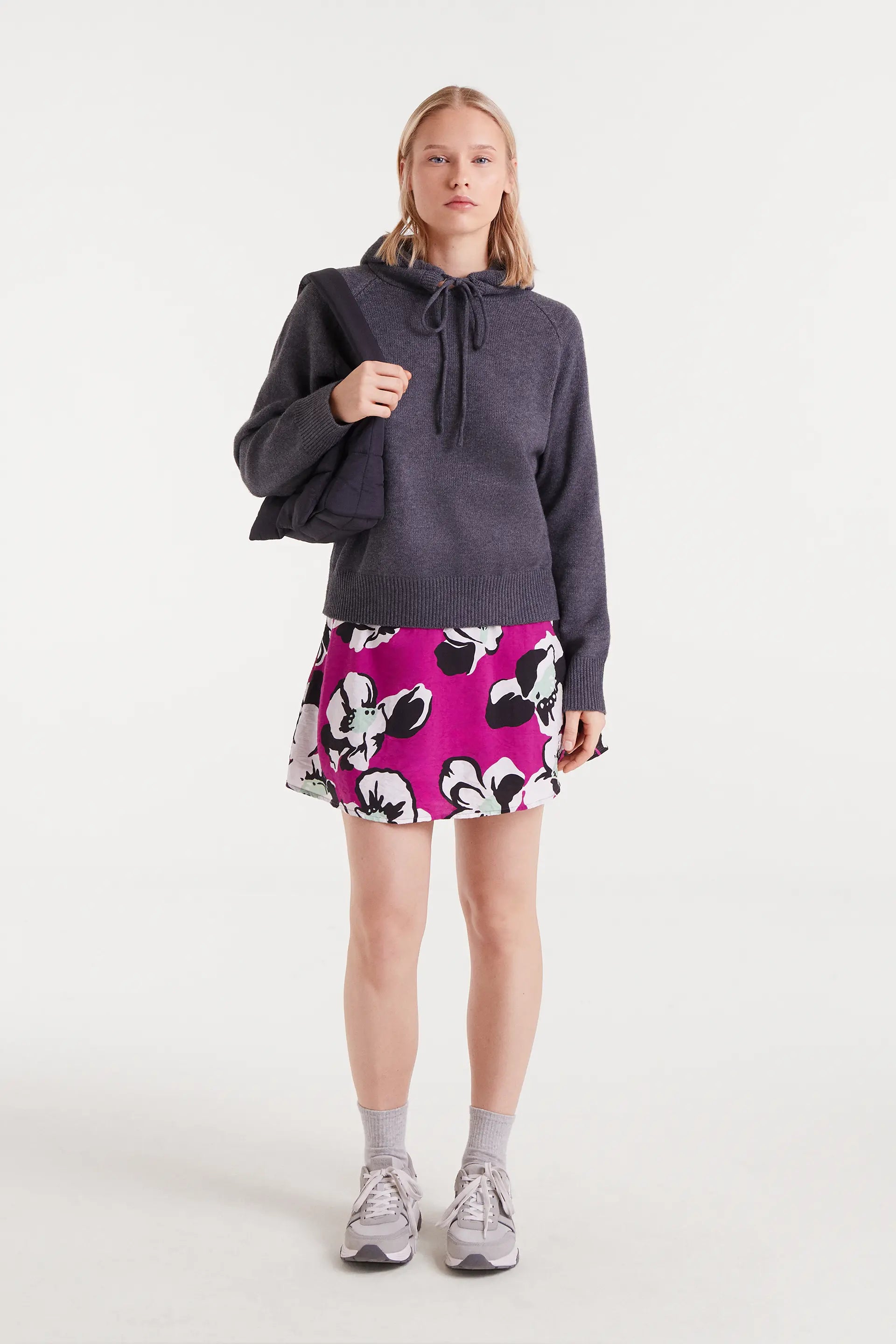 Maglione grigio a maglia fine. Presenta un cappuccio regolabile con coulisse e maniche lunghe. Spalle leggermente scese. Dettagli a coste. La modella è alta 174 cm e indossa una taglia S.