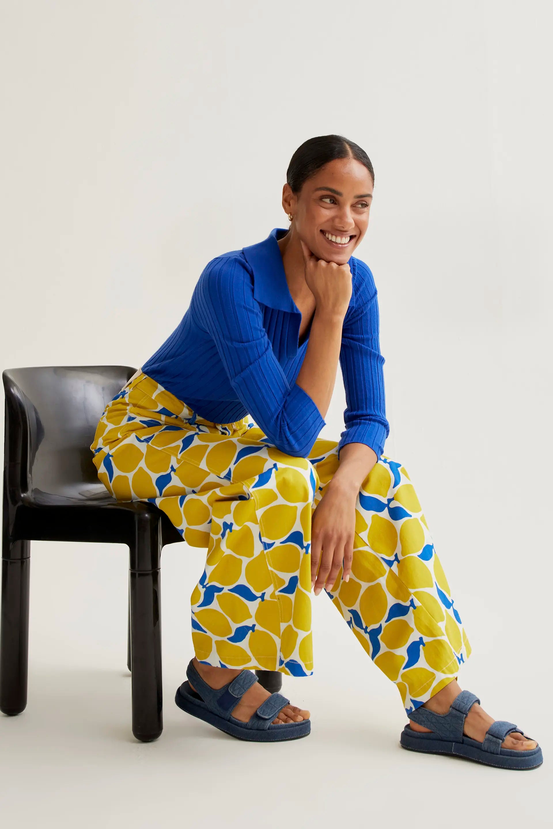 Pantaloni in 100% cotone con stampa limoncello. Vita alta con cinturino fisso. Chiusura frontale con zip e bottone. Gamba ampia e dritta. Tasche laterali e posteriori. La modella è alta 173 cm e indossa una taglia S.