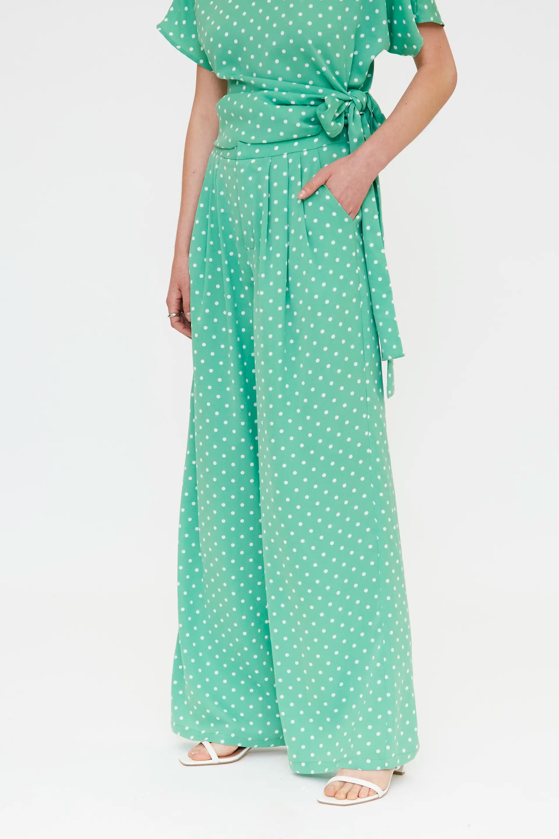 Pantaloni in crêpe verde con stampa a pois bianchi. Vita alta, elastico fisso e gamba ampia e dritta. Tasca laterale. La modella è alta 177 cm e indossa una taglia S.