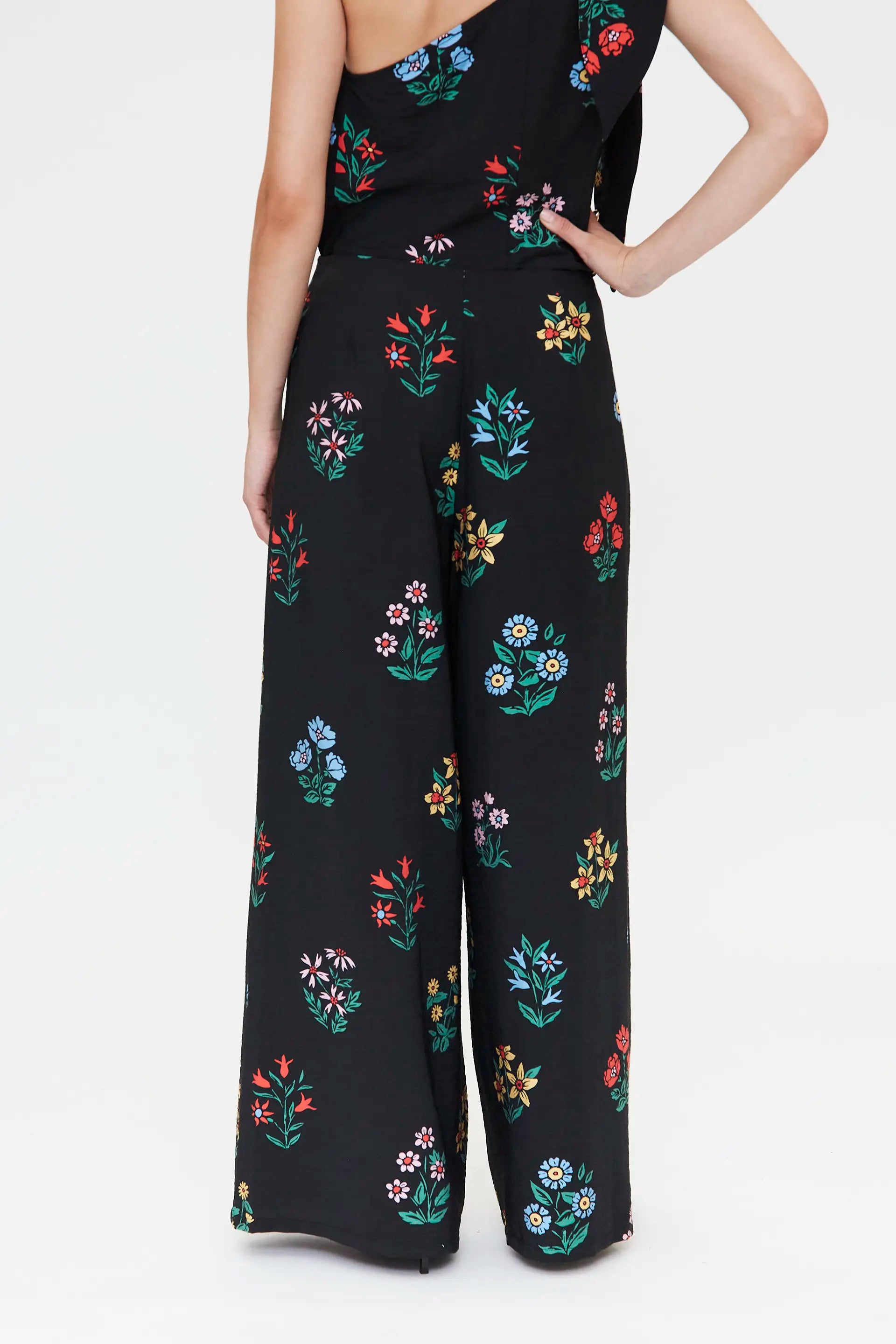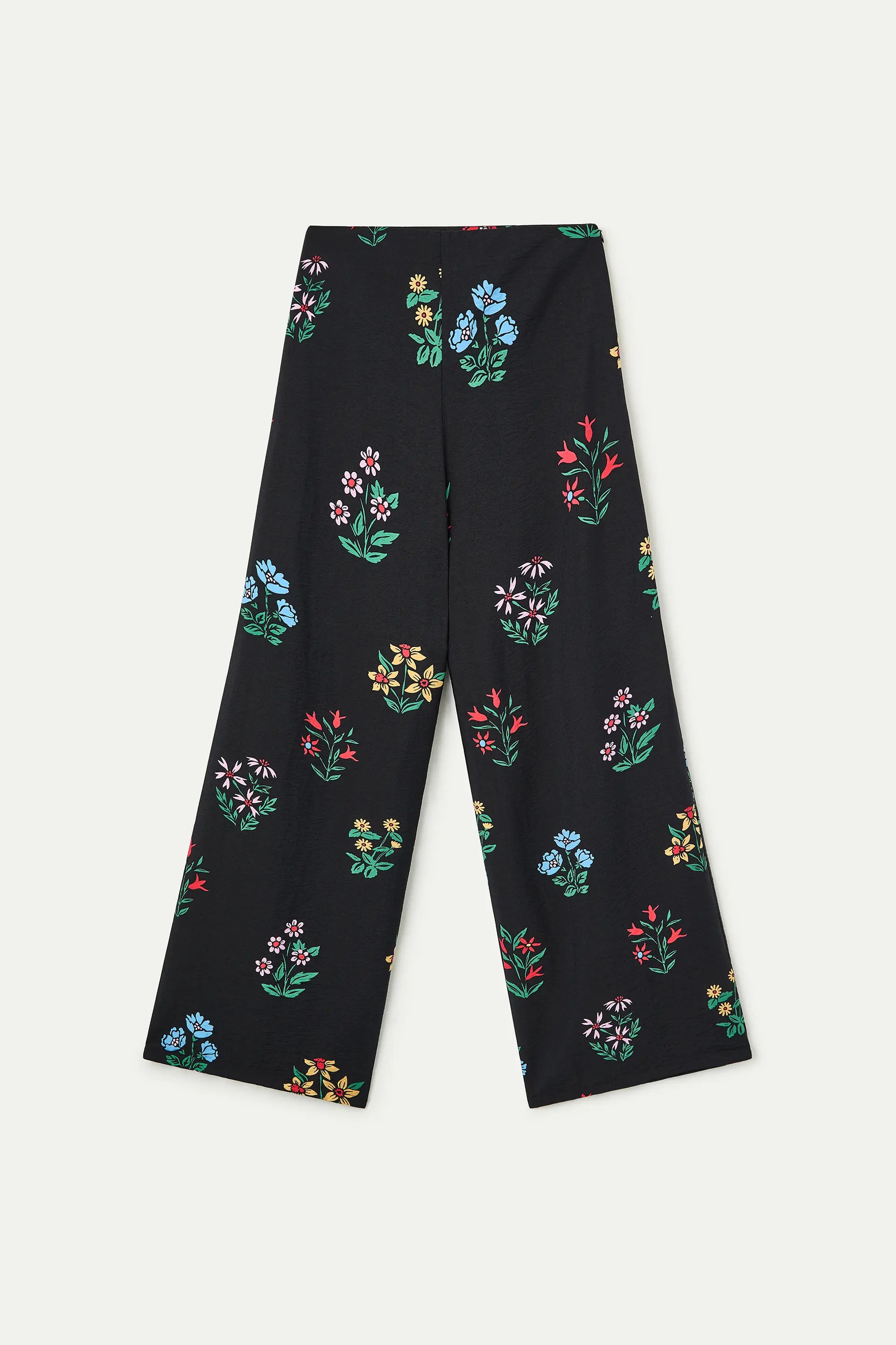 Pantaloni in crêpe con stampa multicolore raffigurante un giardiniere. Vita alta, cintura fissa e gamba larga. Chiusura con zip nascosta. La modella è alta 175 cm e indossa una taglia S.