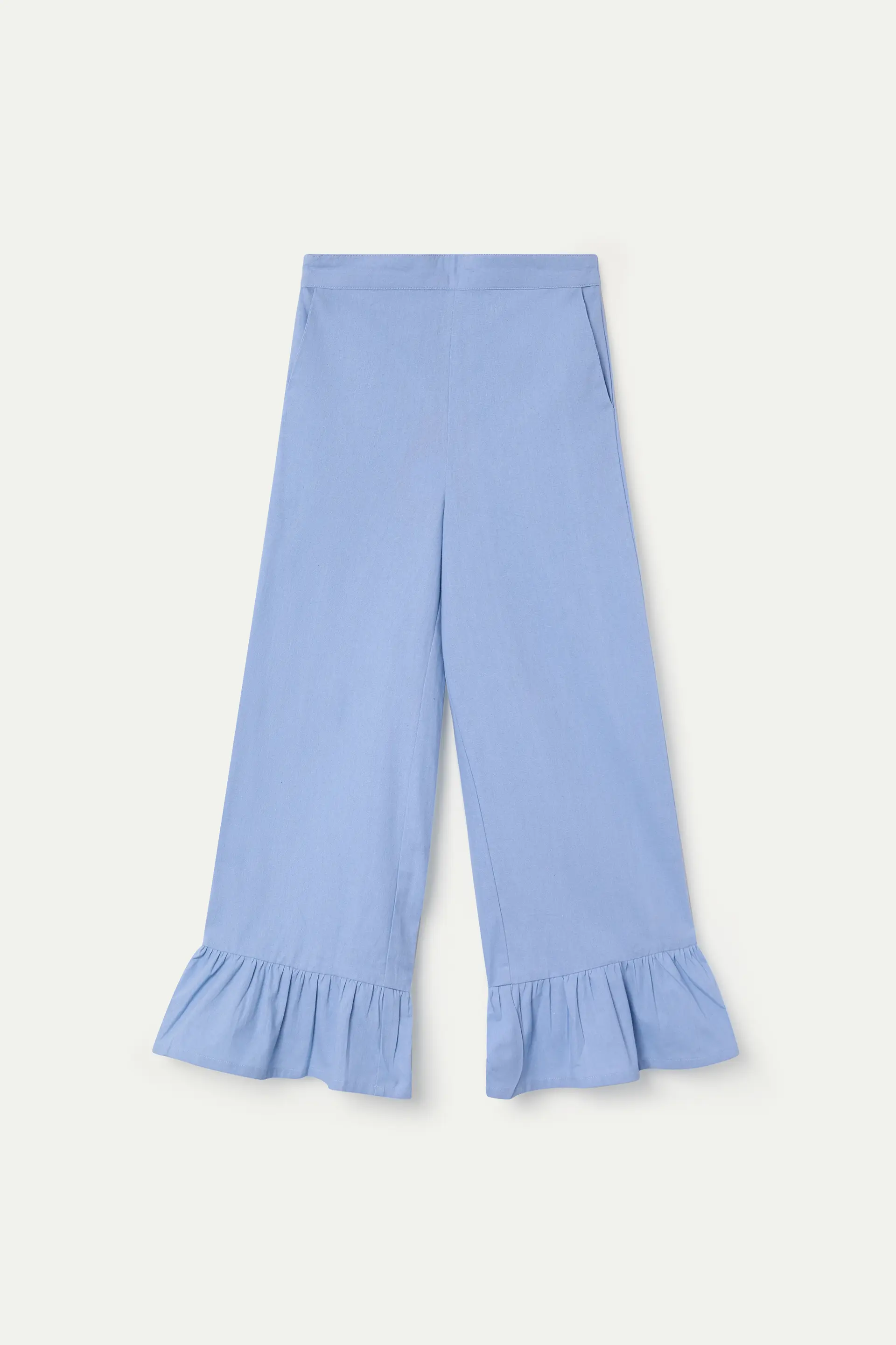 Pantaloni da bambina in 100% cotone, blu. Vita alta con elastico. Gamba dritta. Dettaglio volant. La modella è alta 126 cm e indossa la taglia 8-9 anni.