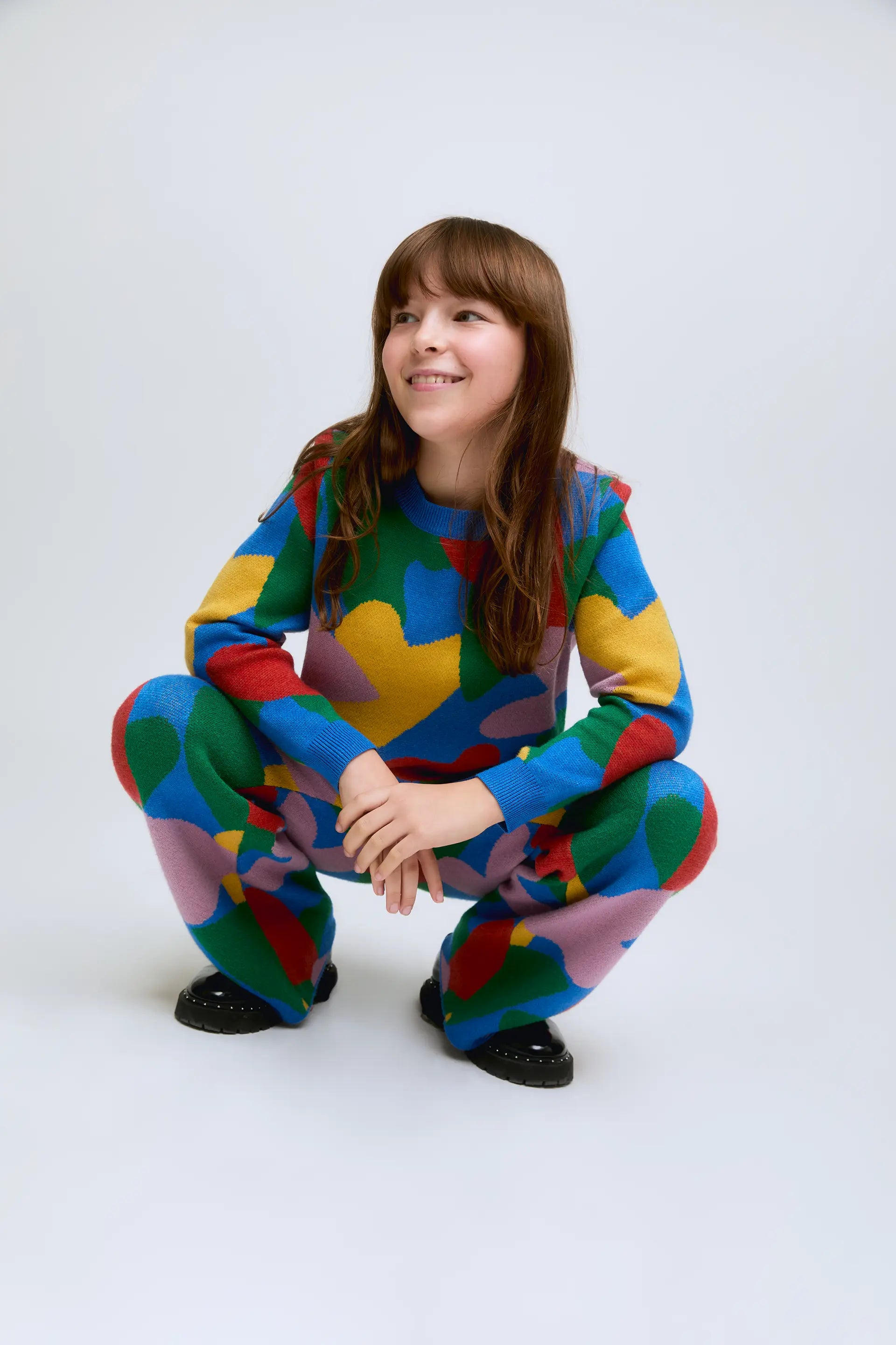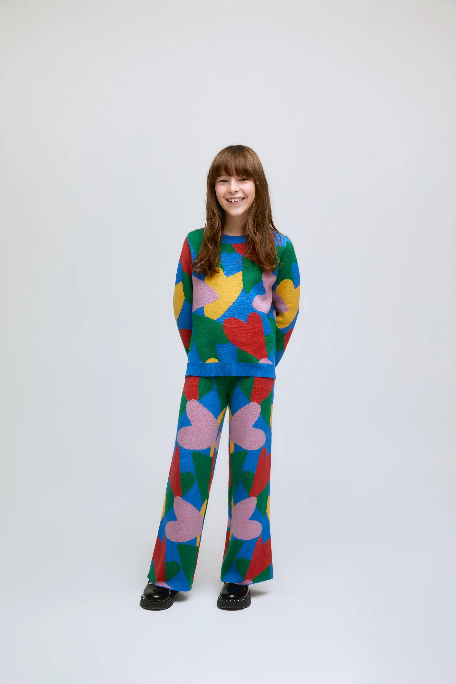 Pantaloni lunghi da bambina in maglia jacquard blu con stampa Cupido di cuori colorati. Elastico in vita e gamba dritta.