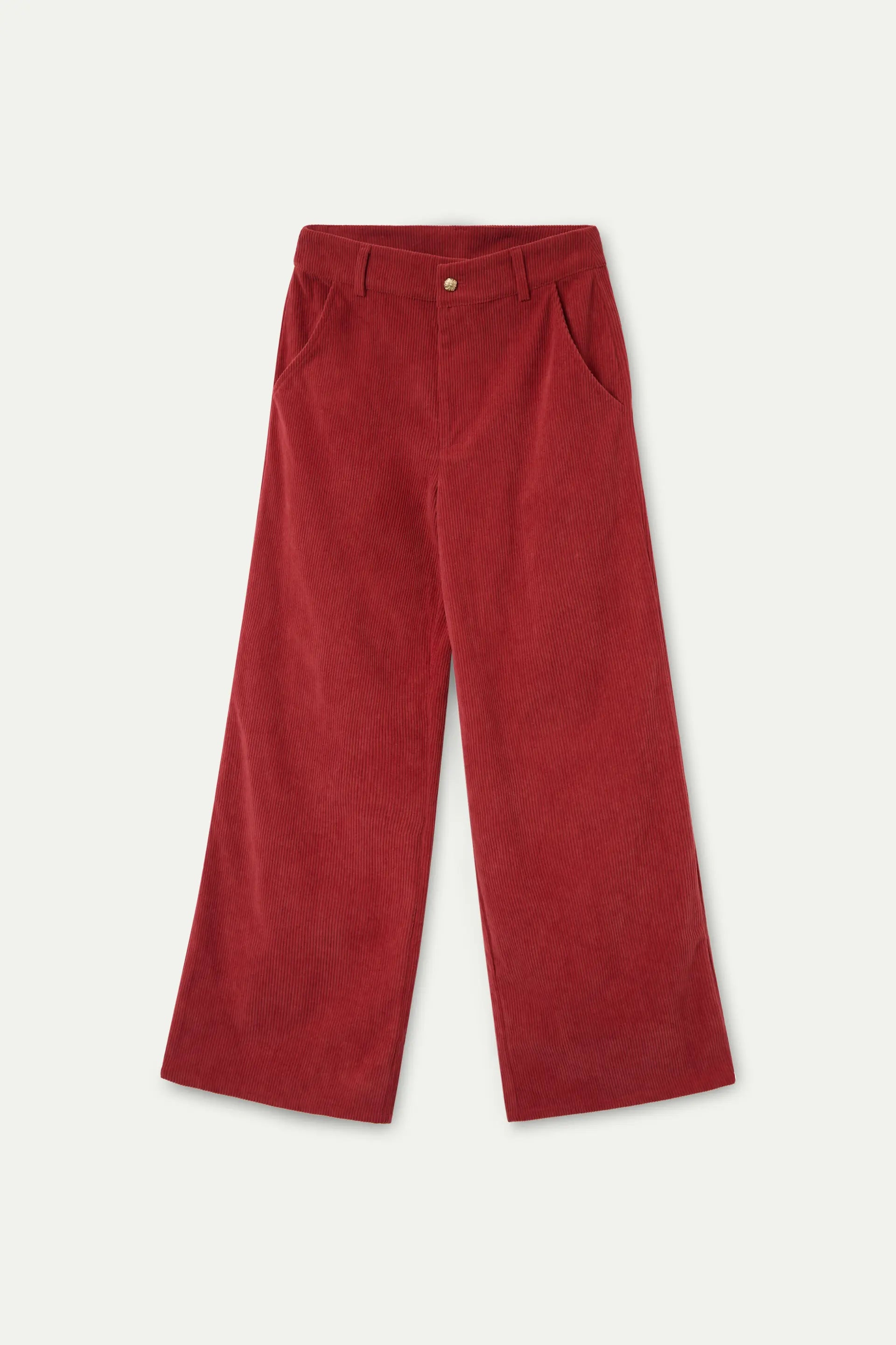 Pantaloni in velluto a coste marrone con vita media, vita fissa e gamba dritta. Chiusura frontale con cerniera e bottone in metallo. Tasche laterali. La modella è alta 179 cm e indossa una taglia S.