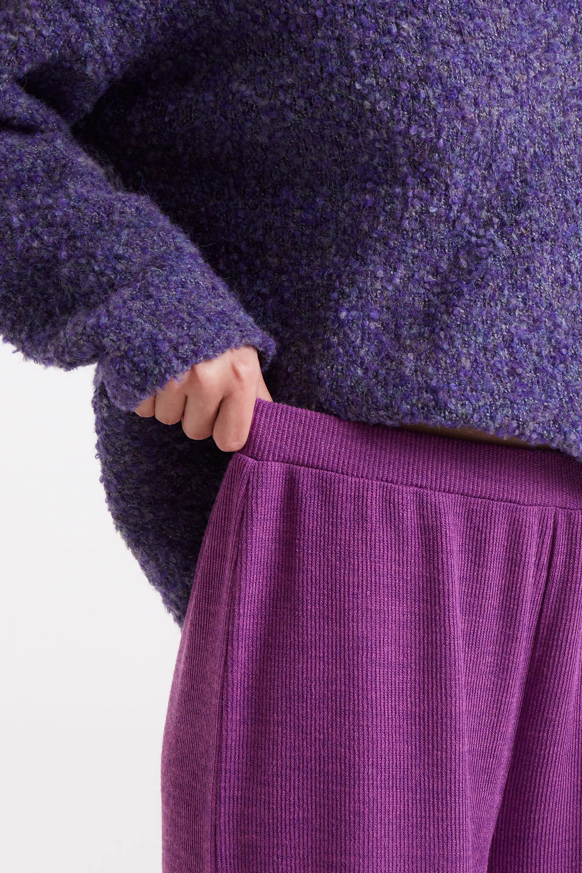 Pantaloni in maglia a coste color magenta con elastico in vita alto e gamba dritta. La modella è alta 175 cm e indossa una taglia S.