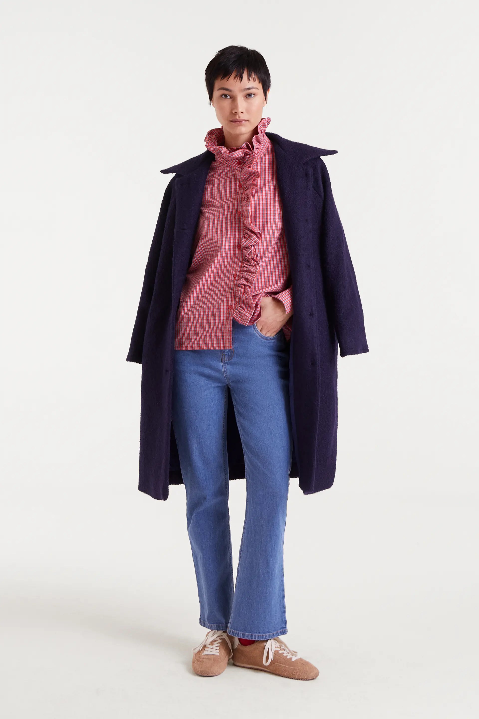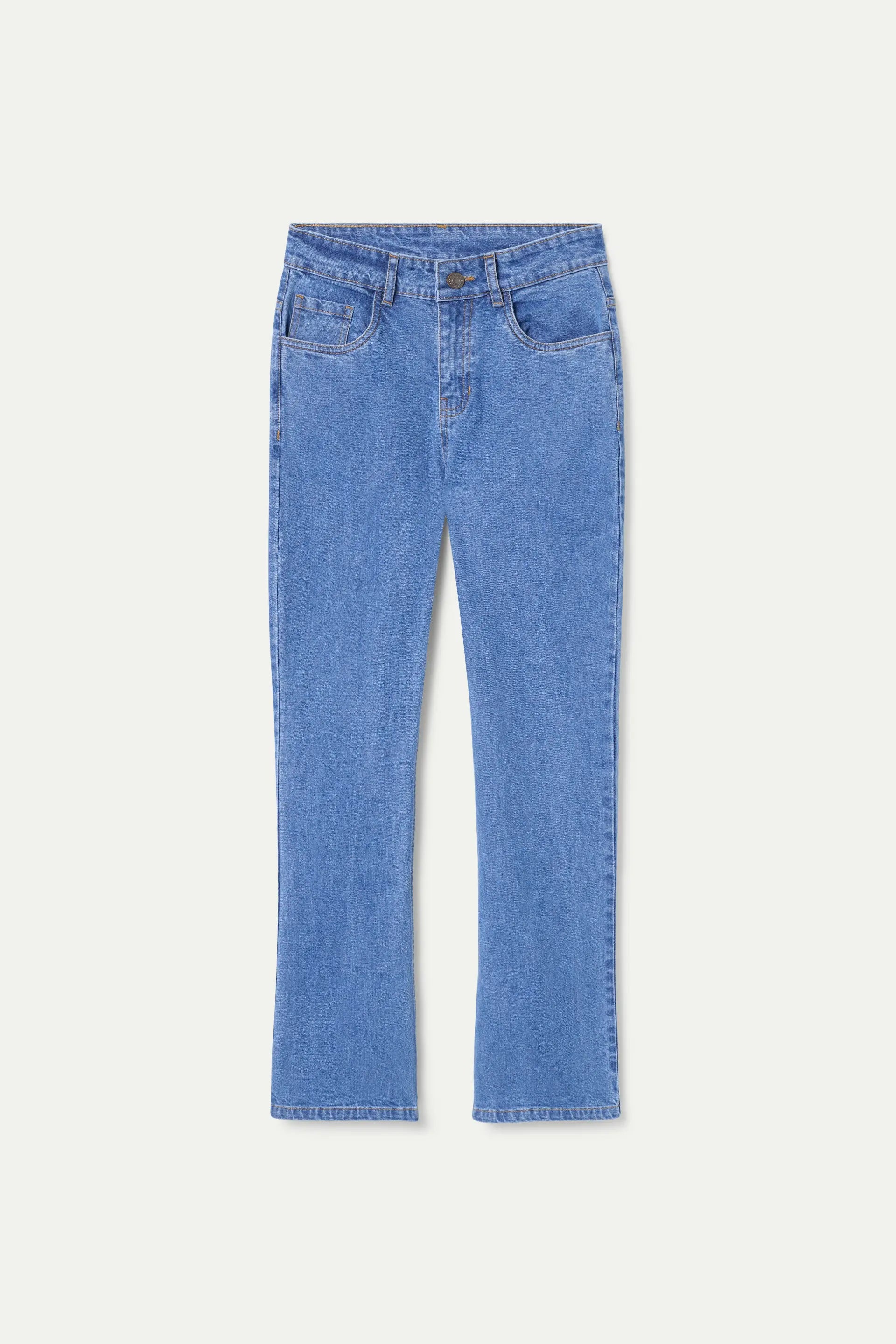 Jeans in denim elasticizzato blu. Vita alta e gamba dritta. Chiusura frontale con zip e bottone. Tasche laterali e posteriori. La modella è alta 177 cm e indossa una taglia S.