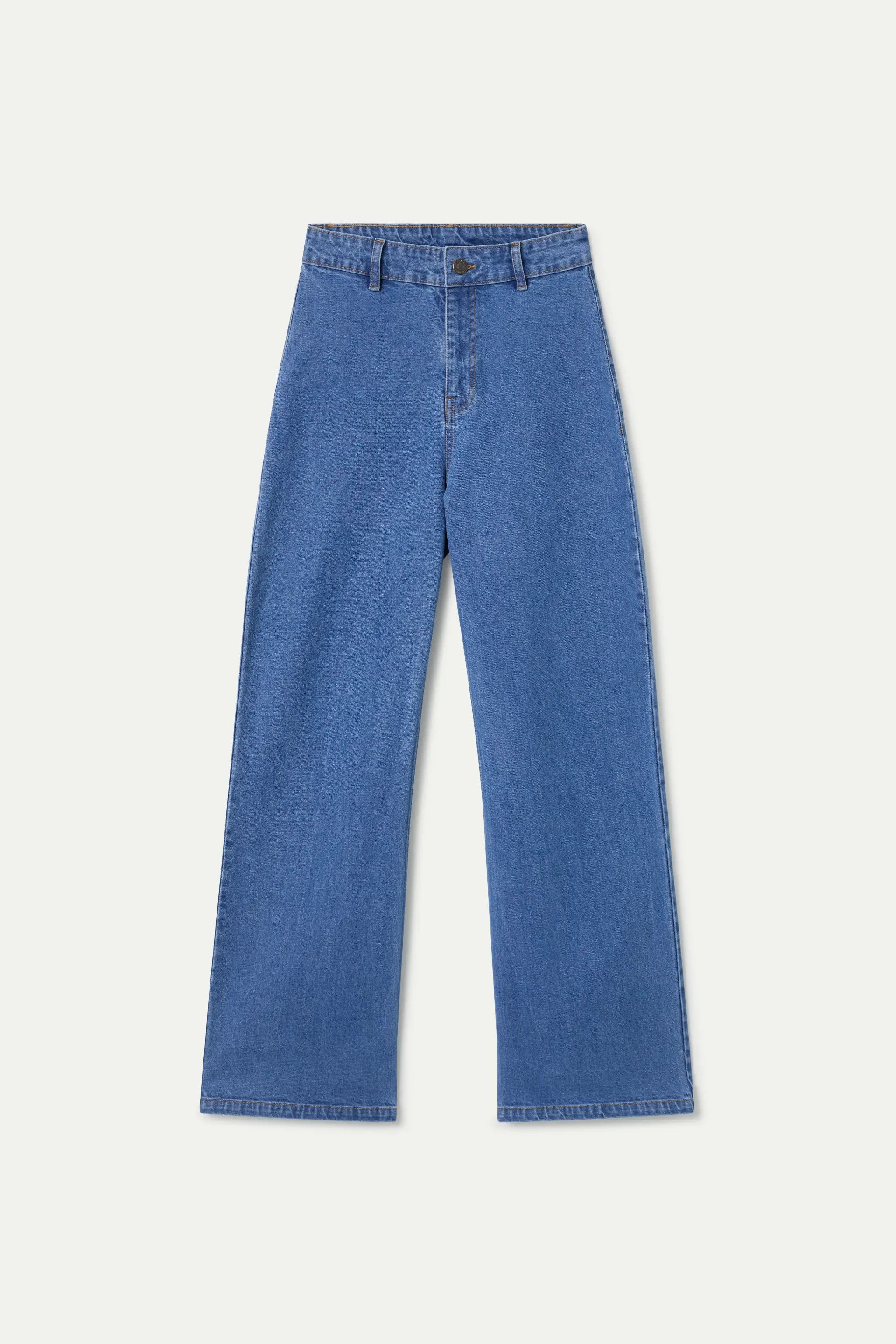 Jeans in denim elasticizzato nero a vita alta e gamba dritta. Chiusura frontale con zip e bottone. Tasche laterali. Dettaglio a cuore ricamato sulle tasche posteriori. La modella è alta 177 cm e indossa una taglia S.