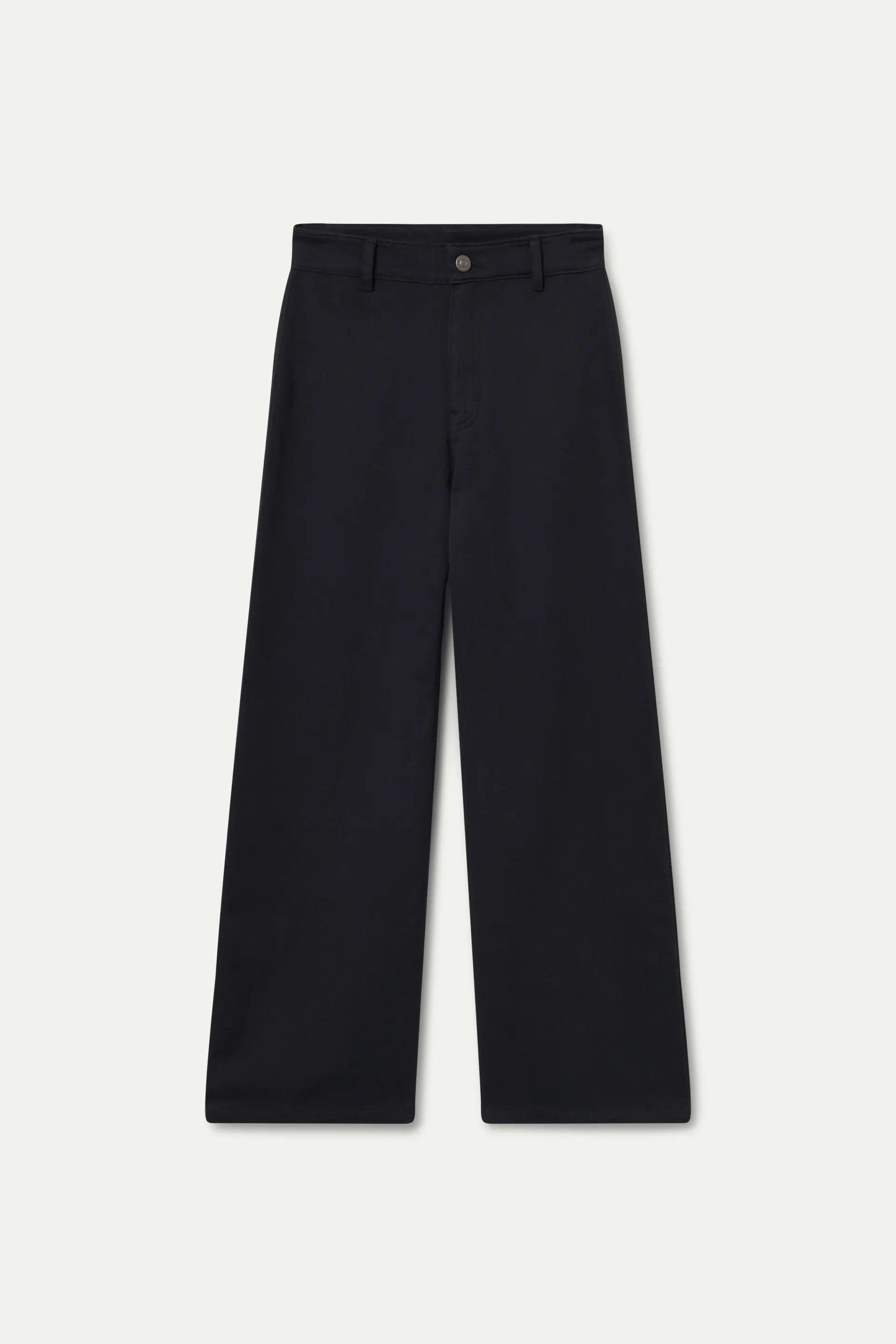 Jeans in denim elasticizzato nero. Vita alta e gamba dritta. Chiusura frontale con zip e bottone. Tasche laterali e posteriori. La modella è alta 174 cm e indossa una taglia S.