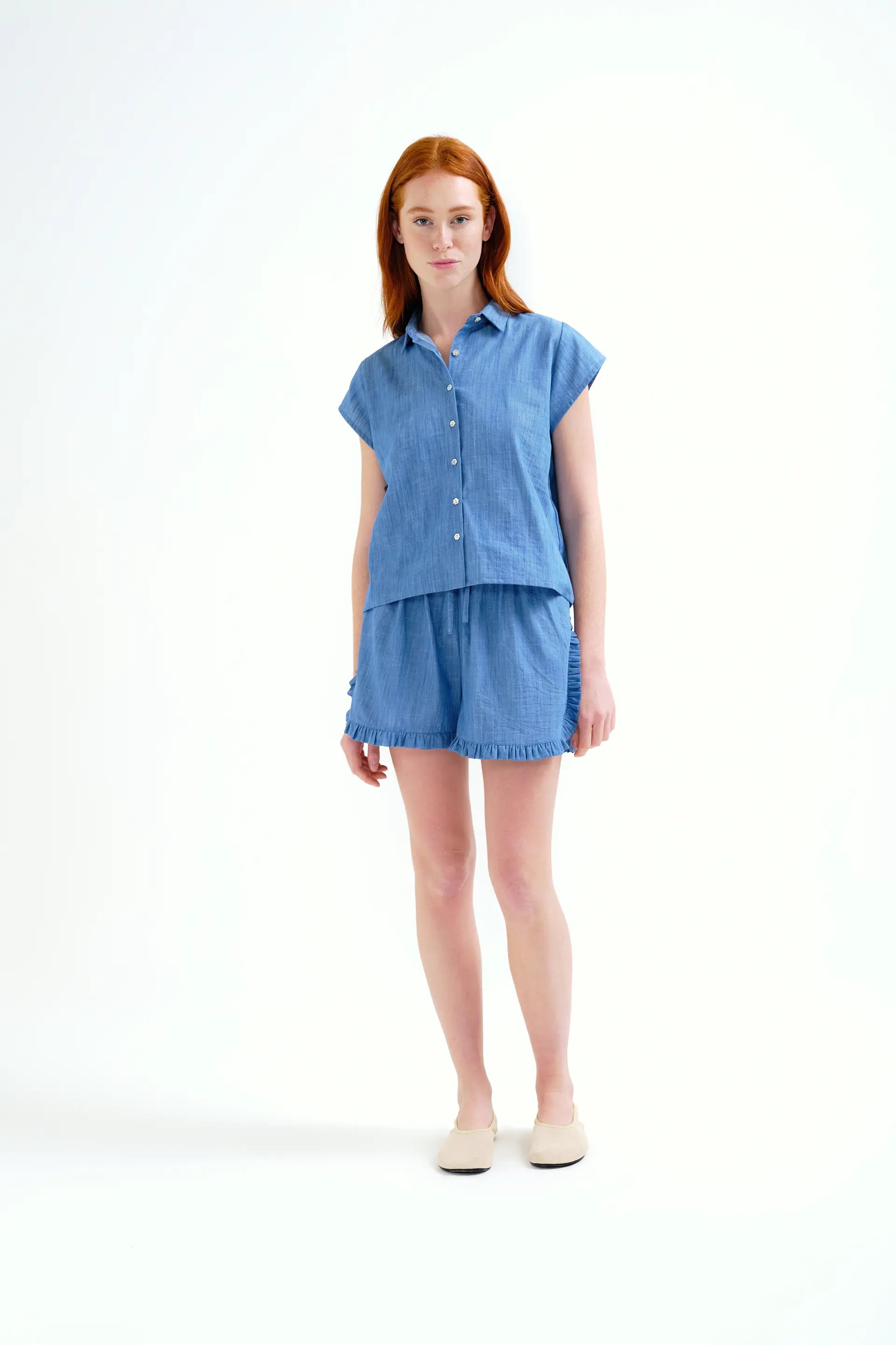 Shorts realizzati in tessuto chambray 100% cotone, colore azzurro. Vita alta con elastico e coulisse regolabili. Tasche laterali. Dettagli volant. La modella è alta 175 cm e indossa una taglia S.