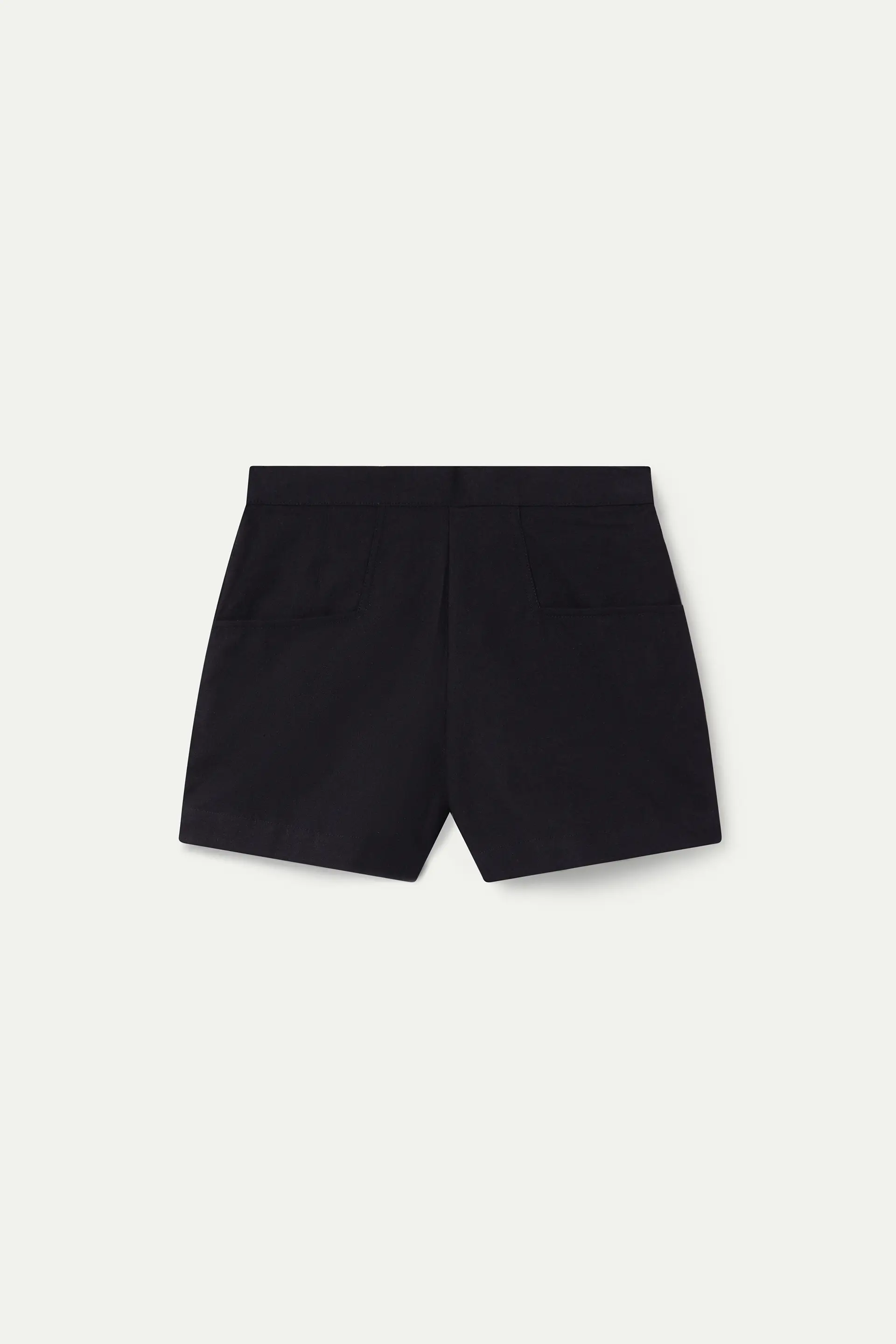 Shorts da bambina in 100% cotone, neri. Vita alta con elastico fisso. Pratiche tasche anteriori. La modella è alta 134 cm e indossa una taglia 8-9 anni.