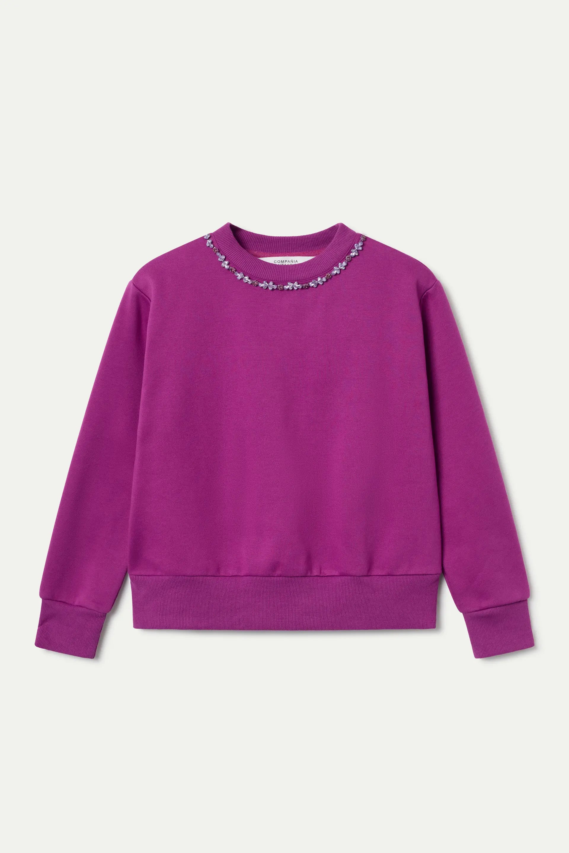 Felpa in pile color magenta con scollo rotondo e maniche lunghe. Dettaglio di perline sullo scollo. Spalle leggermente scese. Rifiniture a costine. La modella è alta 177 cm e indossa una taglia S.