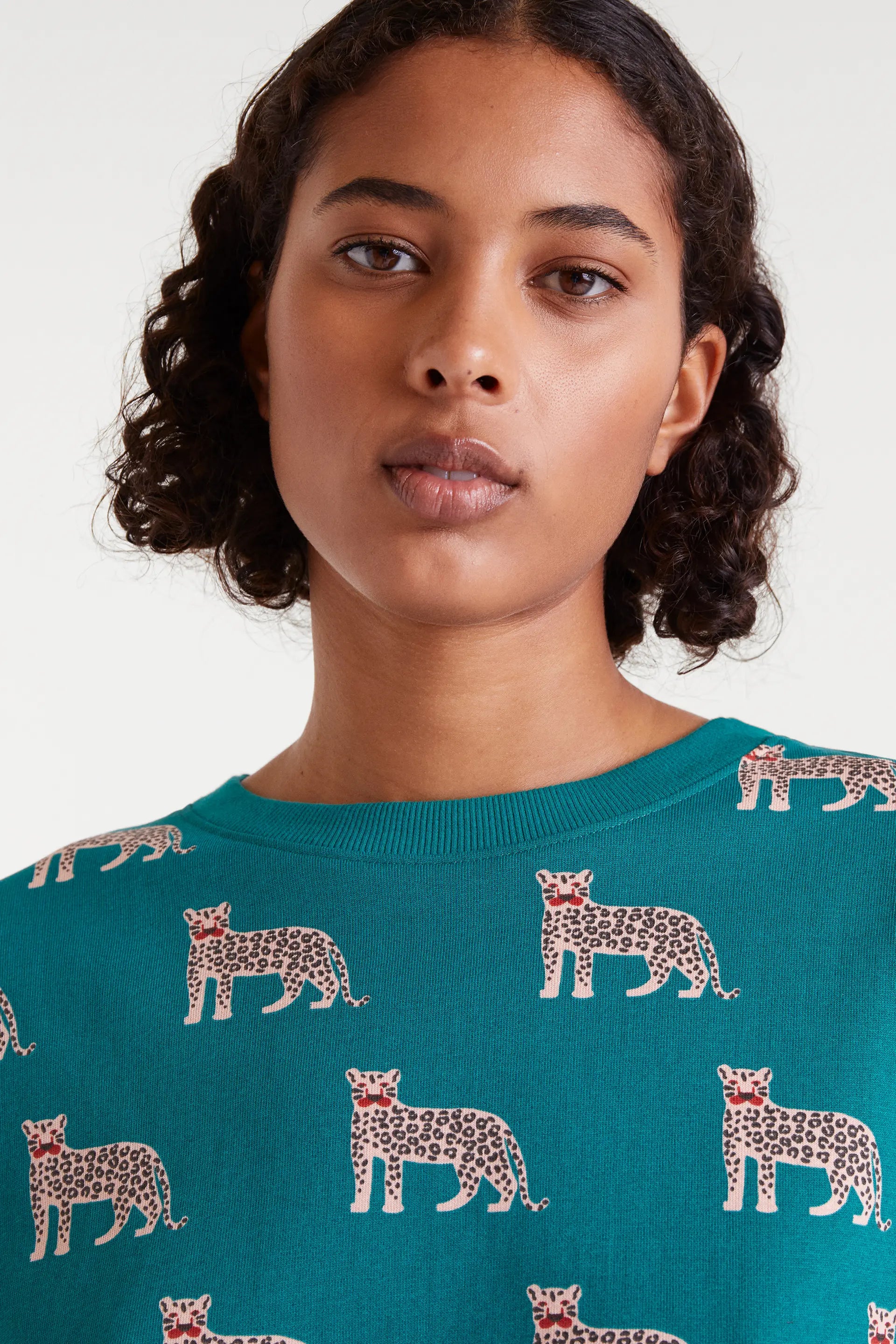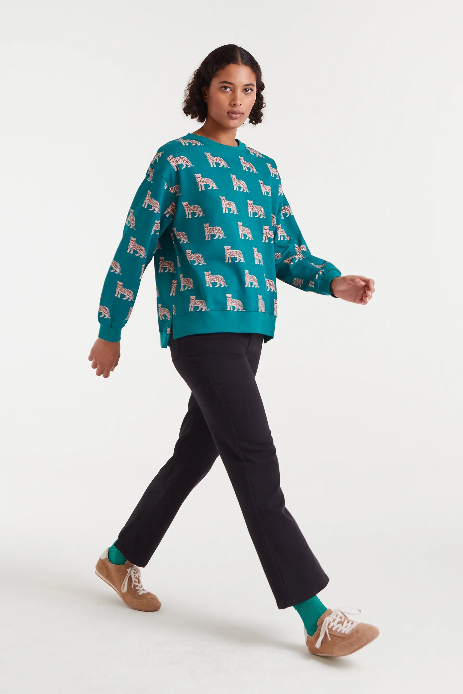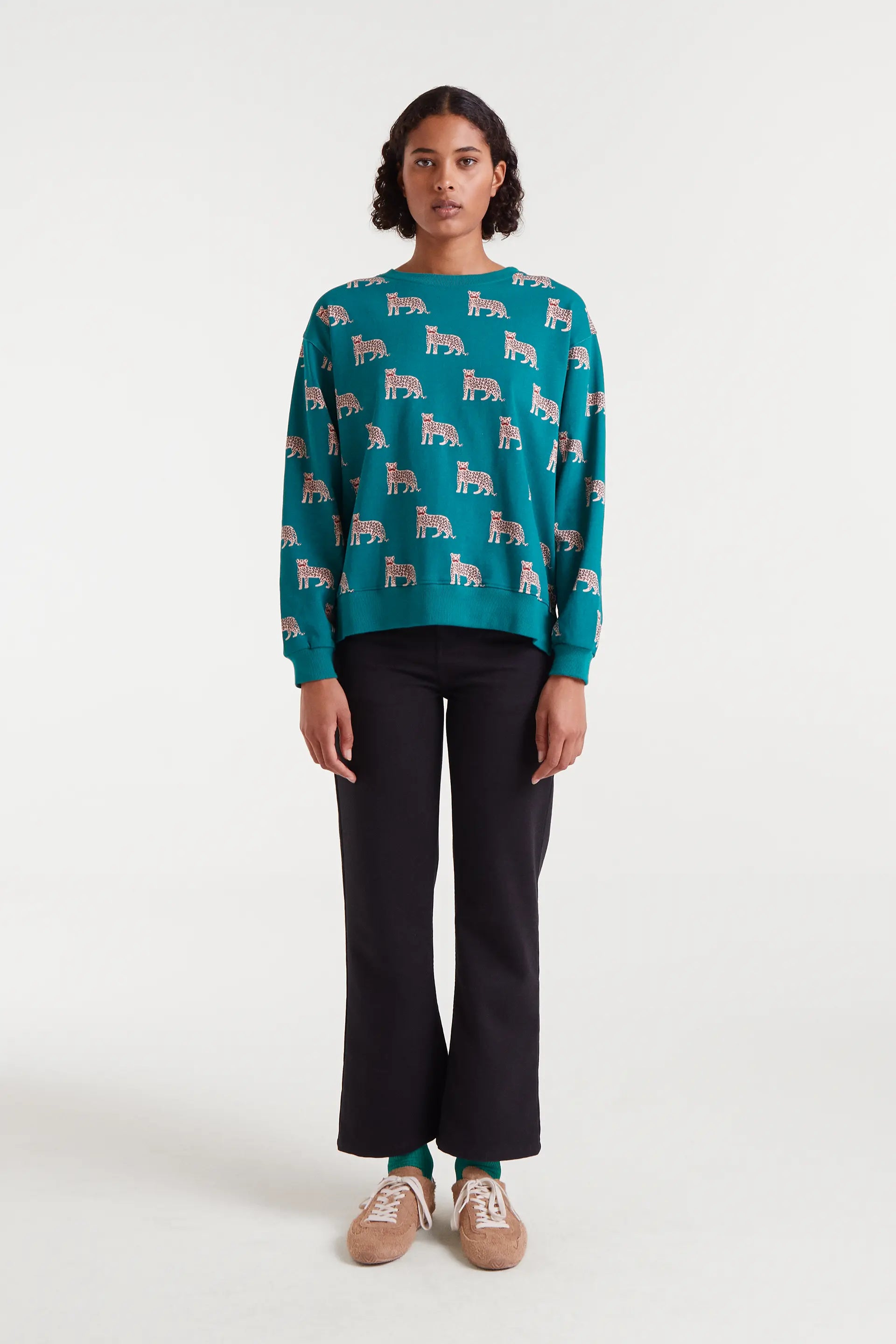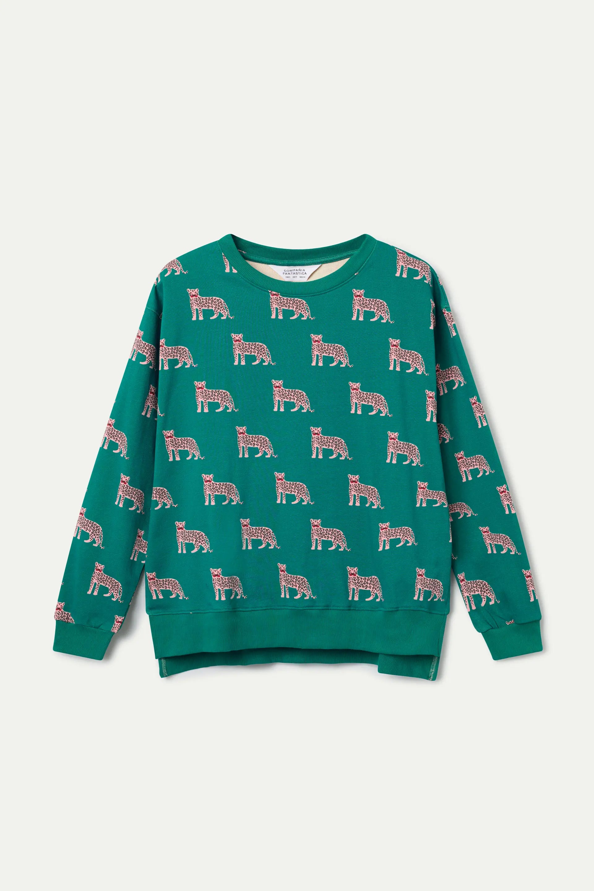 Felpa 100% cotone con stampa Onca. Girocollo e maniche lunghe. Orlo asimmetrico con spacchi laterali. Dettagli a costine. La modella è alta 175 cm e indossa una taglia S.